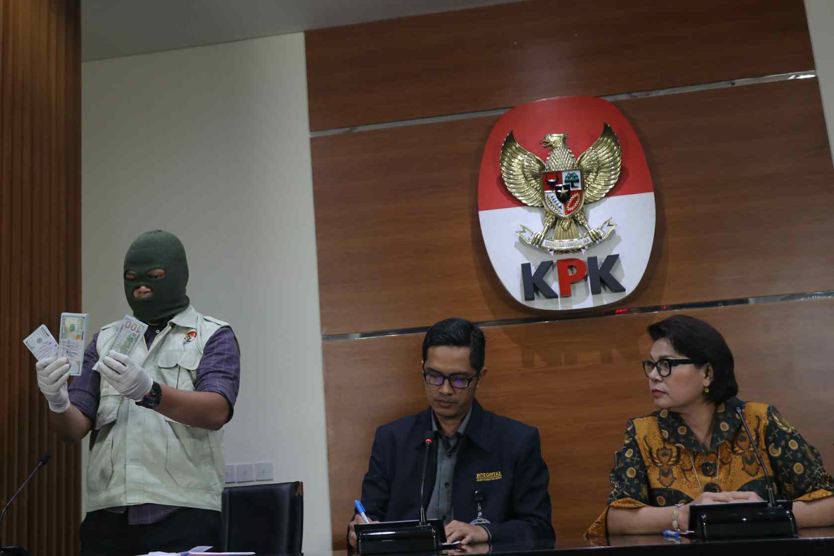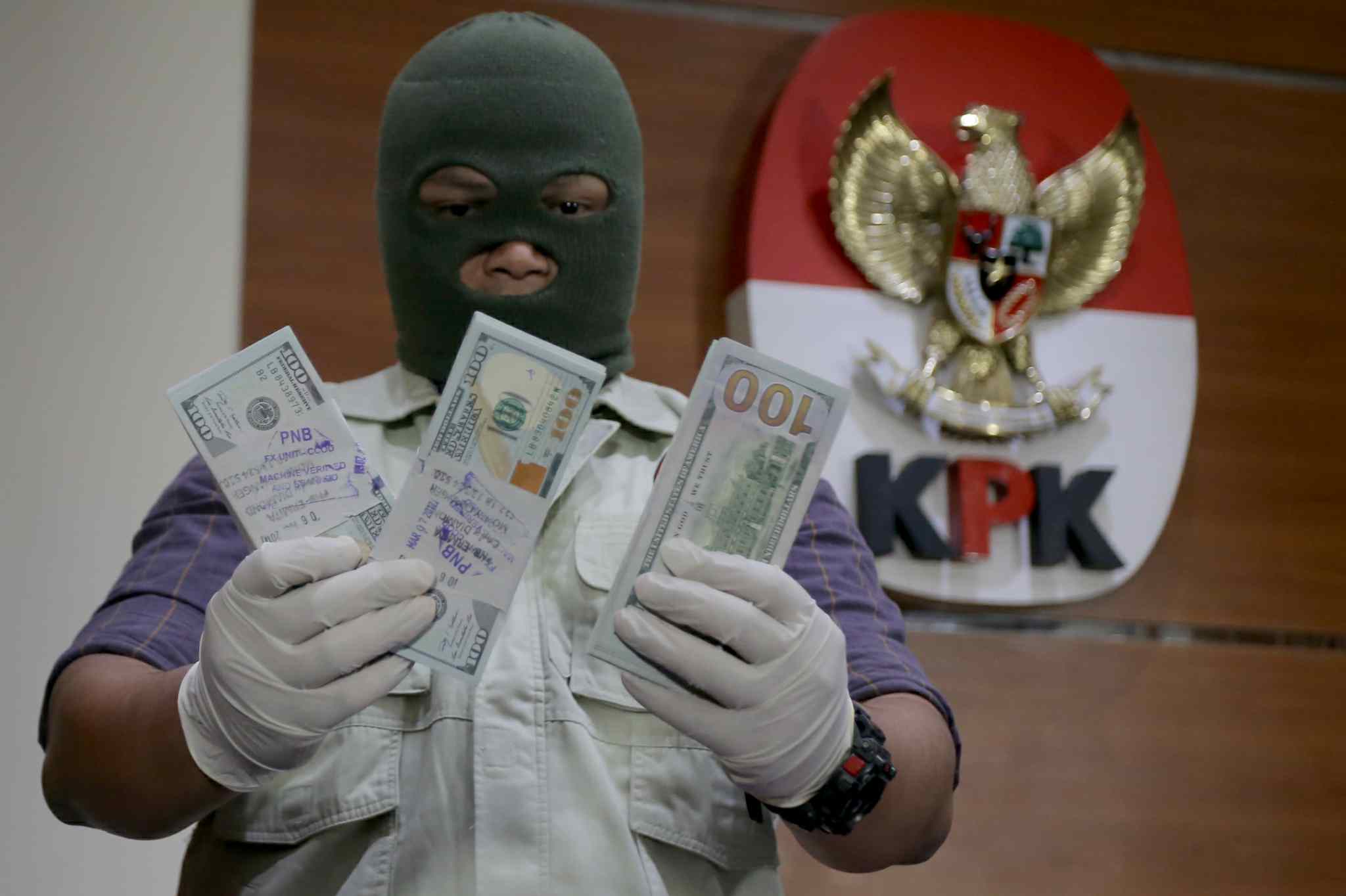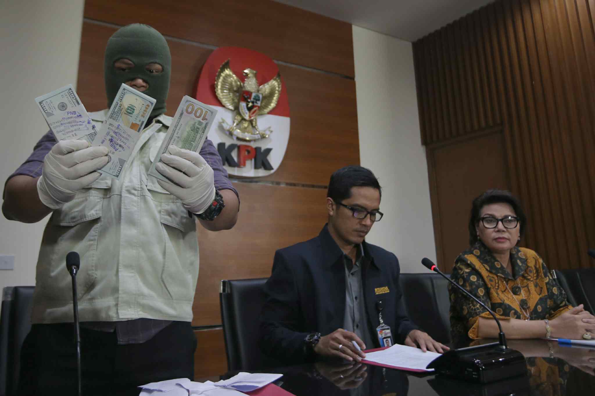 Petugas Komisi Pemberantasan Korupsi (KPK) menunjukkan barang bukti operasi tangkap tangan PT PAL di Gedung KPK, Jakarta, Jumat (31/3/2017). KPK mengamankan barang bukti senilai $25.000 USD yang merupakan fee agent atas kerjasama pembelian kapal perang SSV oleh Pemerintah Filipina. AKTUAL/Tino Oktaviano