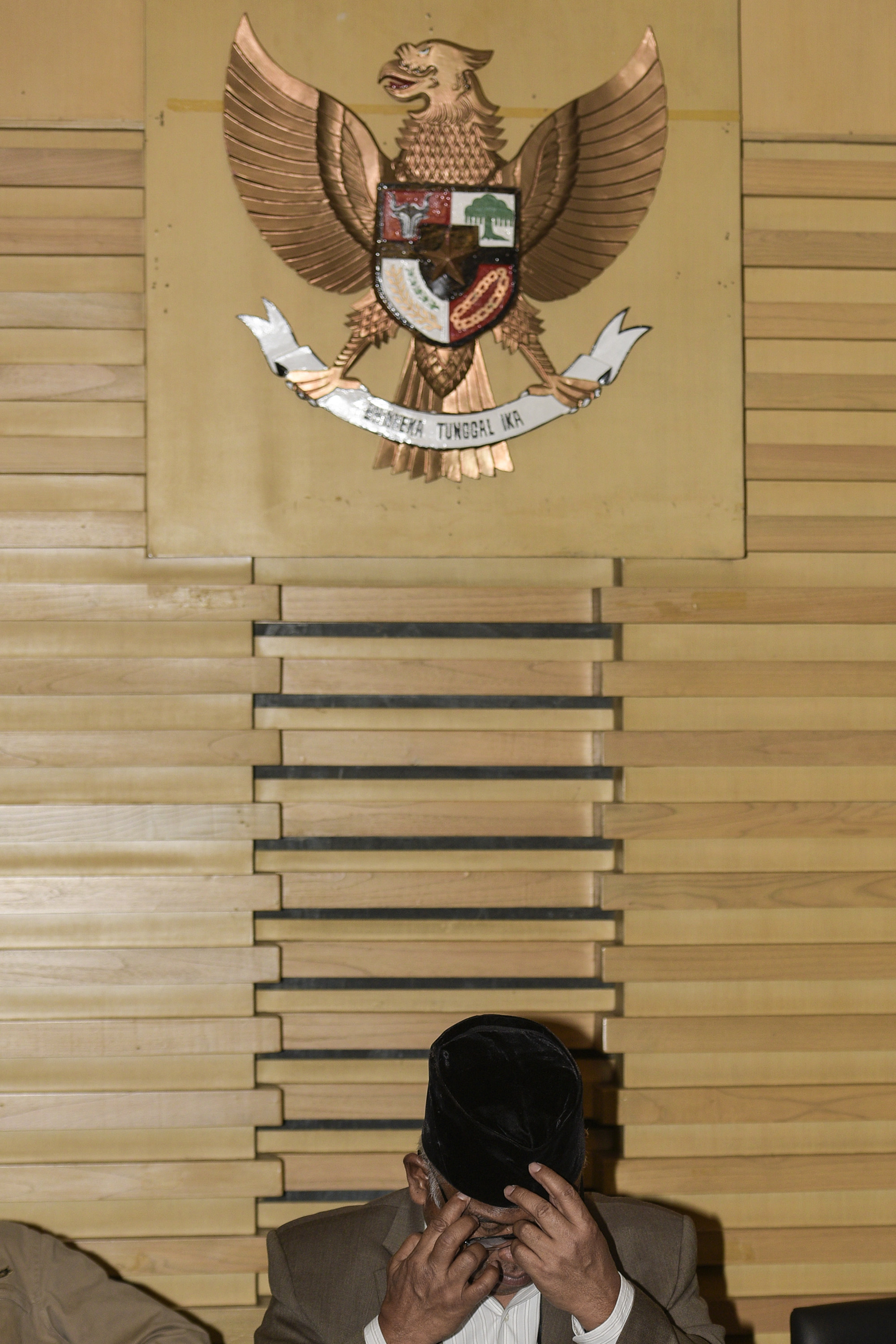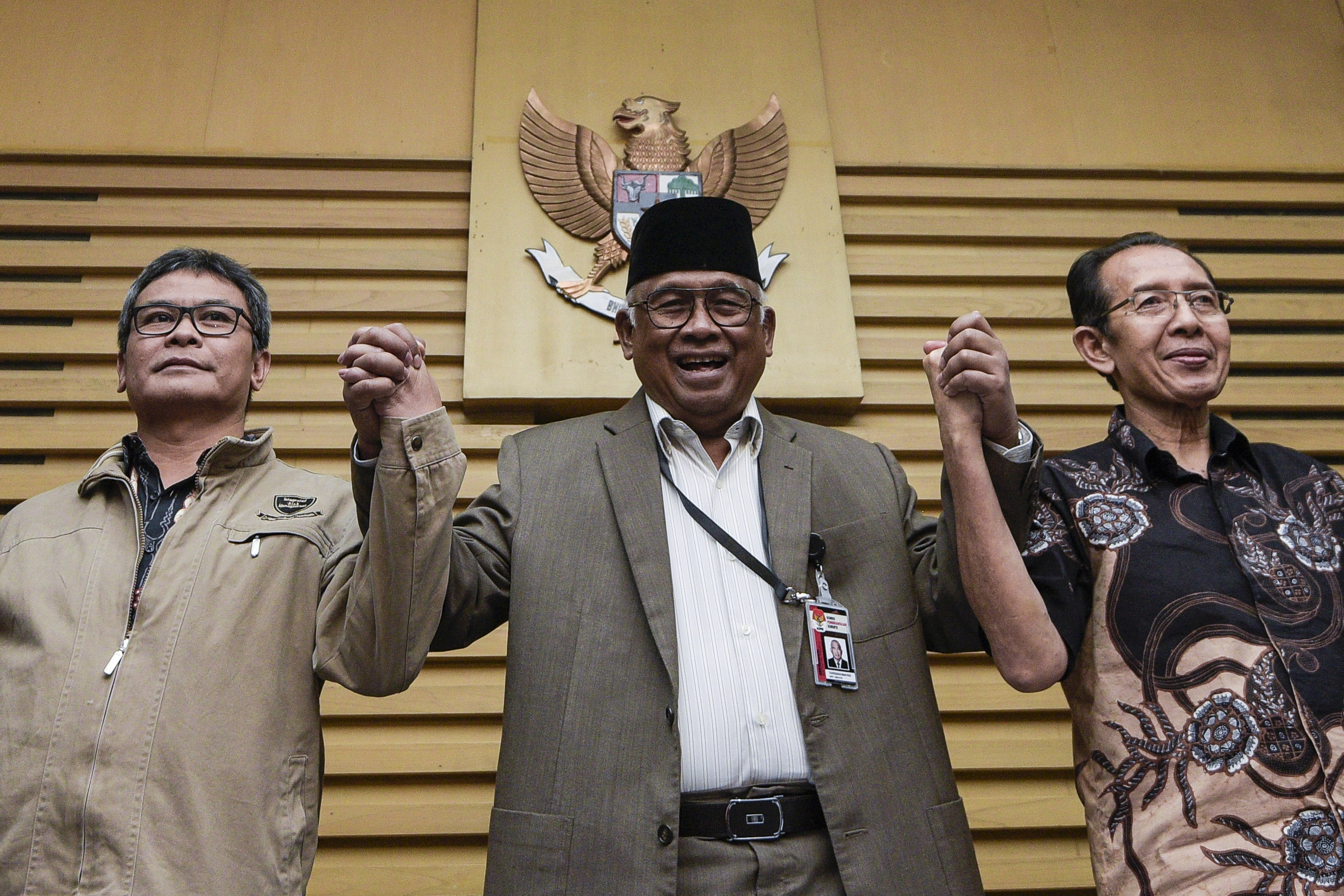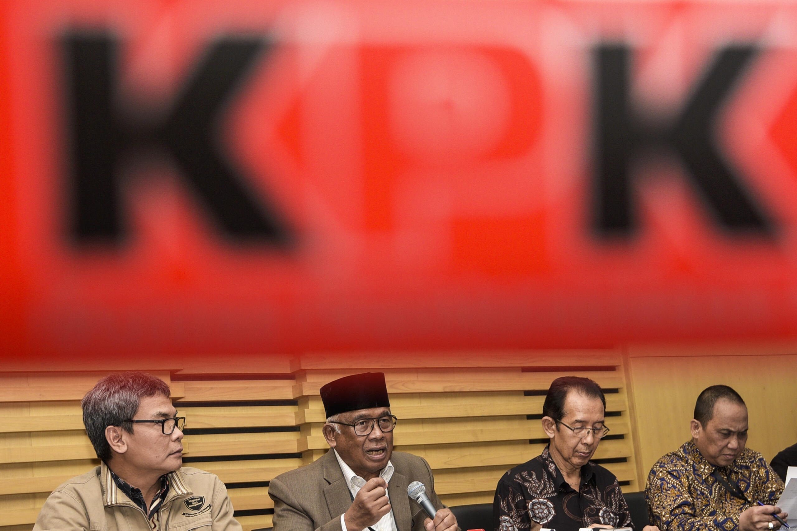 Plt Ketua KPK Taufiqurachman Ruki (kiri) didampingi Wakil Ketua Zulkarnain (tengah) dan Plt Wakil Ketua Indriyanto Seno Adji (kanan) memberikan keterangan pers terkait revisi Undang-Undang KPK di Gedung KPK, Jakarta, Rabu (7/10). KPK menyatakan menolak draf revisi Undang-Undang KPK yang diusulkan dalam Program Legislasi Nasional (Prolegnas) 2015 oleh DPR karena dinilai semakin melemahkan kinerja lembaga antirasuah itu. ANTARA FOTO/Sigid Kurniawan/foc/15.