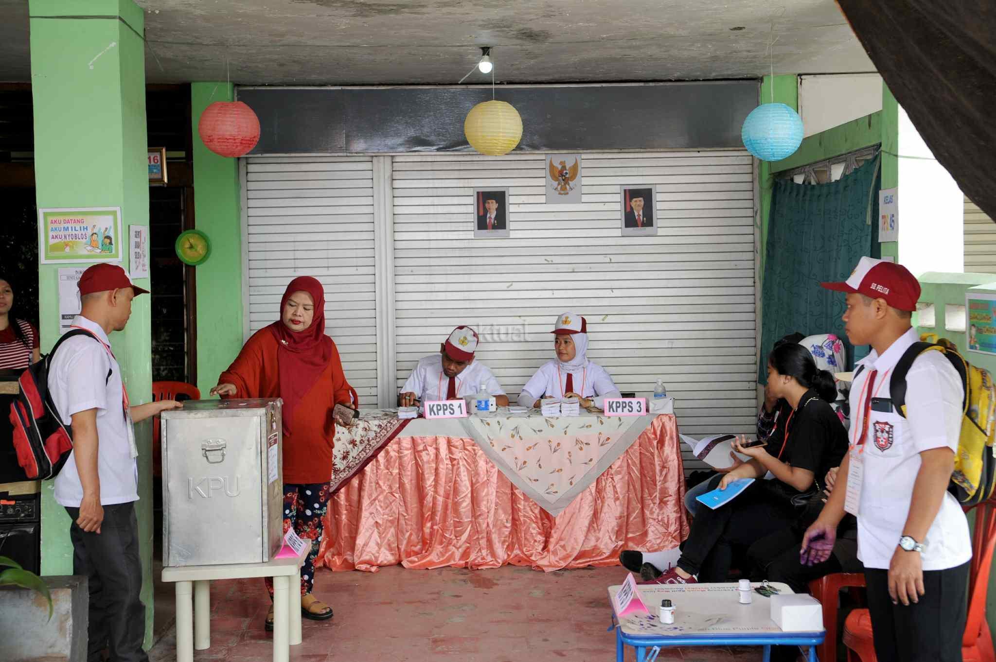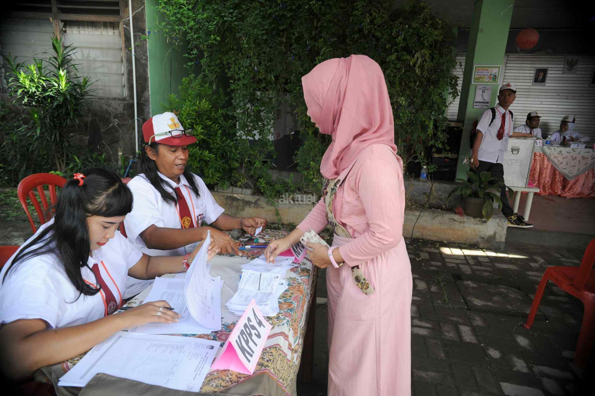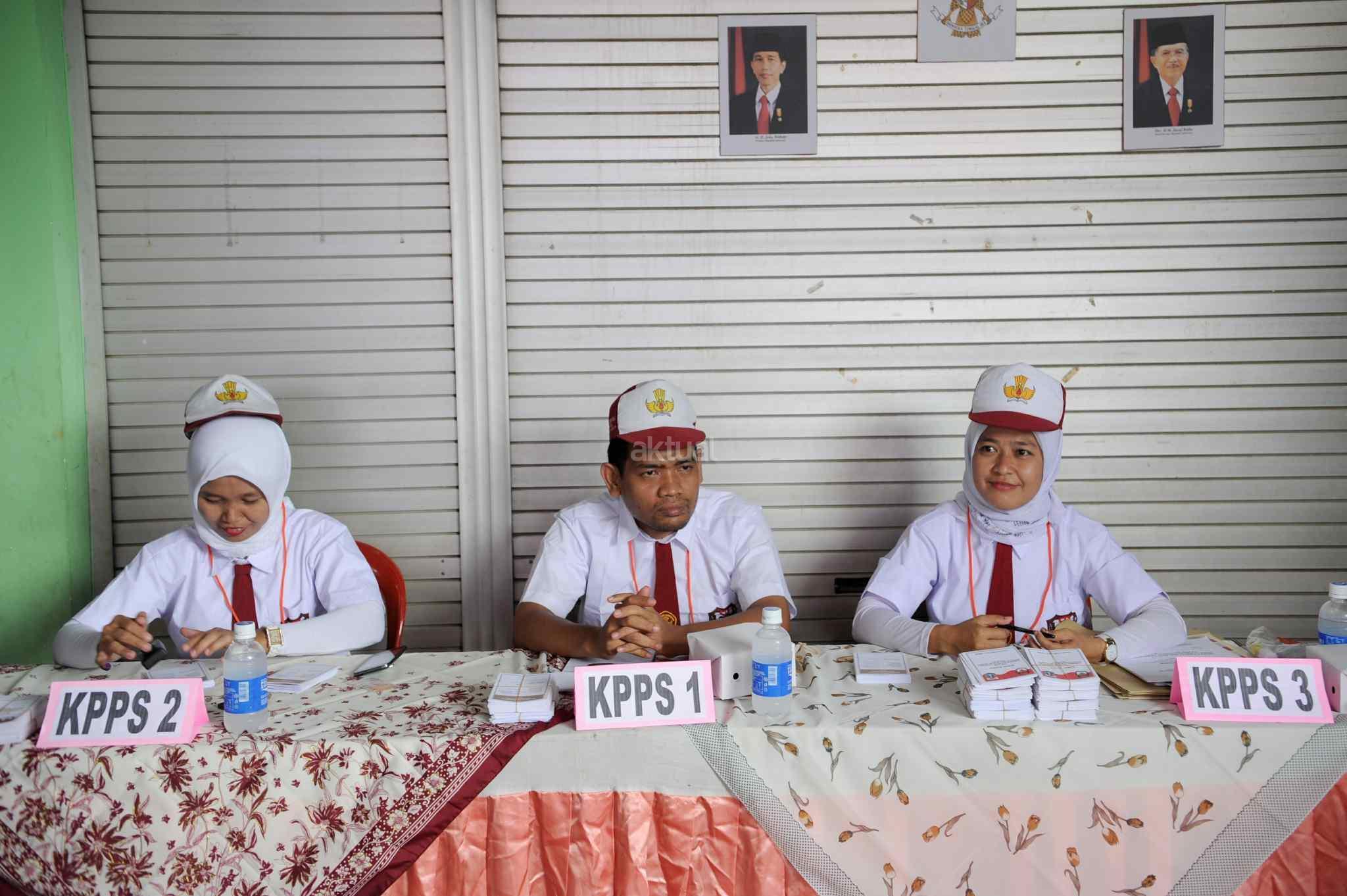 Petugas KPPS berseragam sekolah dasar melakukan kegiatan pelaksanaan Pilkada DKI di TPS 45, Cawang, Jakarta, Rabu (15/2). TPS unik ini dibuat seperti suasana sekolah untuk menarik minat warga dalam melakukan pemilihan Gubernur DKI Jakarta. AKTUAL/Tino Oktaviano