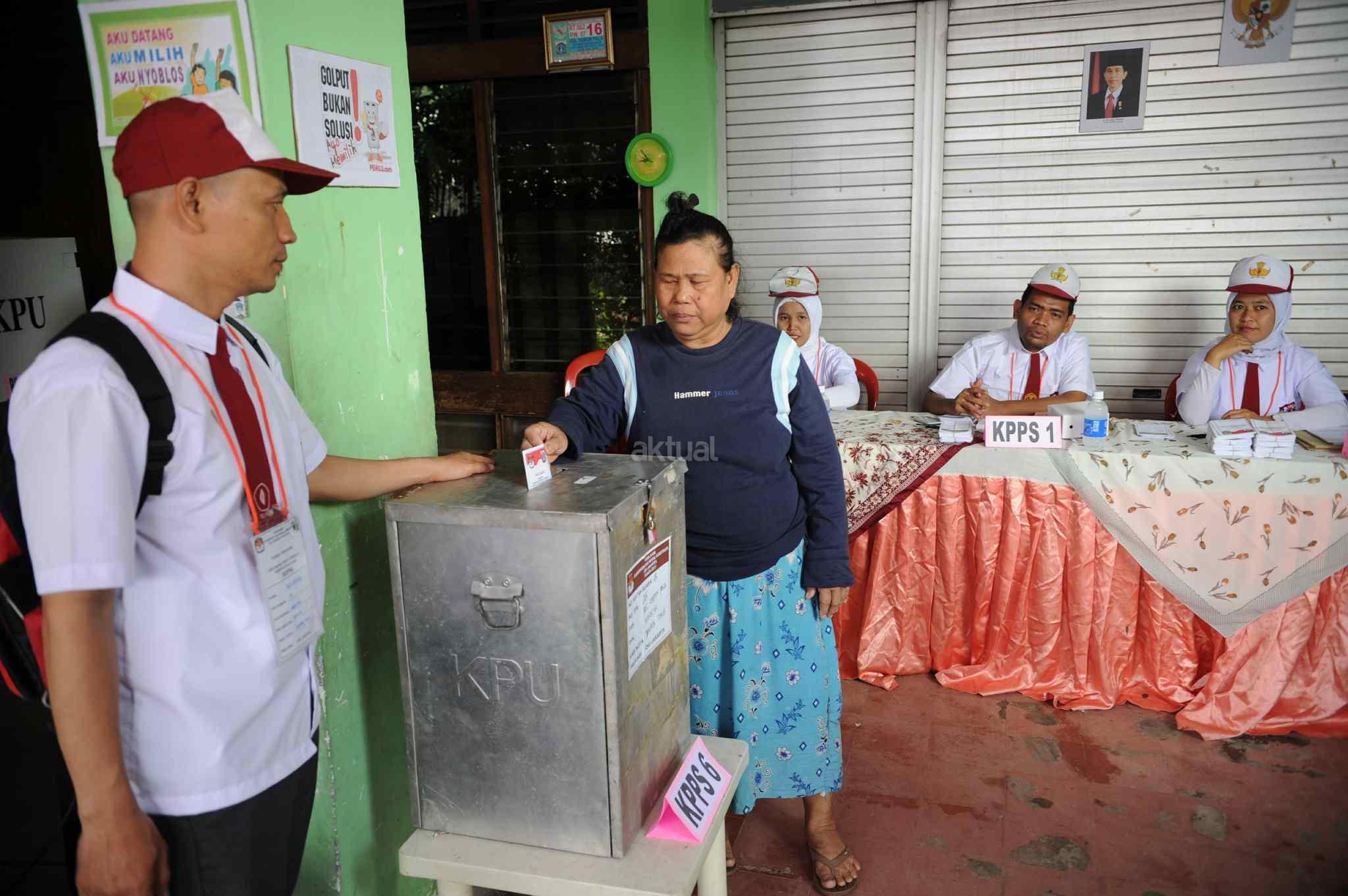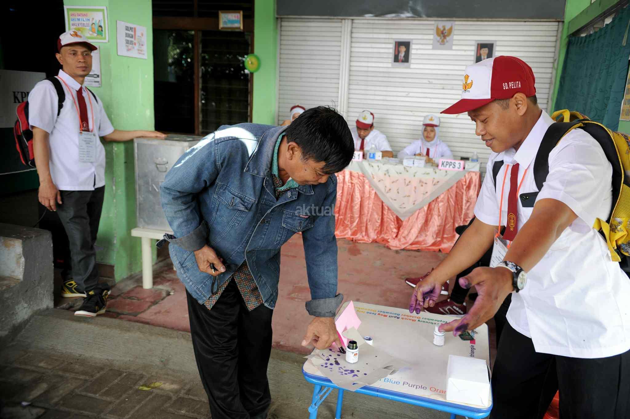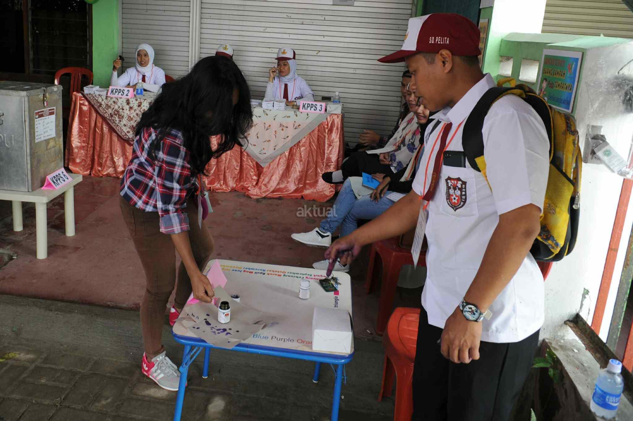 Petugas KPPS berseragam sekolah dasar melakukan kegiatan pelaksanaan Pilkada DKI di TPS 45, Cawang, Jakarta, Rabu (15/2). TPS unik ini dibuat seperti suasana sekolah untuk menarik minat warga dalam melakukan pemilihan Gubernur DKI Jakarta. AKTUAL/Tino Oktaviano