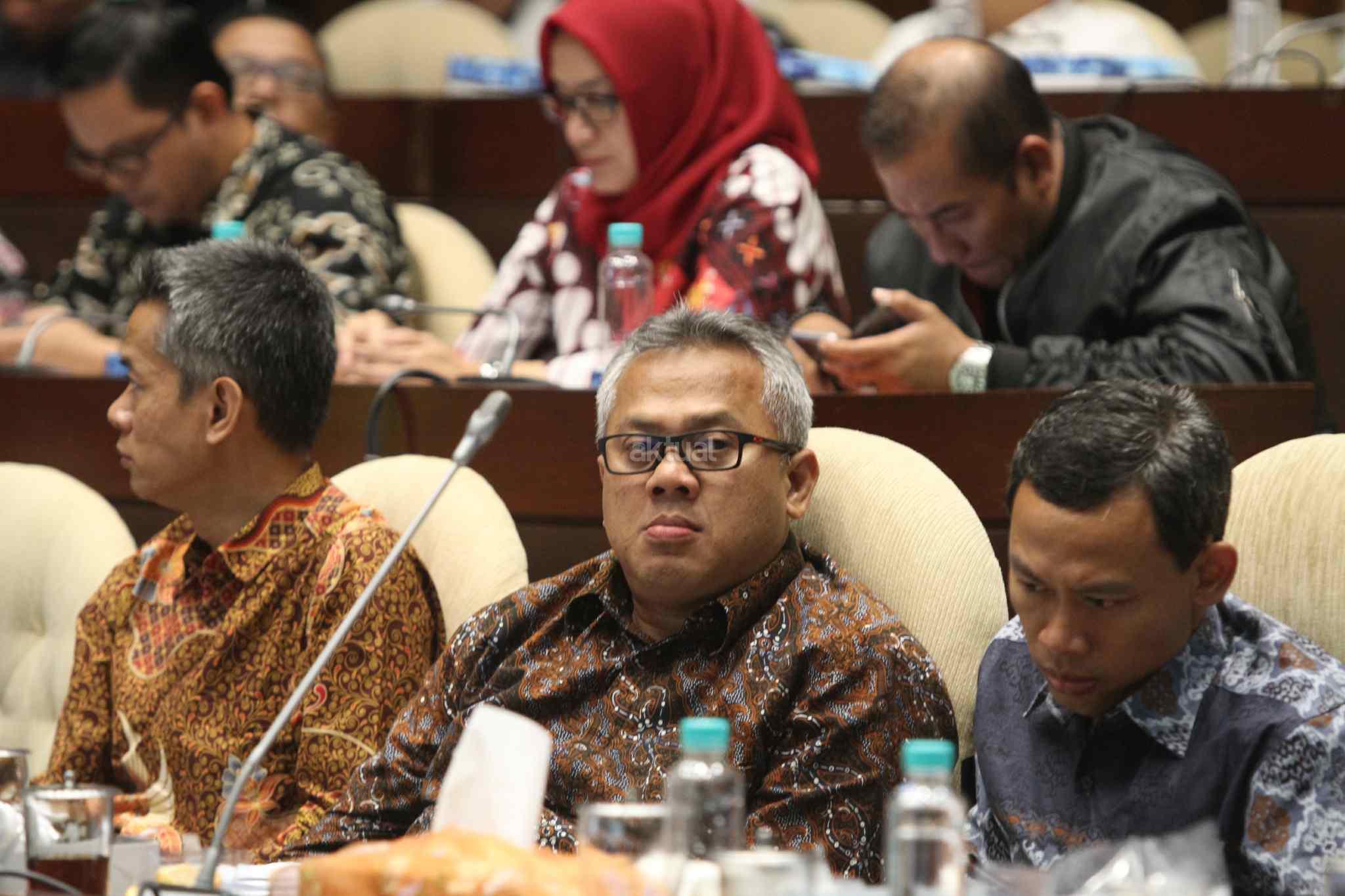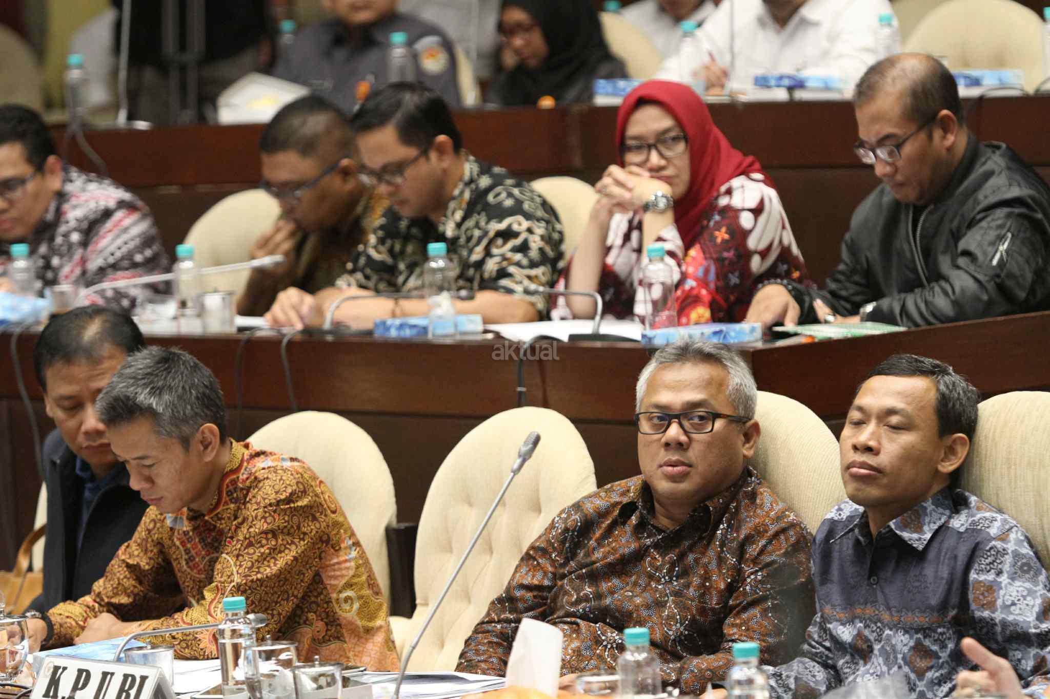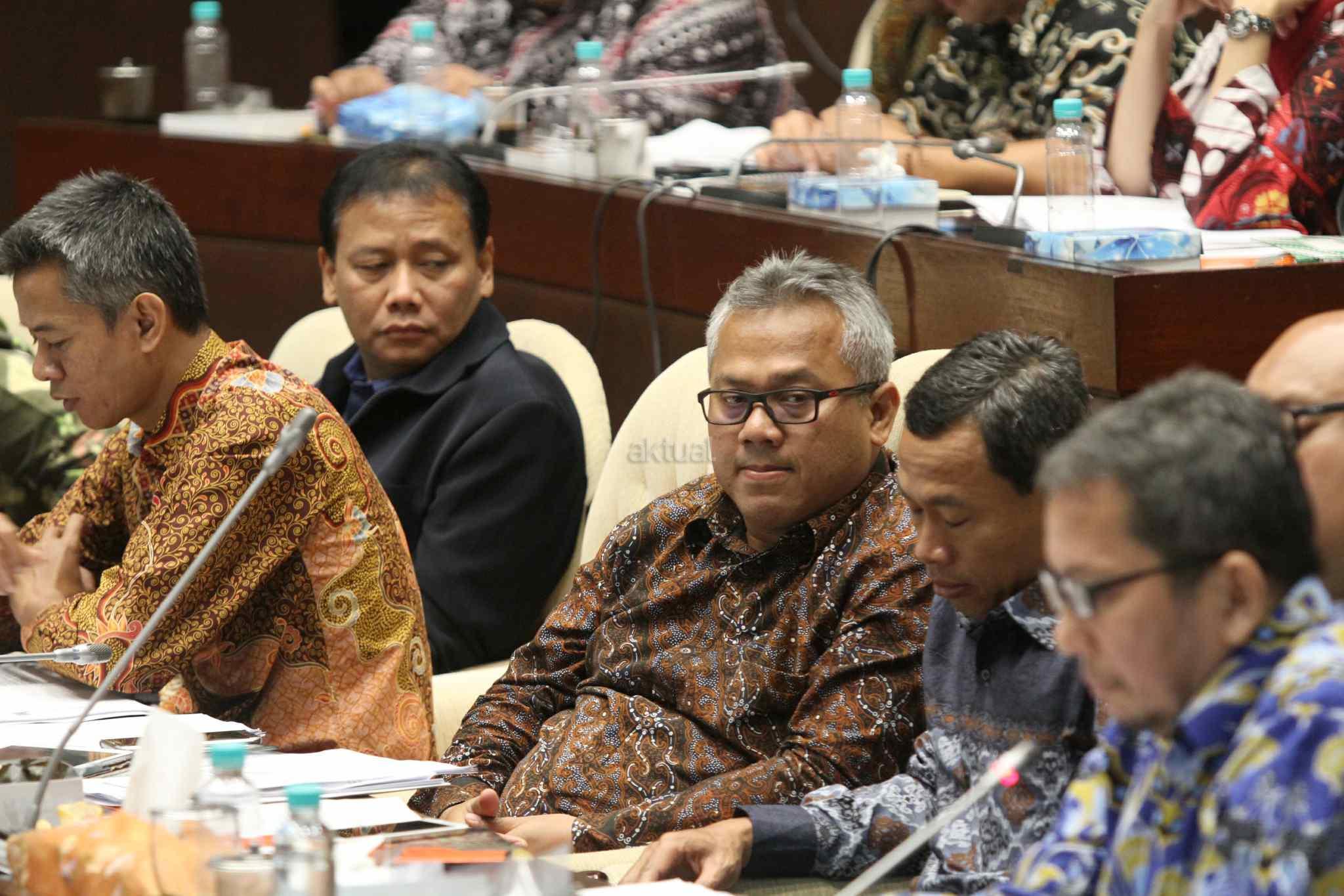 Ketua Komisi Pemilihan Umum (KPU) Arief Budiman didampingi komisioner KPU dan jajaran Bawaslu juga Ombusman RI saat rapat dengar pendapat dengan Komisi II DPR, di gedung Parlemen, Senayan, Jakarta, Selasa (25/4). Rapat yang dipimpin oleh Wakil Ketua Komisi II Ahmad Riza Patria ini untuk mendengarkan kesiapan Pilkada 2018. Selain itu laporan perkembangan rencana anggaran biaya, rencana kebutuhan biaya Pilkada serentak 2018, menunjukkan total usulan anggaran kepada pemerintah daerah sampai 28 Maret 2017 sebanyak Rp 11,3 triliun. AKTUAL/Tino Oktaviano