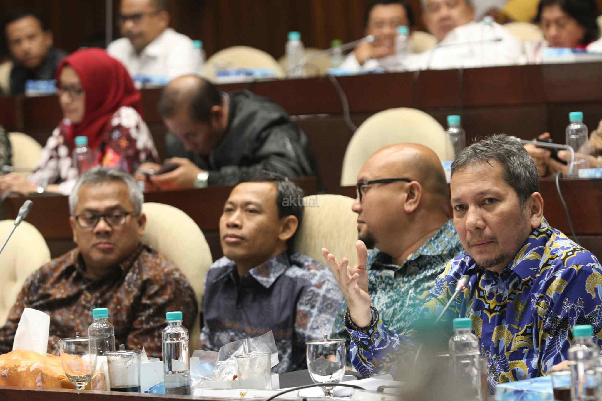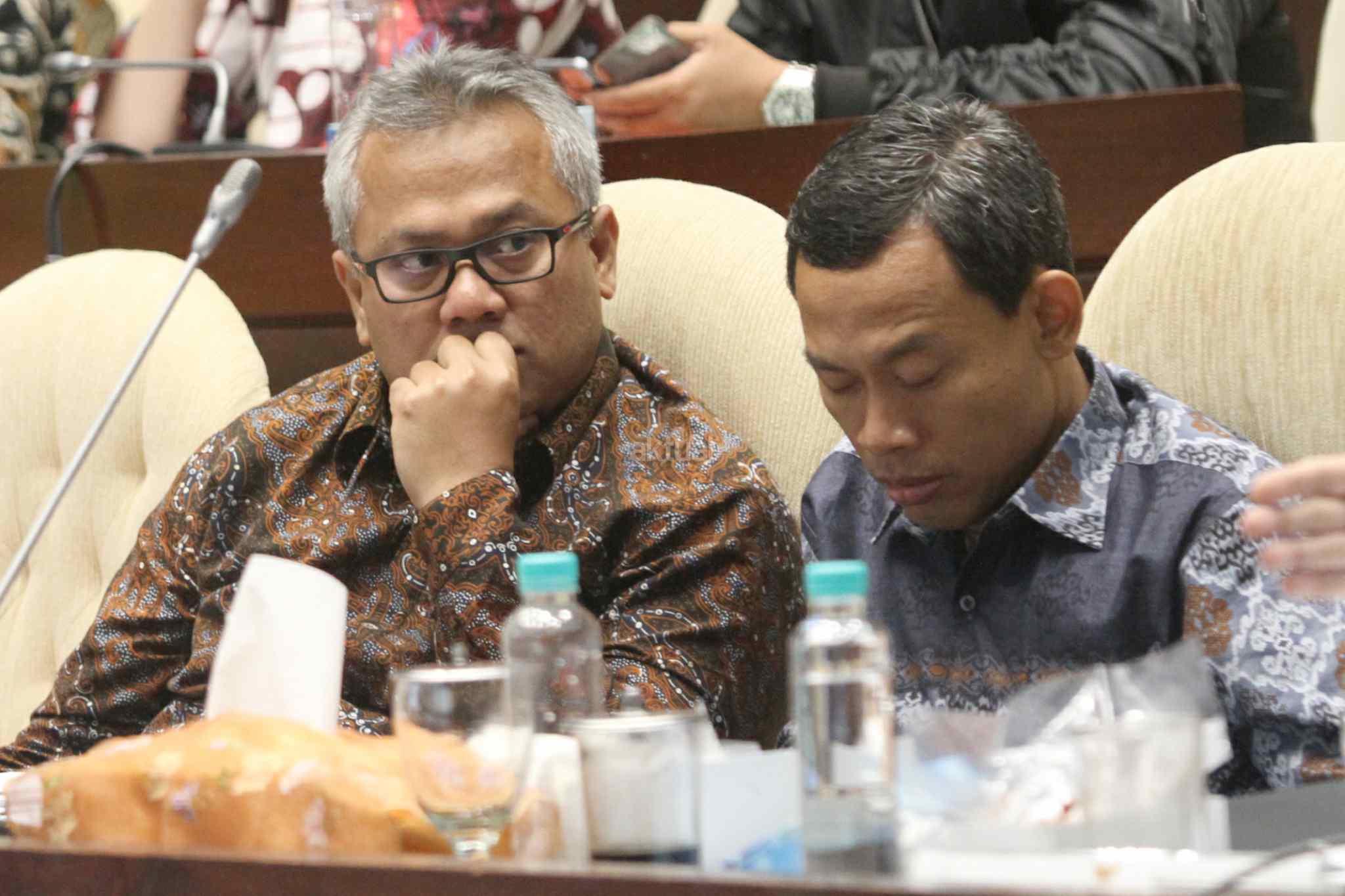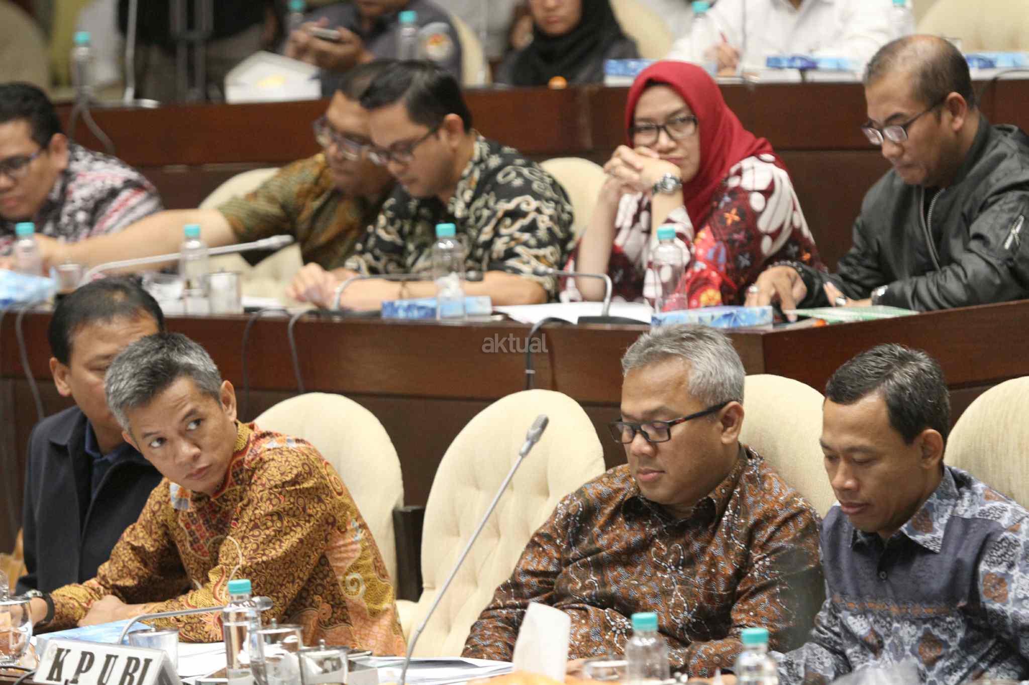 Ketua Komisi Pemilihan Umum (KPU) Arief Budiman didampingi komisioner KPU dan jajaran Bawaslu juga Ombusman RI saat rapat dengar pendapat dengan Komisi II DPR, di gedung Parlemen, Senayan, Jakarta, Selasa (25/4). Rapat yang dipimpin oleh Wakil Ketua Komisi II Ahmad Riza Patria ini untuk mendengarkan kesiapan Pilkada 2018. Selain itu laporan perkembangan rencana anggaran biaya, rencana kebutuhan biaya Pilkada serentak 2018, menunjukkan total usulan anggaran kepada pemerintah daerah sampai 28 Maret 2017 sebanyak Rp 11,3 triliun. AKTUAL/Tino Oktaviano