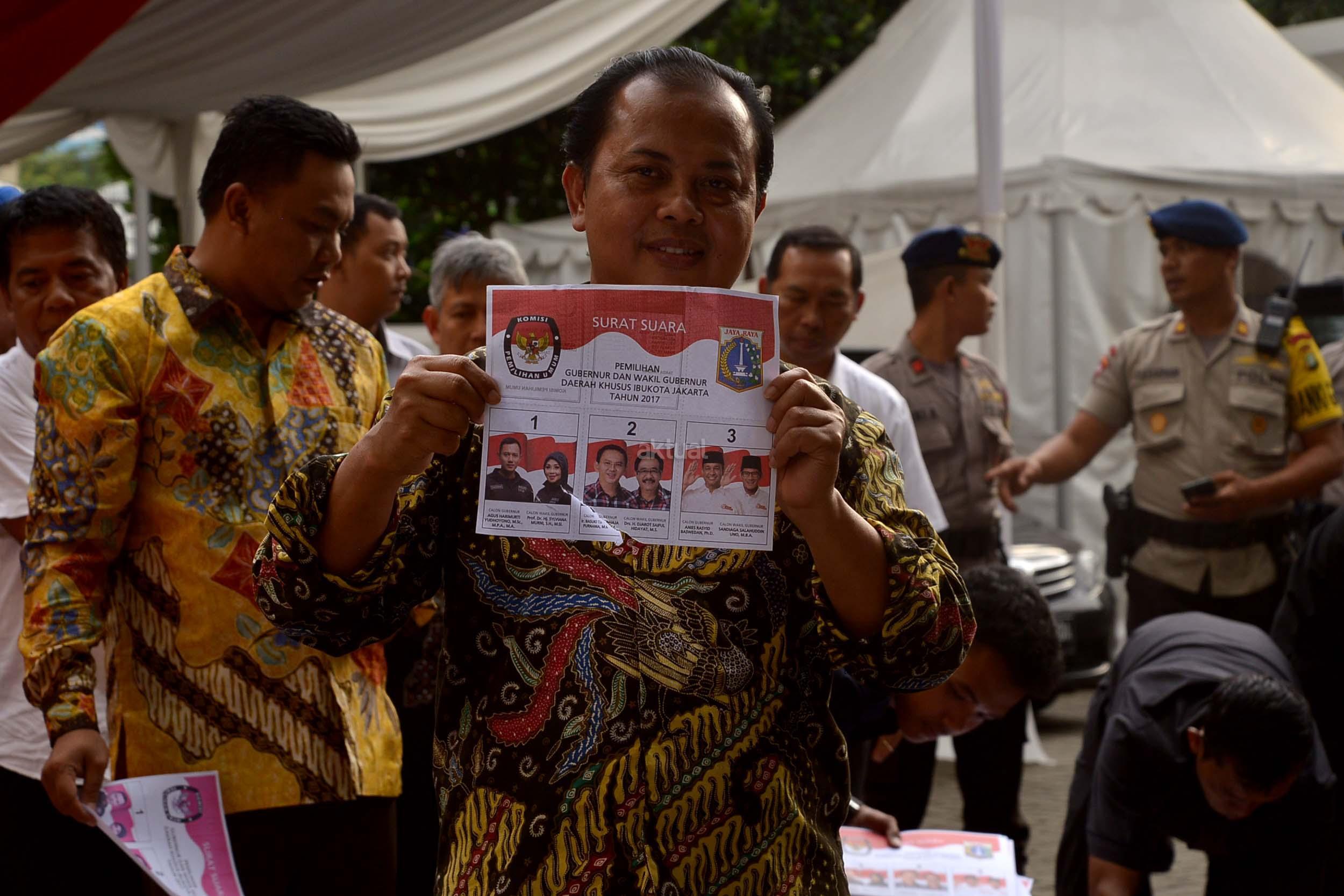 Ketua KPU Provinsi DKI Jakarta Sumarno menunjukan salah satu kertas suara yang rusak saat pemusnahan surat suara di kantor KPU Provinsi DKI Jakarta, Selasa (14/2/2017). Sehari jelang pencoblosan, KPU Provinsi DKI Jakarta memusnahkan 46.628 kelebihan surat suara dan 22.444 surat suara rusak atau cacat guna menghindari kecurangan atau disalahgunakan dalam Pilgub DKI pada Rabu (15/2). AKTUAL/Munzir