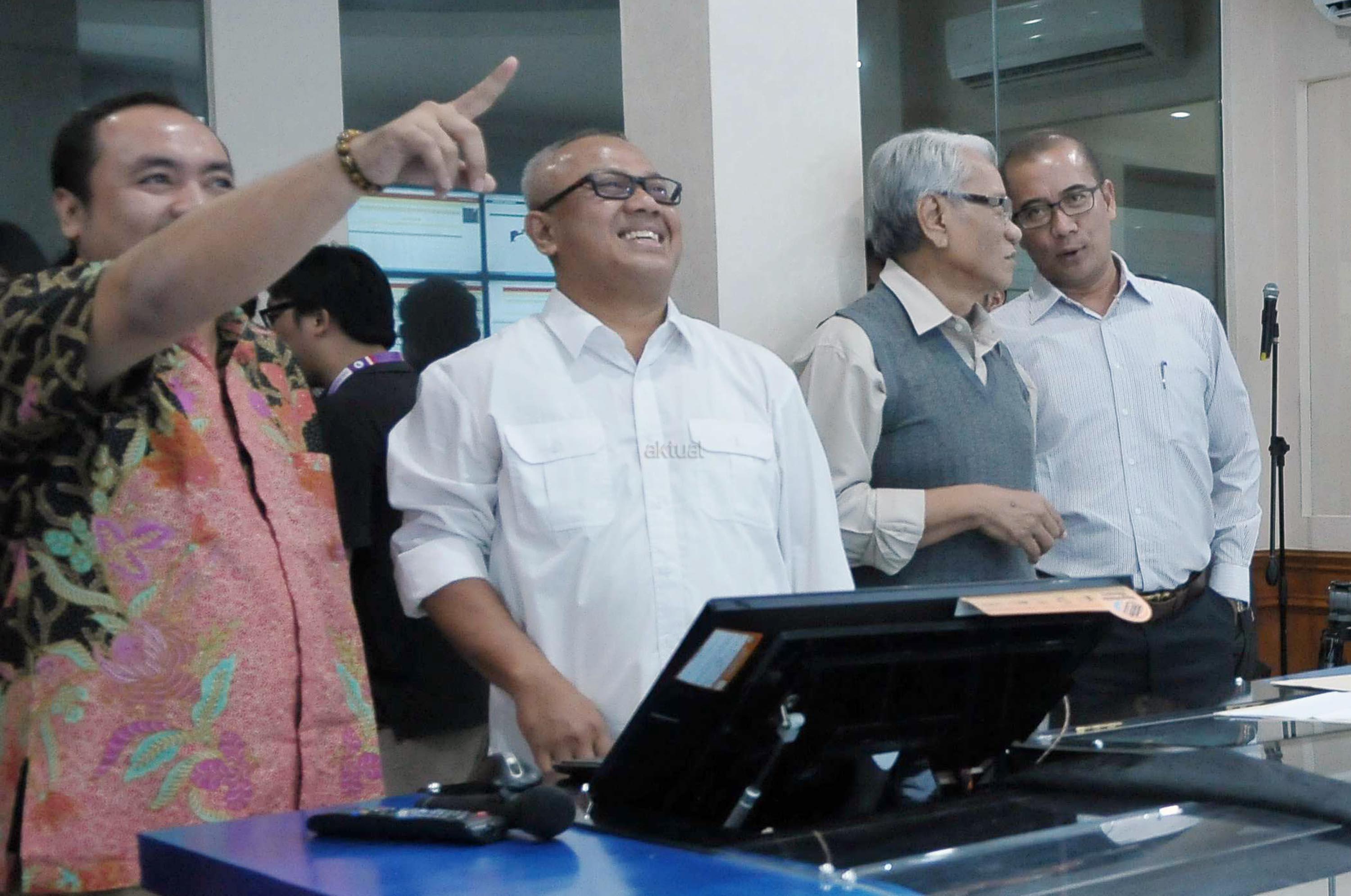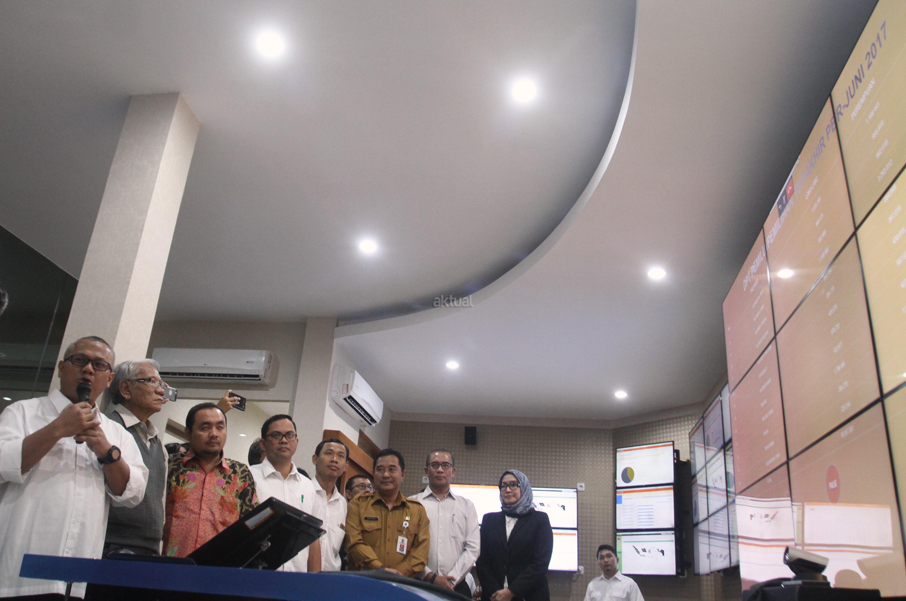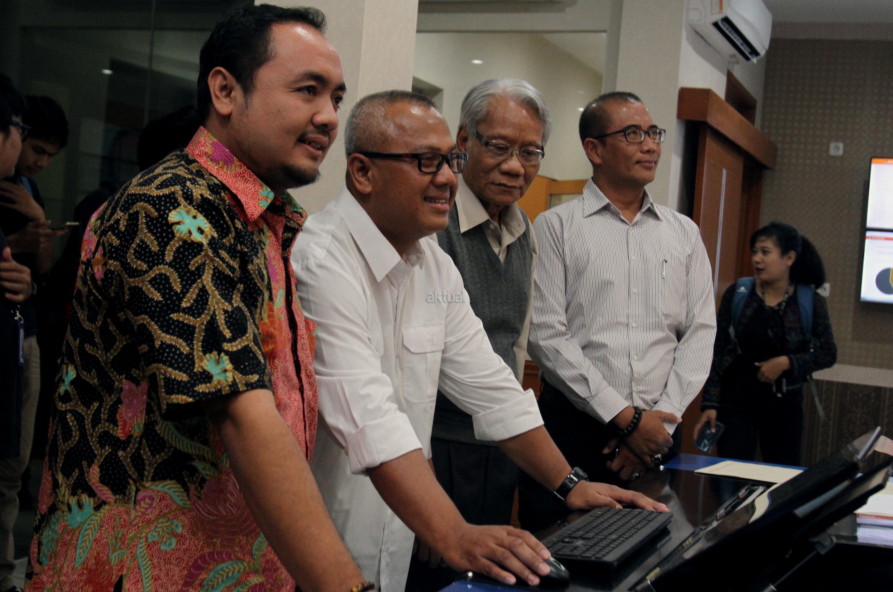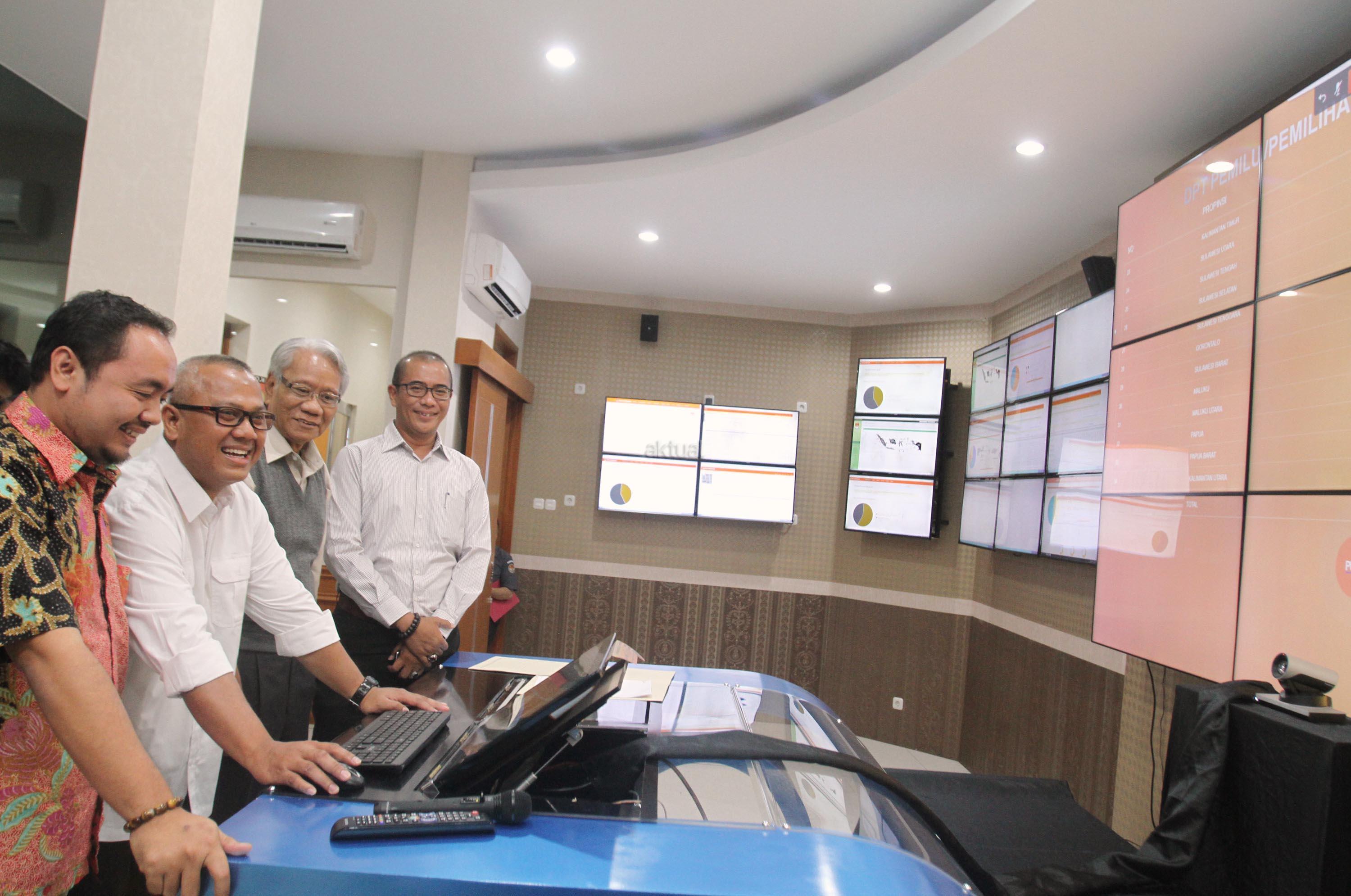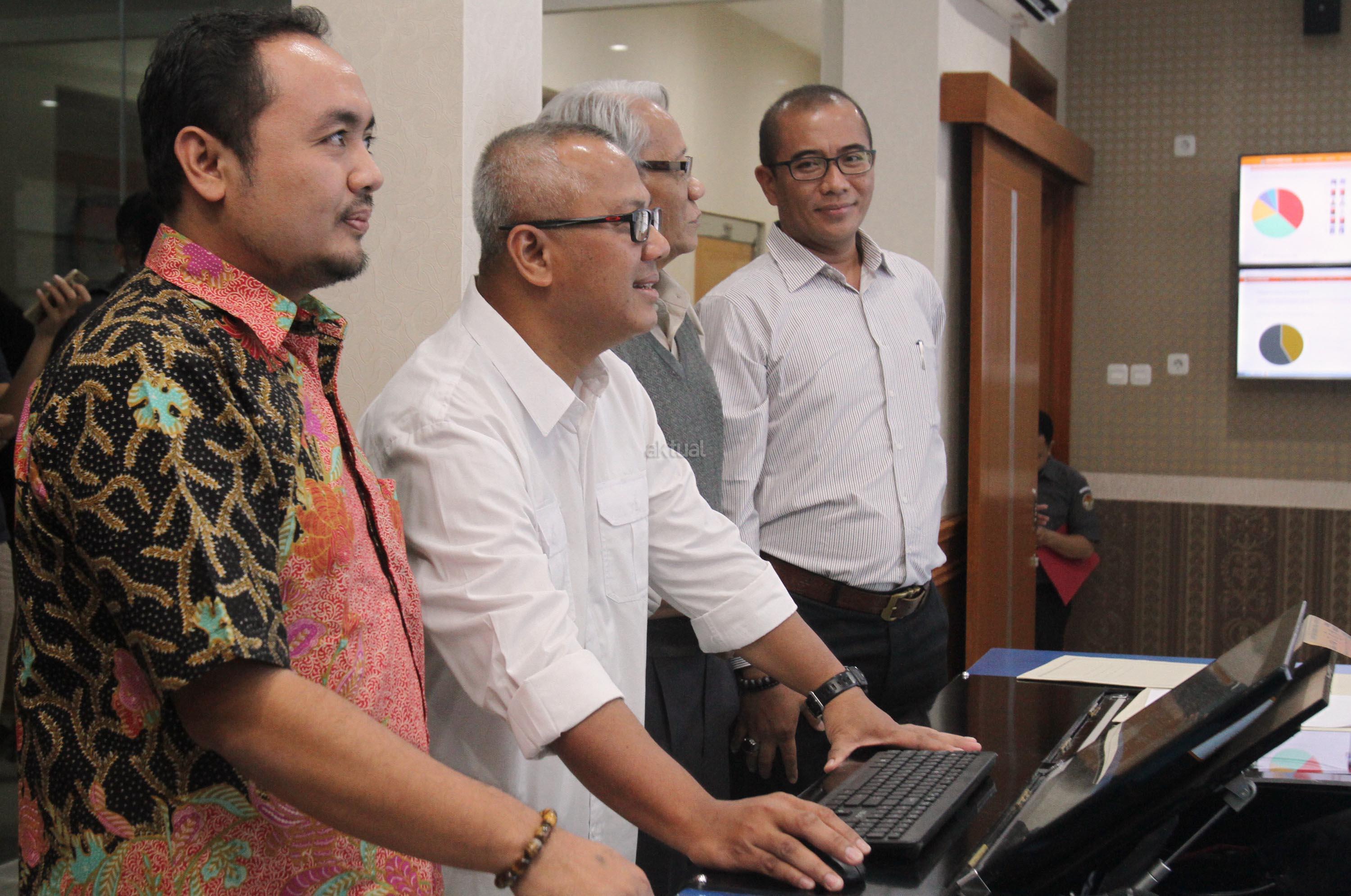 Ketua KPU Arief Budiman (kedua kiri) bersama Anggota Bawaslu Mochammad Afifuddin (kiri), Ketua DKPP Harjono (kedua kanan) dan Komisioner KPU Hasyim Asy'ari (kanan) memerhatikan monitor operation room saat peluncuran Sistem Informasi Data Pemilih (Sidalih) di Gedung KPU, Jakarta, Selasa (11/7/2017). Sidalih merupakan salah satu aplikasi yang digunakan KPU untuk mempermudah jajarannya dalam melakukan pendataan dan pemutakhiran data pemilih. AKTUAL/Munzir