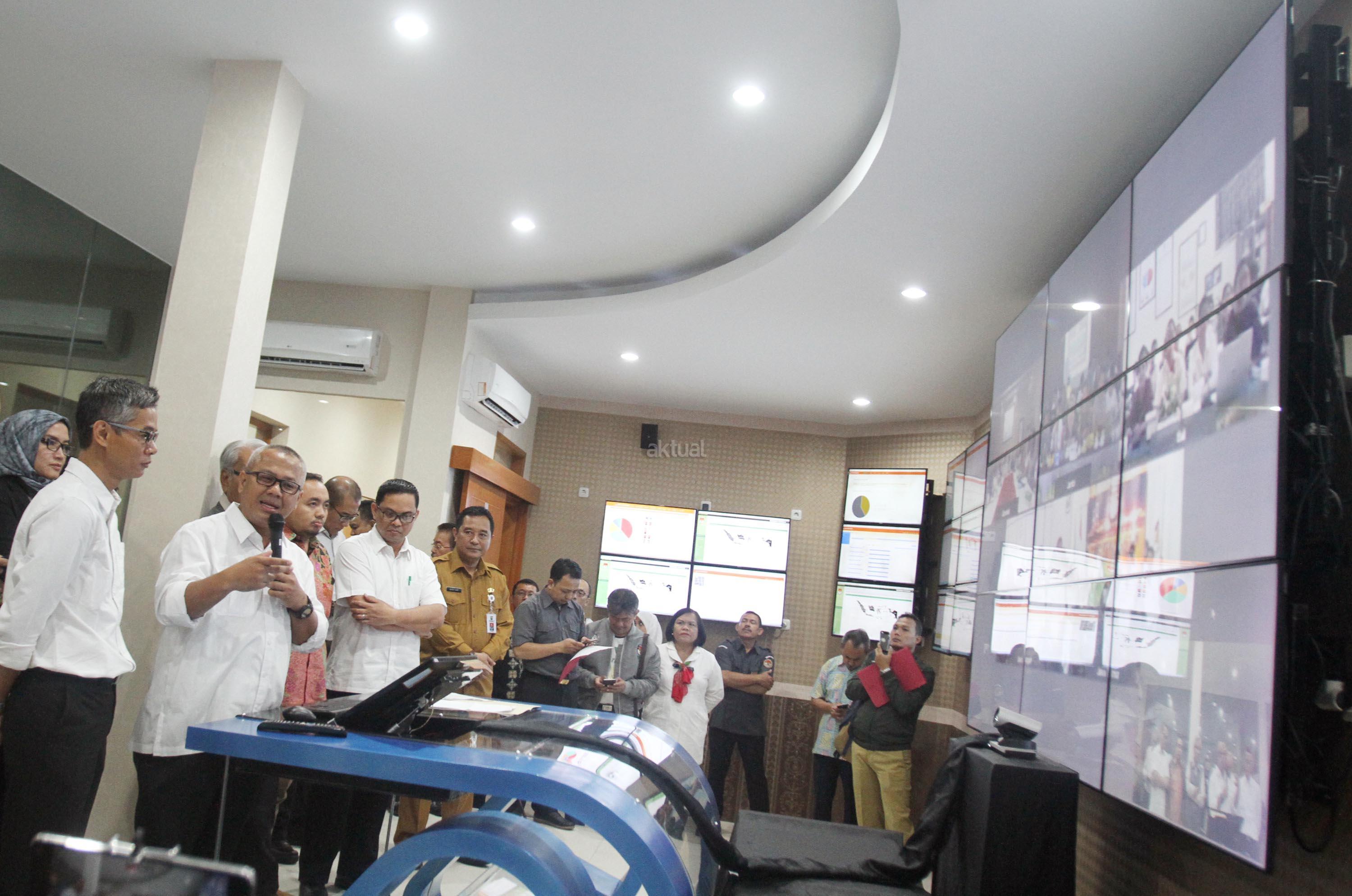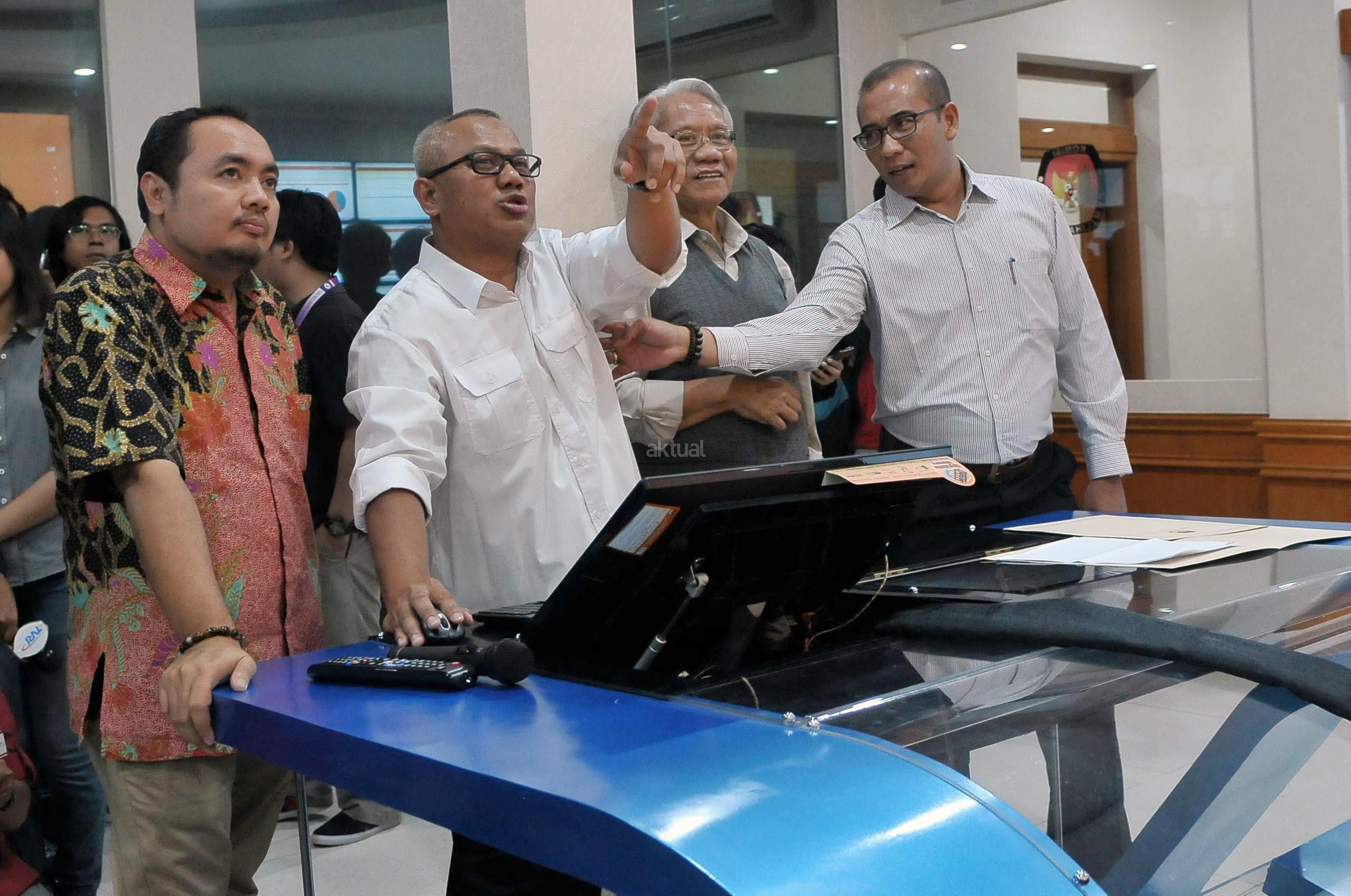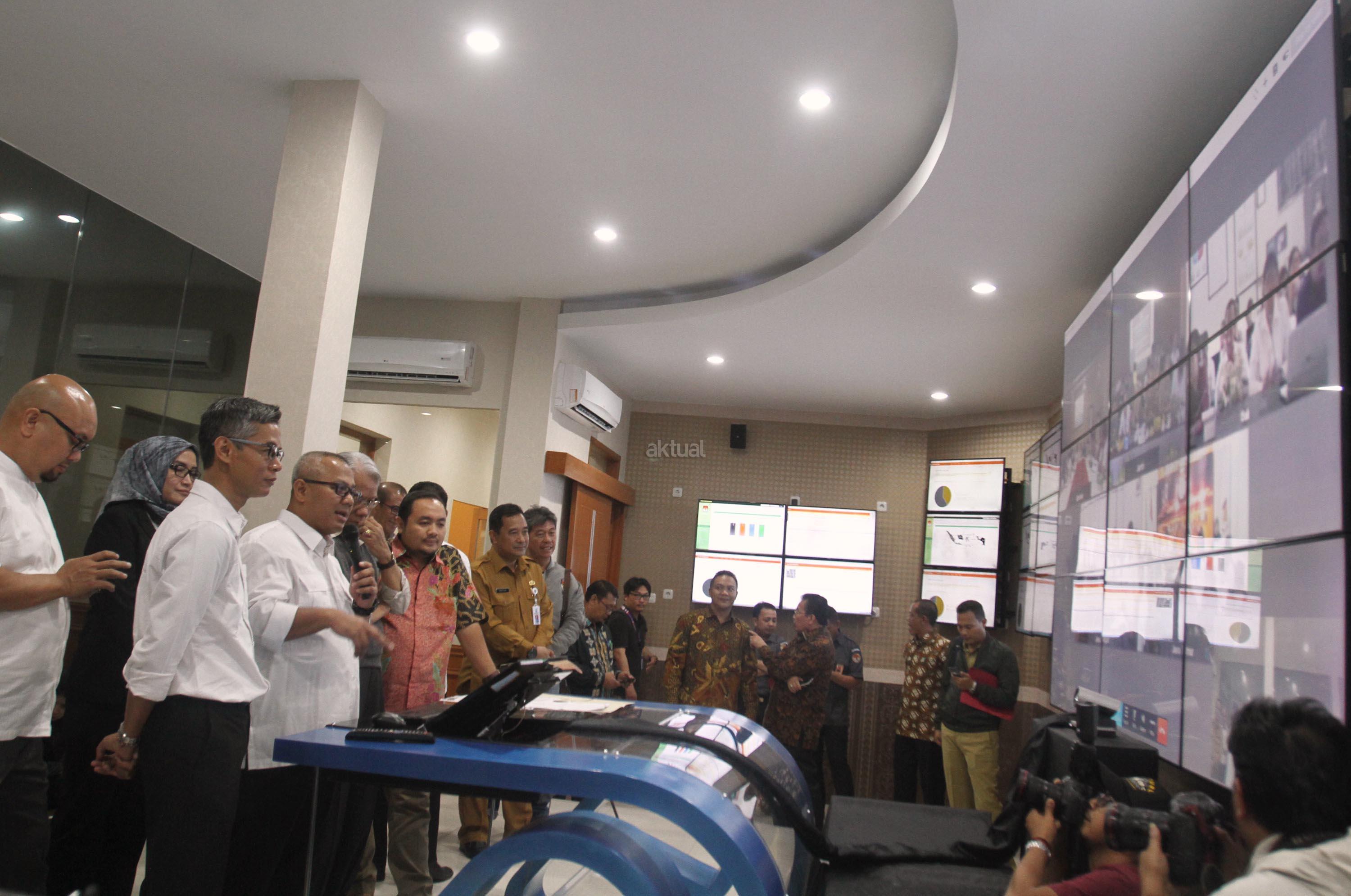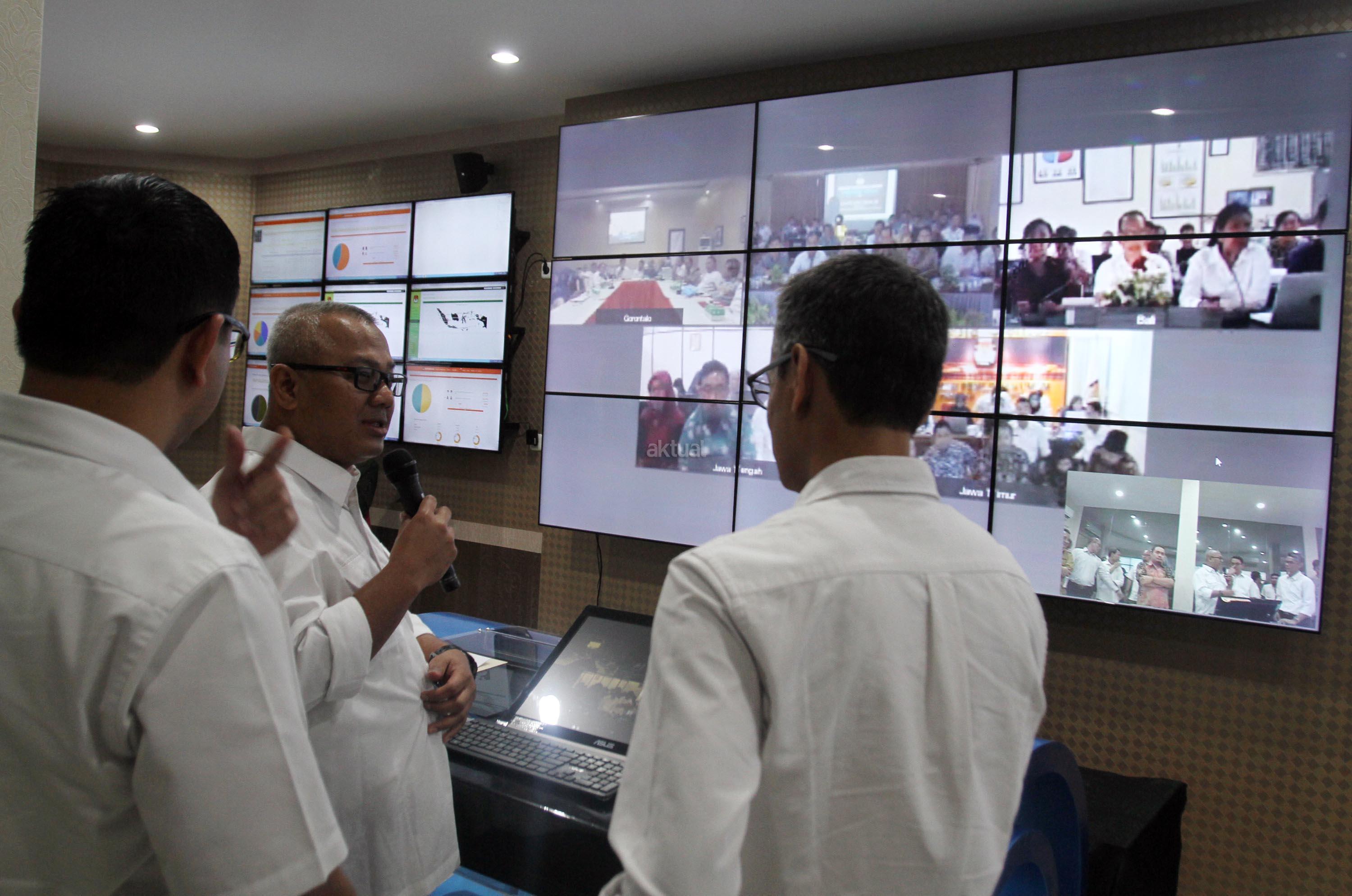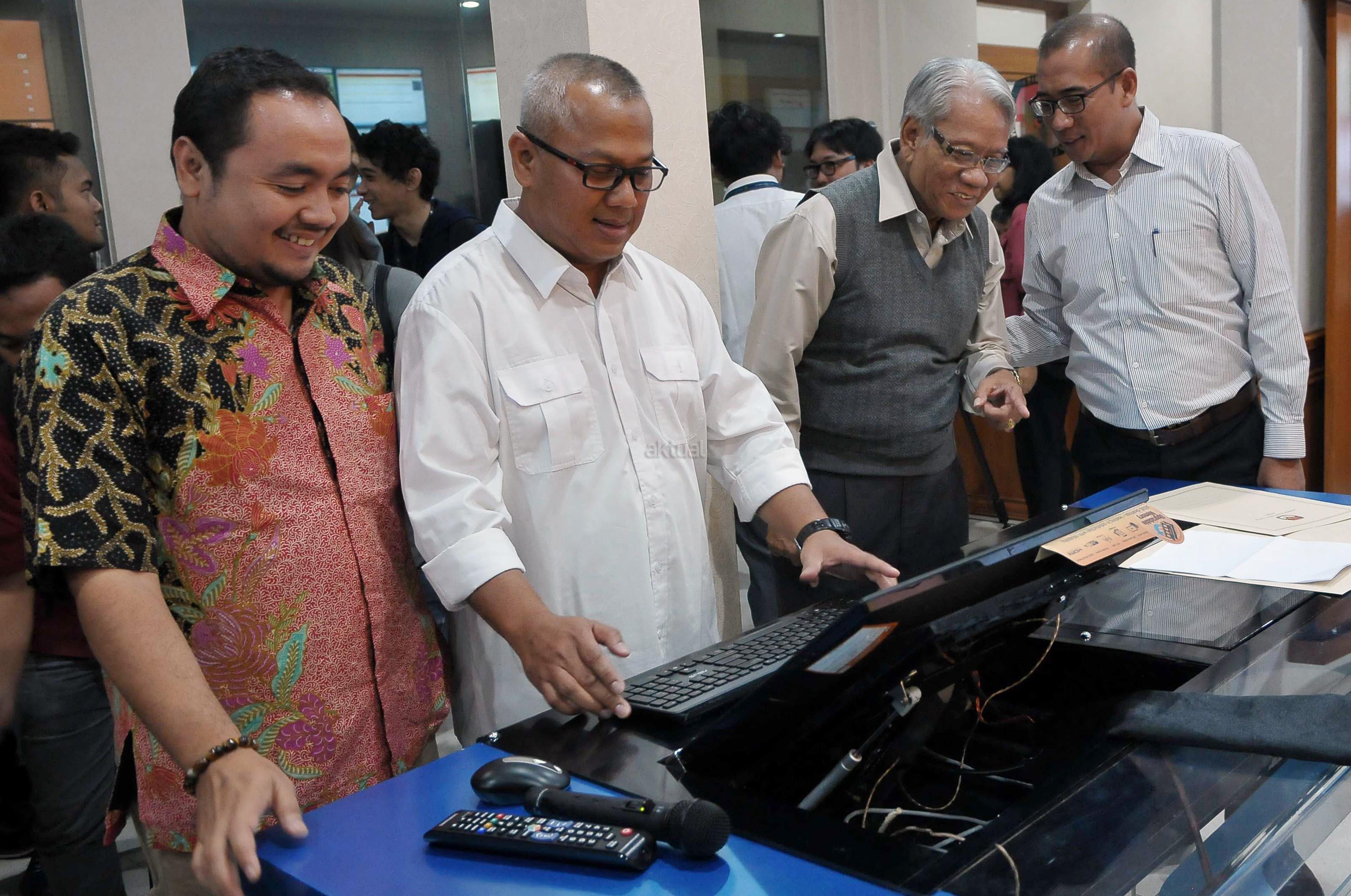 Ketua KPU Arief Budiman (kedua kiri) bersama Anggota Bawaslu Mochammad Afifuddin (kiri), Ketua DKPP Harjono (kedua kanan) dan Komisioner KPU Hasyim Asy'ari (kanan) memerhatikan monitor operation room saat peluncuran Sistem Informasi Data Pemilih (Sidalih) di Gedung KPU, Jakarta, Selasa (11/7/2017). Sidalih merupakan salah satu aplikasi yang digunakan KPU untuk mempermudah jajarannya dalam melakukan pendataan dan pemutakhiran data pemilih. AKTUAL/Munzir