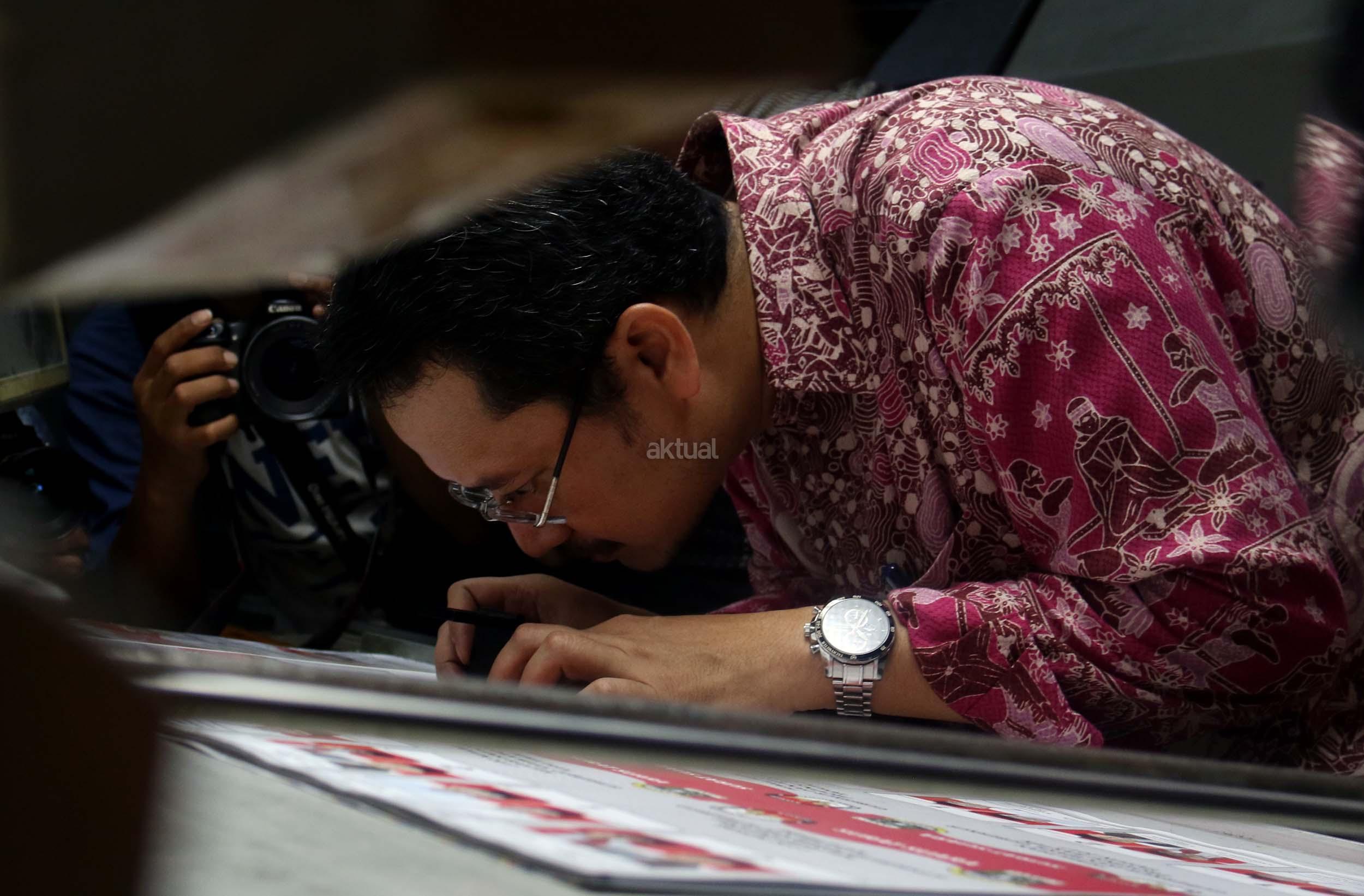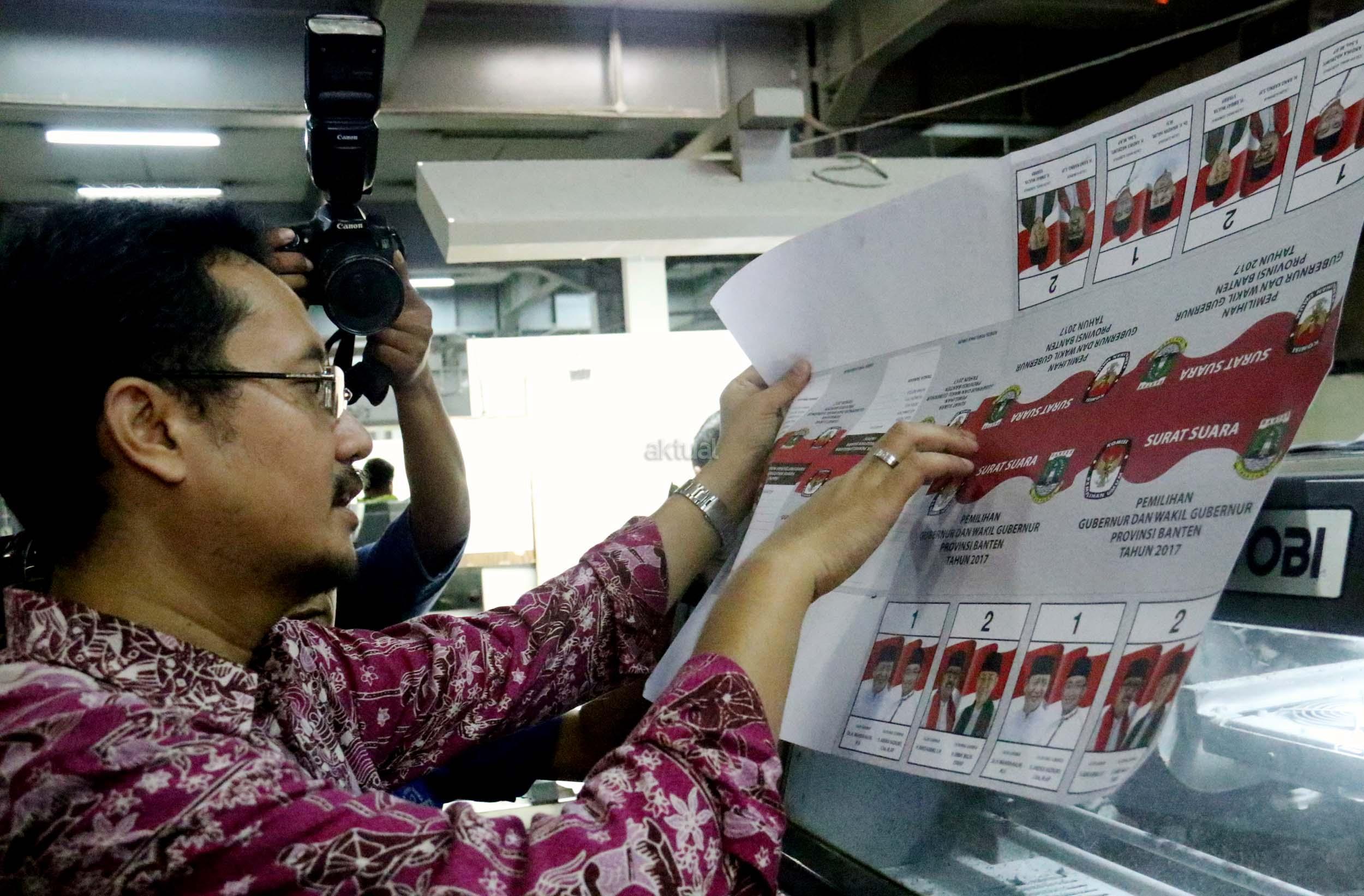 Komisioner KPU RI Ferry Kurnia Rizkiansyah mengecek surat suara pilkada wilayah Banten di percetakan PT Dian Rakyat, Pulo Gadung, Jakarta, Rabu (11/1/2017). Sebanyak 7,9 juta kertas suara mulai dicetak hari ini dengan proses cetak selama empat hari. AKTUAL/Munzir