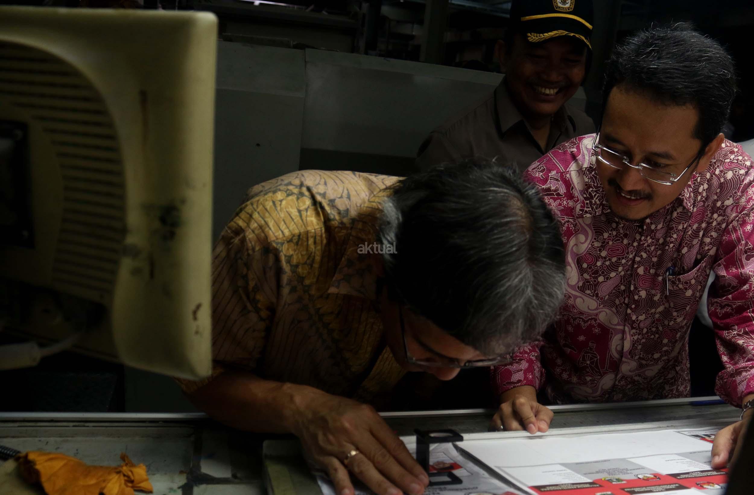 Komisioner KPU RI Ferry Kurnia Rizkiansyah (kanan) mengecek surat suara pilkada wilayah Banten di percetakan PT Dian Rakyat, Pulo Gadung, Jakarta, Rabu (11/1/2017). Sebanyak 7,9 juta kertas suara mulai dicetak hari ini dengan proses cetak selama empat hari. AKTUAL/Munzir