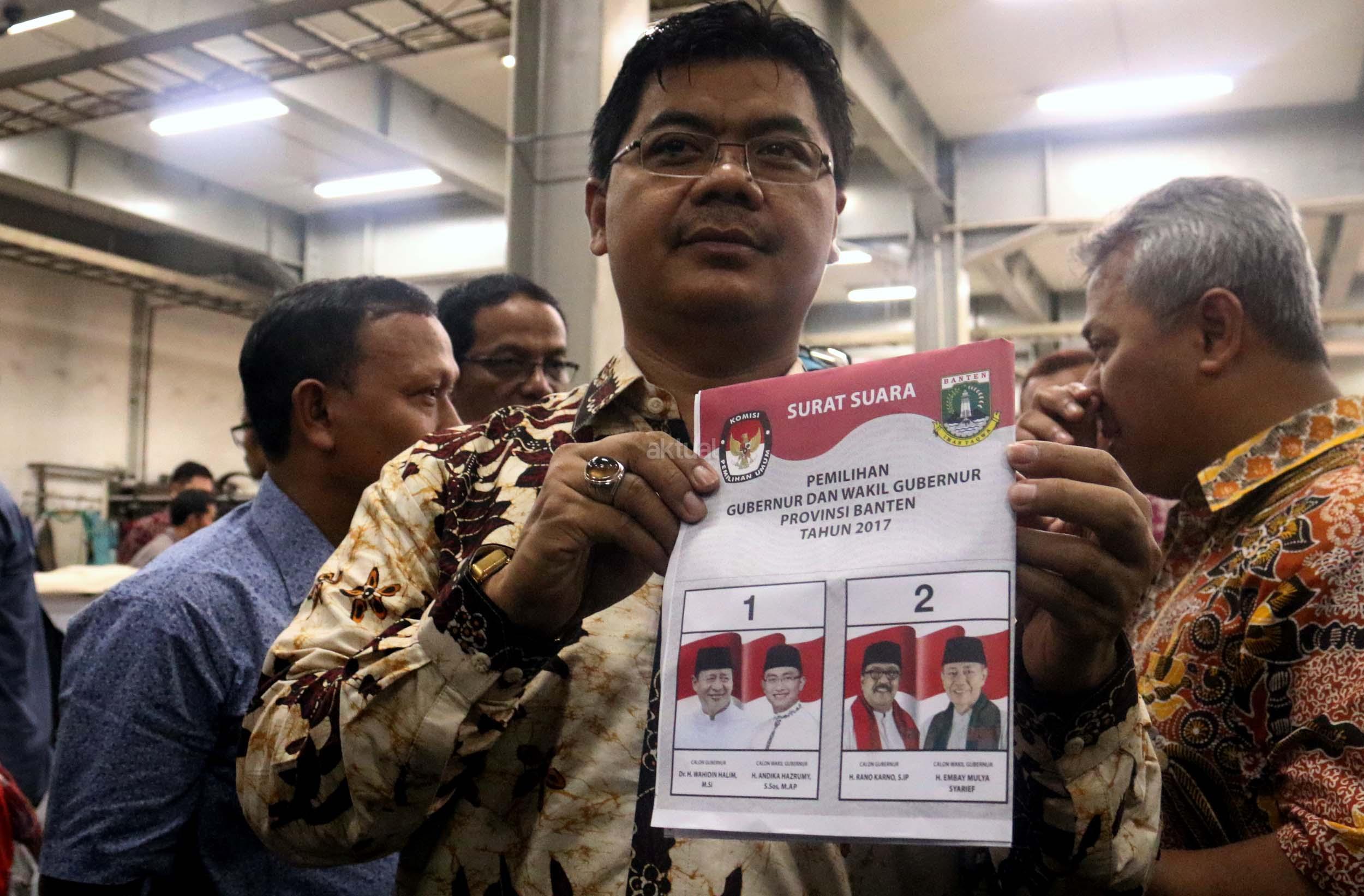 Ketua KPU Juri Ardiantoro menunjukkan surat suara pilkada wilayah Banten di percetakan PT Dian Rakyat, Pulo Gadung, Jakarta, Rabu (11/1/2017). Sebanyak 7,9 juta kertas suara mulai dicetak dengan proses cetak selama empat hari. AKTUAL/Munzir