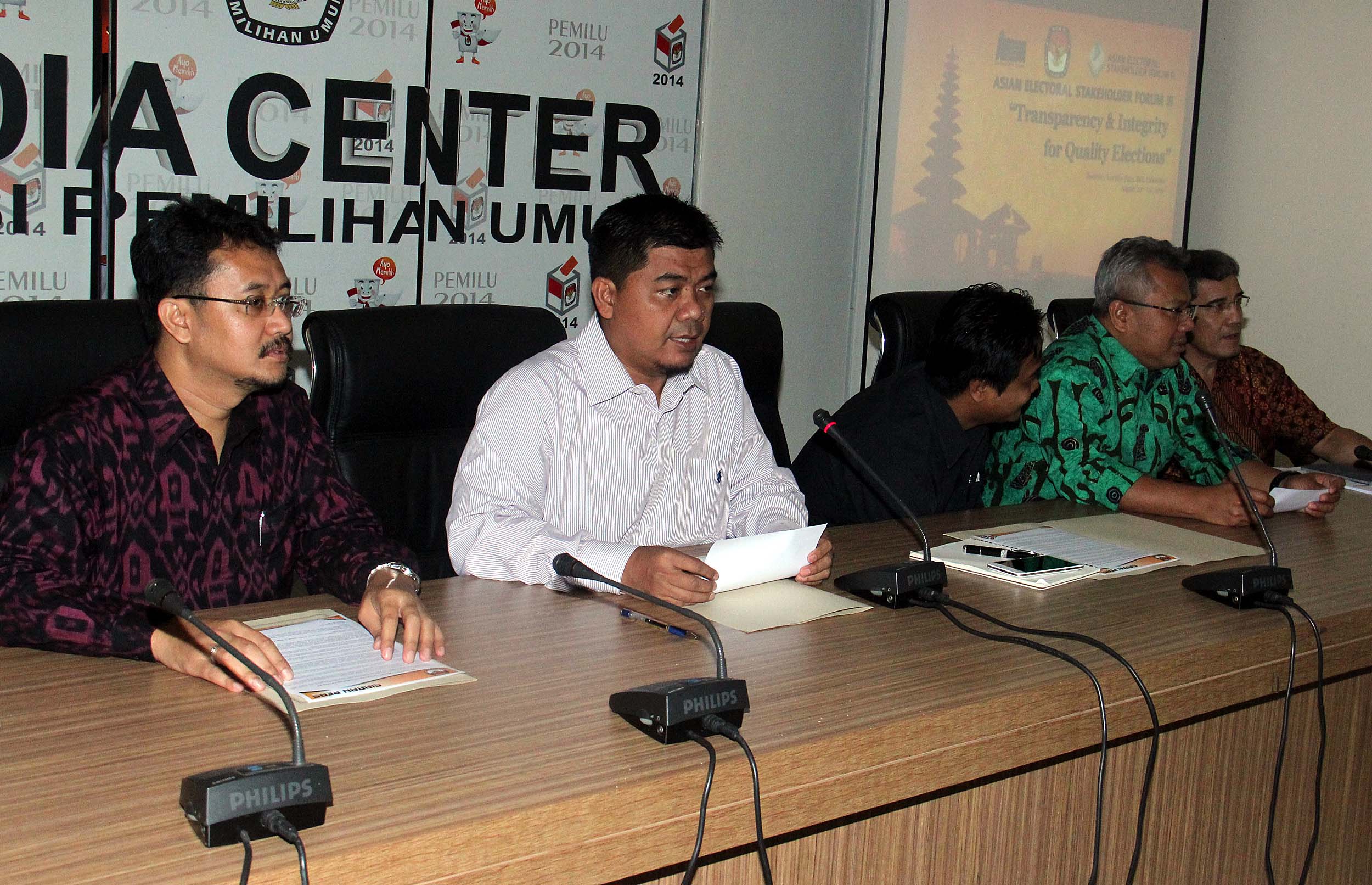 Kiri-kanan ; Komisioner KPU Ferry Kurnia Rizkiyansyah, Ketua KPU Juri Ardianto, Direktur Eksekutif Anfrel Foundation Ichal Supriadi, Komisioner KPU Arief Budiman, Hadar Nafis Gumay memberikan keterangan kepada media di Media Center KPU terkait kegiatan Asian Electoral Stakeholder Forum (AESF) III, Jakarta, Kamis, (18/8/2016). KPU RI diberi kepercayaan untuk menyelenggarakan AESF III pada 22-26 Agustus 2016 di Bali dimana forum tersebut melibatkan Badan Penyelenggara Pemilu dan LSM di Asia dan bertujuan meningkatkan pemilu yang demokratis.