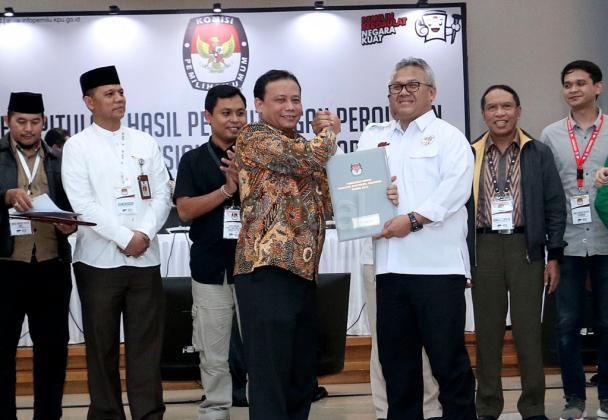 Ketua KPU Arief Budiman (kedua kanan) bersama Ketua Bawaslu Abhan (kedua kiri) dan Saksi dari Paslon nomor urut 01 dan 01 berjabat tangan usai pengumuman hasil rekapitulasi nasional pemilihan presiden di Gedung KPU, Jakarta, Selasa (21/5/2019) dini hari. Proses rekapitulasi nasional KPU untuk Pilpres 2019 dinyatakan selesai dengan pasangan nomor urut 01 meraih total 85.036.828 suara atau 55,50 persen dan pasangan nomor urut 02 meraih total 68.442.493 suara atau 44,50 persen dari jumlah suara sah sebesar 154.257.601 suara. AKTUAL/Tino Oktaviano