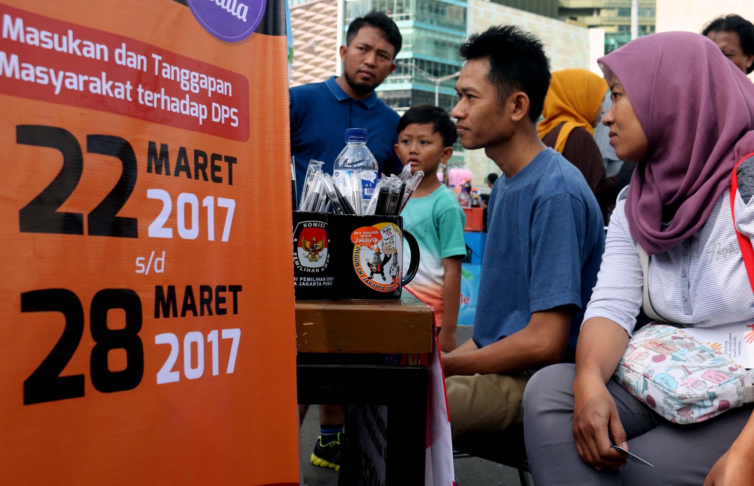 Warga mengecek data pemilih di Posko Penyempurnaan Data dan Daftar Pemilih yang di buka KPU Jakarta Pusat di CFD, kawasan Bundaran HI, Jakarta, Minggu (12/3/2017). Posko ini dibuat KPU DKI Jakarta untuk menemui langsung warga yang masih memiliki masalah dalam menggunakan hak pilih pada 15 April mendatang. AKTUAL/Munzir