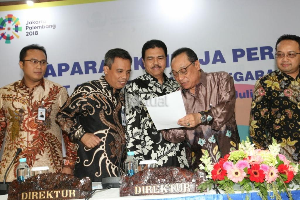 Direktur Utama PT Bank Tabungan Negara (Persero) Tbk. Maryono didampingi Jajaran Direksi pada acara Konferensi Pers Paparan Kinerja Bank BTN per semester I tahun 2018 di Menara BTN, Jakarta, Rabu (18/7). Pada semester I/2018, Bank BTN mencatatkan peningkatan penyaluran kredit sebesar 19,14% yoy menjadi Rp211,35 triliun per semester I/2018. Kontribusi terbesar pencapaian tersebut berasal dari segmen kredit perumahan yang tumbuh 19,76% yoy. Sebagai pemimpin pasar KPR Nasional dengan pangsa pasar sebesar 37,47% Bank BTN telah menyalurkan kredit perumahan senilai Rp 191,30triliun atau tumbuh 19,76% dibandingkan semester I tahun 2017. AKTUAL/Eko S Hilman