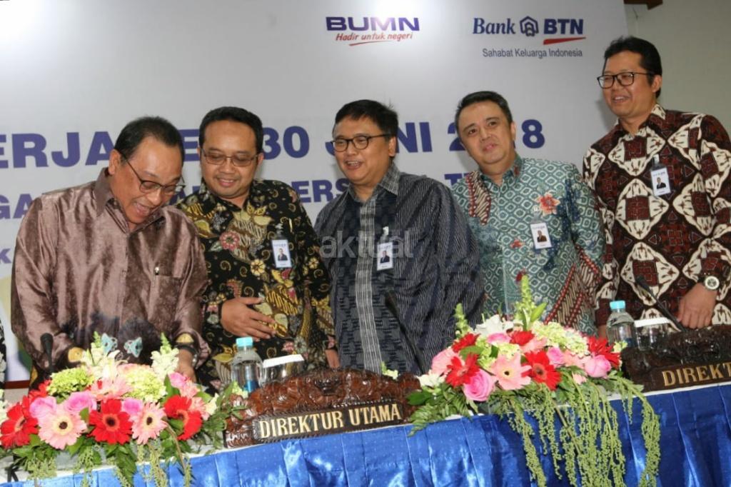 Direktur Utama PT Bank Tabungan Negara (Persero) Tbk. Maryono (kedua kanan) didampingi Jajaran Direksi pada acara Konferensi Pers Paparan Kinerja Bank BTN per semester I tahun 2018 di Menara BTN, Jakarta, Rabu (18/7). Pada semester I/2018, Bank BTN mencatatkan peningkatan penyaluran kredit sebesar 19,14% yoy menjadi Rp211,35 triliun per semester I/2018. Kontribusi terbesar pencapaian tersebut berasal dari segmen kredit perumahan yang tumbuh 19,76% yoy. Sebagai pemimpin pasar KPR Nasional dengan pangsa pasar sebesar 37,47% Bank BTN telah menyalurkan kredit perumahan senilai Rp 191,30triliun atau tumbuh 19,76% dibandingkan semester I tahun 2017. AKTUAL/Eko S Hilman