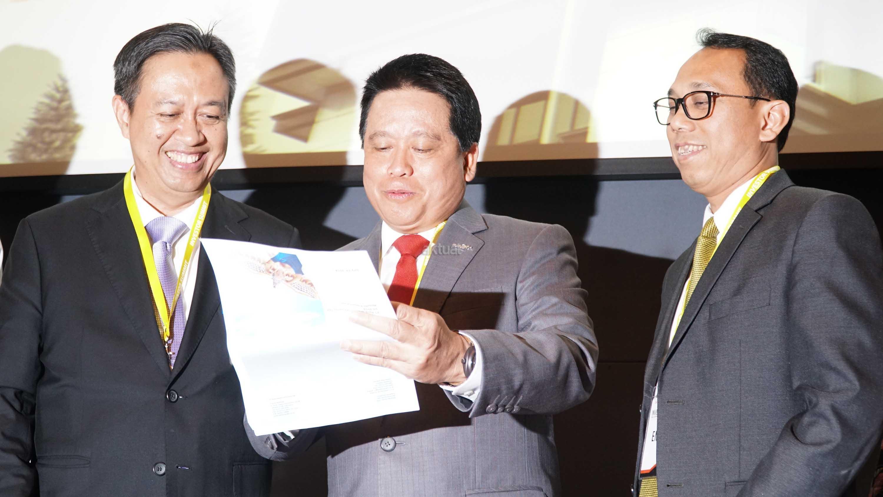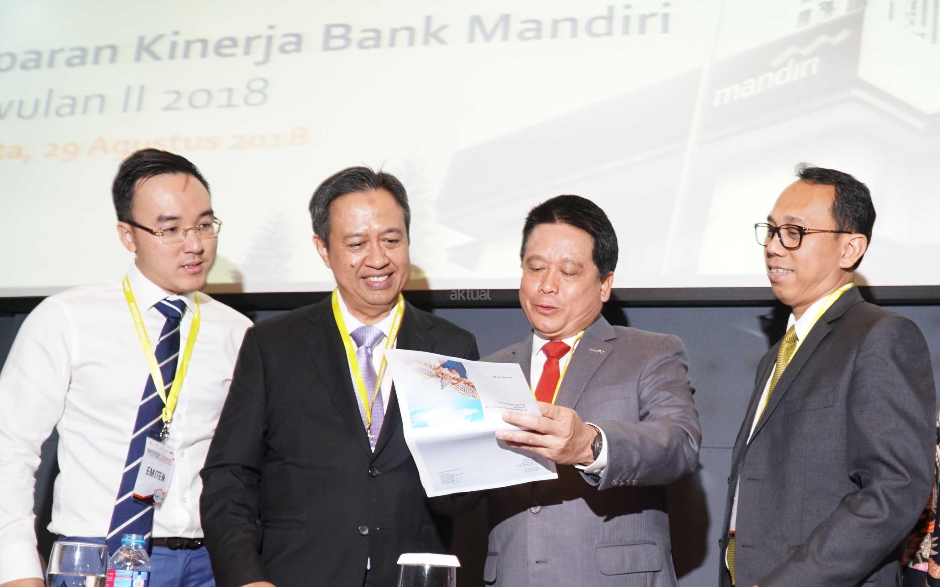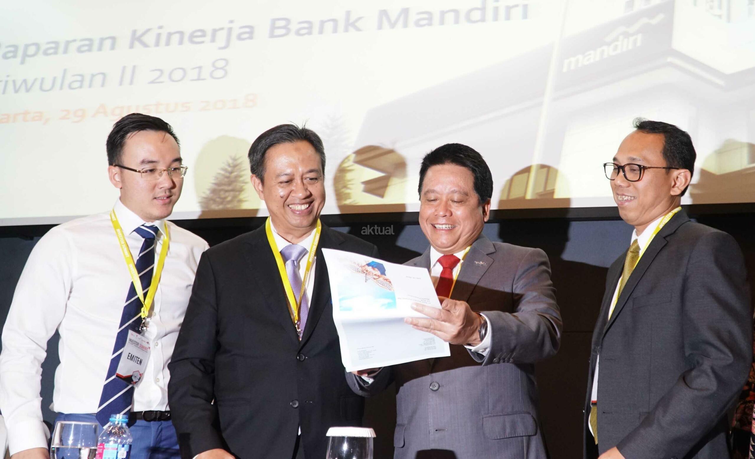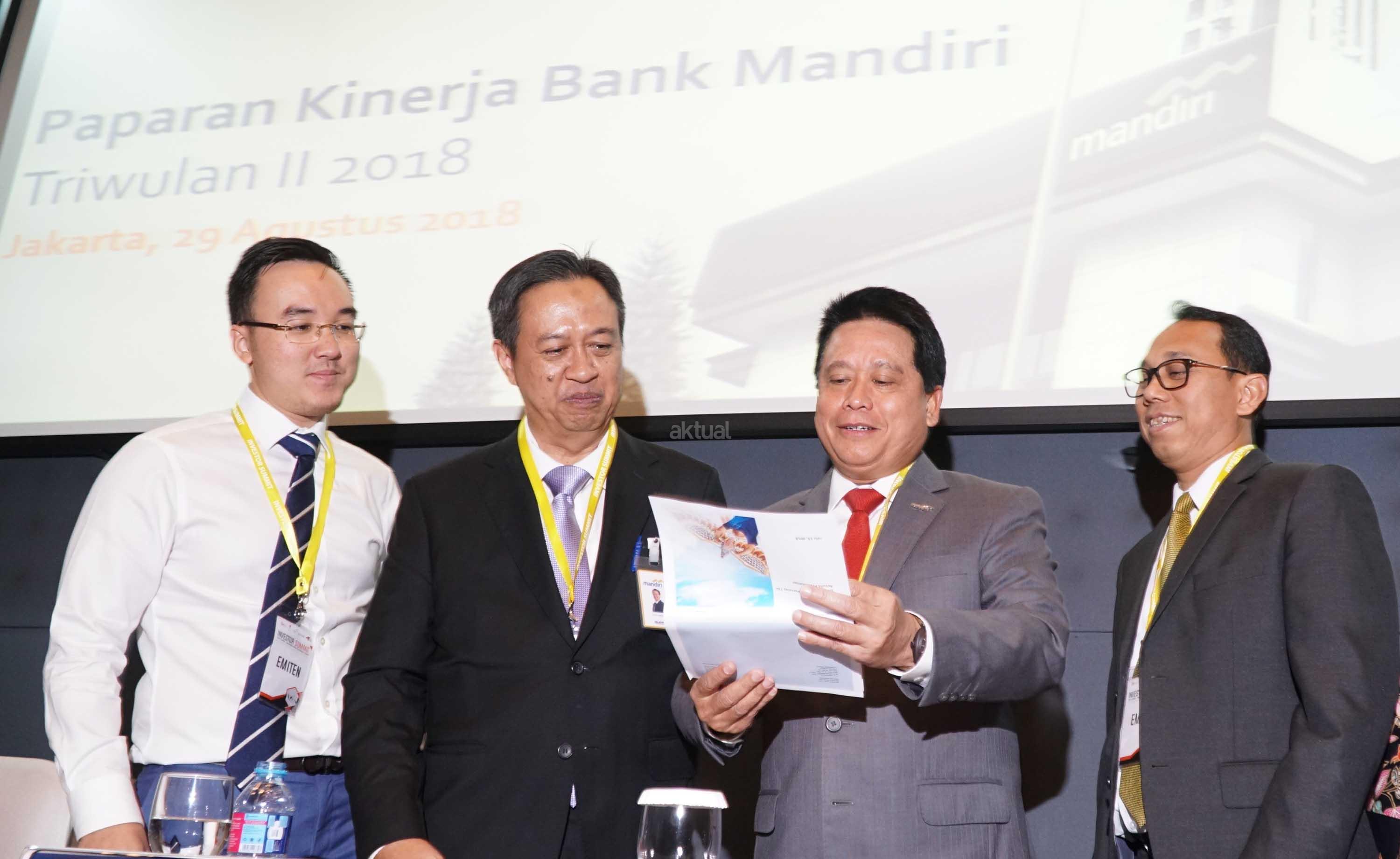 (kiri ke kanan) SVP Investor Relations Bank Mandiri, Yohan Setio, Pejabat Eksekutif Keuangan Bank Mandiri, Panji Irawan, Direktur Bisnis Kecil dan Jaringan, Hery Gunadi serta SVP Strategy and Performance, Elmamber Petamu Sinaga sedang berbincang seusai penyampaian paparan public marathon di Gedung Bursa Efek Indonesia, Jakarta, Rabu (29/8). Bank Mandiri terus melakukan perbaikan kualitas asset dan manajemen likuiditas guna megantisipasi dampak tren kenaikan suku bunga dan pelemahan nilai tukar rupiah. Salah satunya, perseroan telah menaikkan suku bunga deposito berjangka hingga 50 bps sejak Juni lalu dan memfokuskan pertumbuhan pinjaman pada sektor korporasi dan ritel yang memiliki resiko rendah. AKTUAL/Eko S Hilman