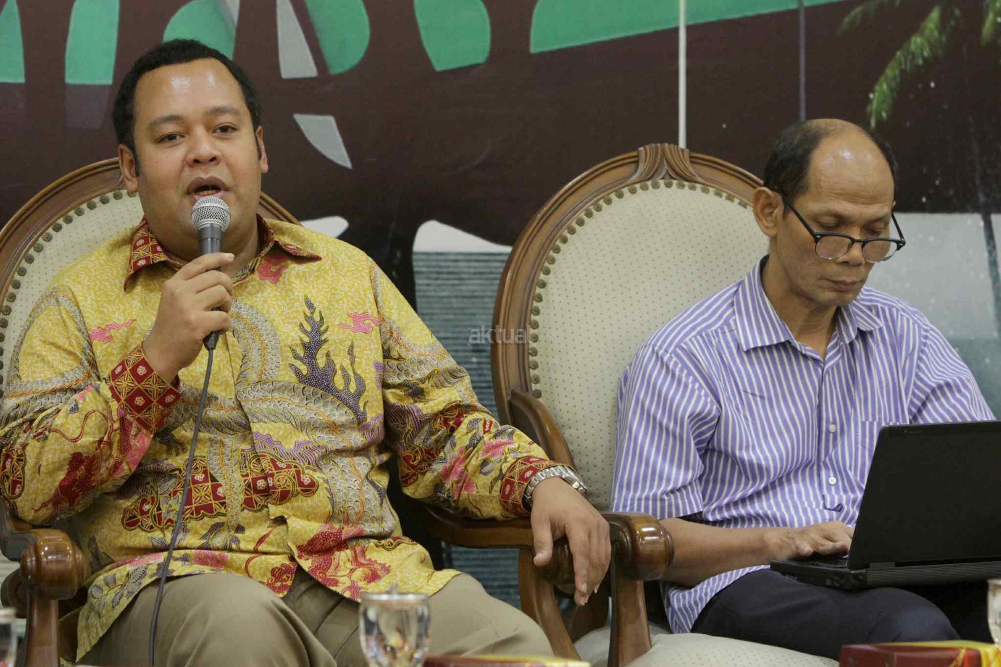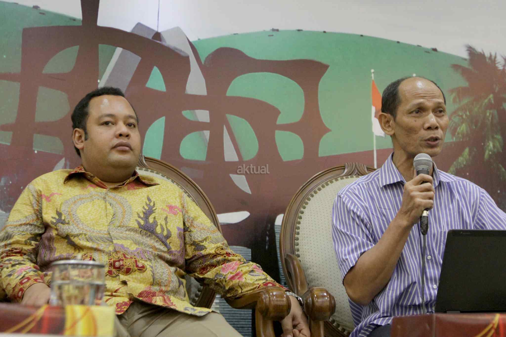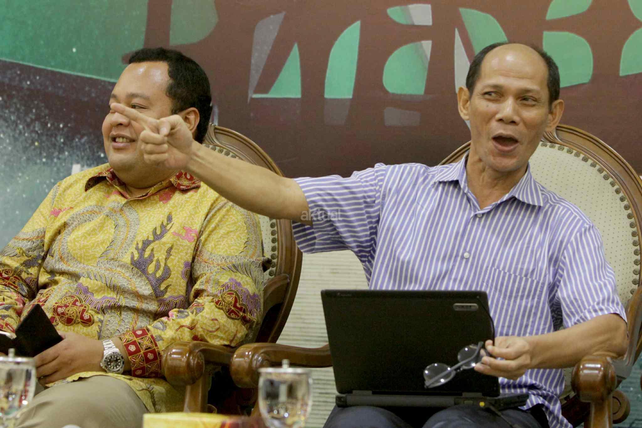 Pakar Ekonomi Politik Ichsanuddin Noorsy (kanan) mnyampaikan pendapatnya didampingi Wakil Ketua Komisi VI DPR Mohammad Haikal (kiri) dalam Diskusi Forum Legislasi membahas tema ''RUU BUMN dan Penyertaan Modal Negara (PMN)' di Kompleks Parlemen, Senayan, Jakarta, Selasa (25/10). Ichsanuddin Noorsy mengatakan, bahwa di tengah ambruradulnya pembenahan BUMN saat ini, Indonesia tidak saja tengah mengalami krisis energi, tapi juga tengah kekurangan pangan. Indonesia membutuhkan political will pemerintahan Joko Widodo untuk keluar dari krisis energi berkepanjangan. Pasalnya, Indonesia bukan Korea Selatan, India, atau Jepang, yang mampu mengelola ketahanan energi mereka sendiri. AKTUAL/Tino Oktaviano