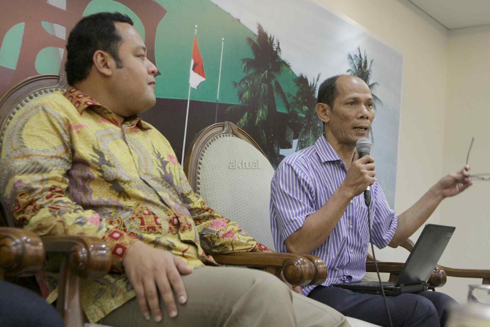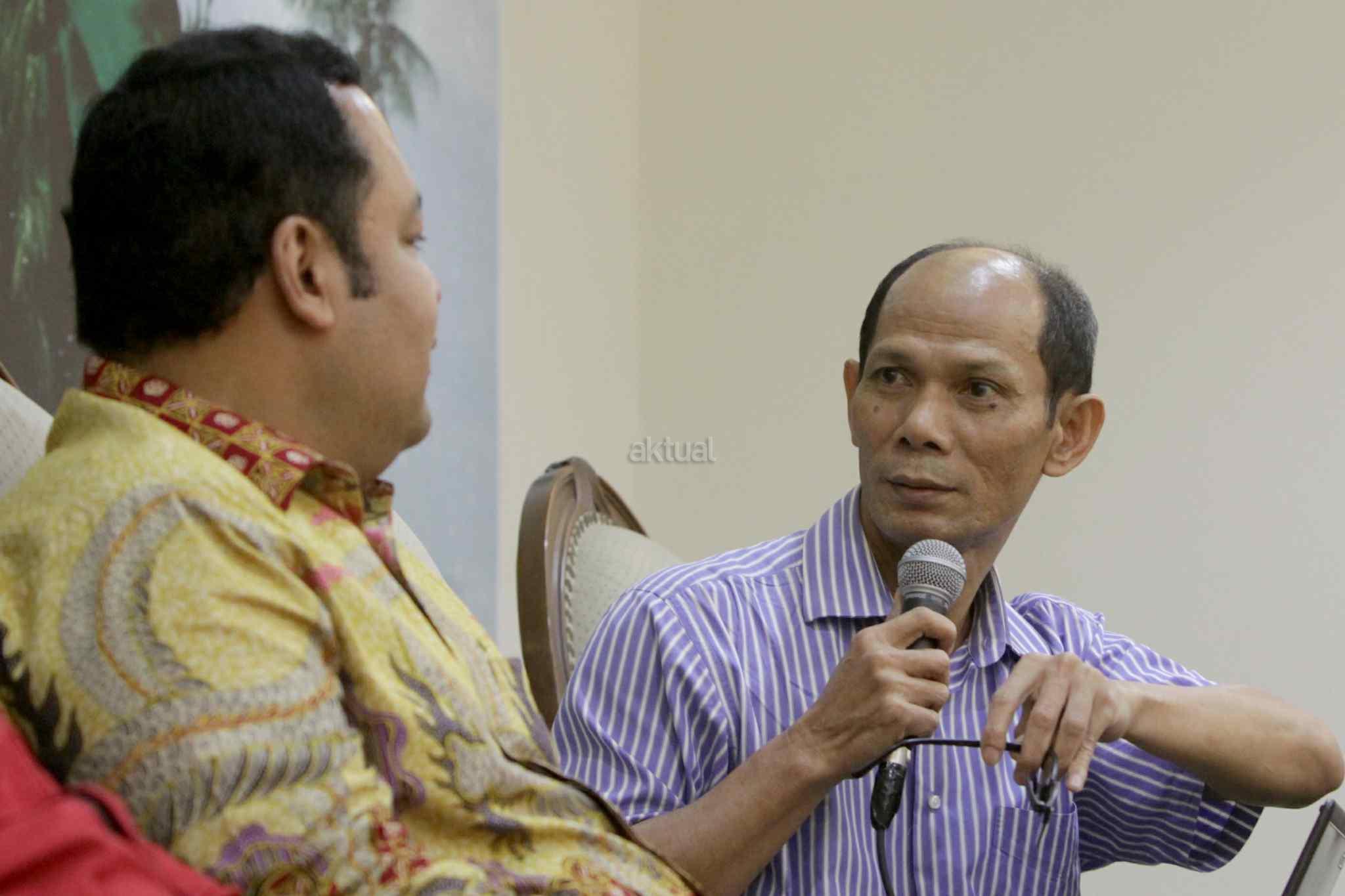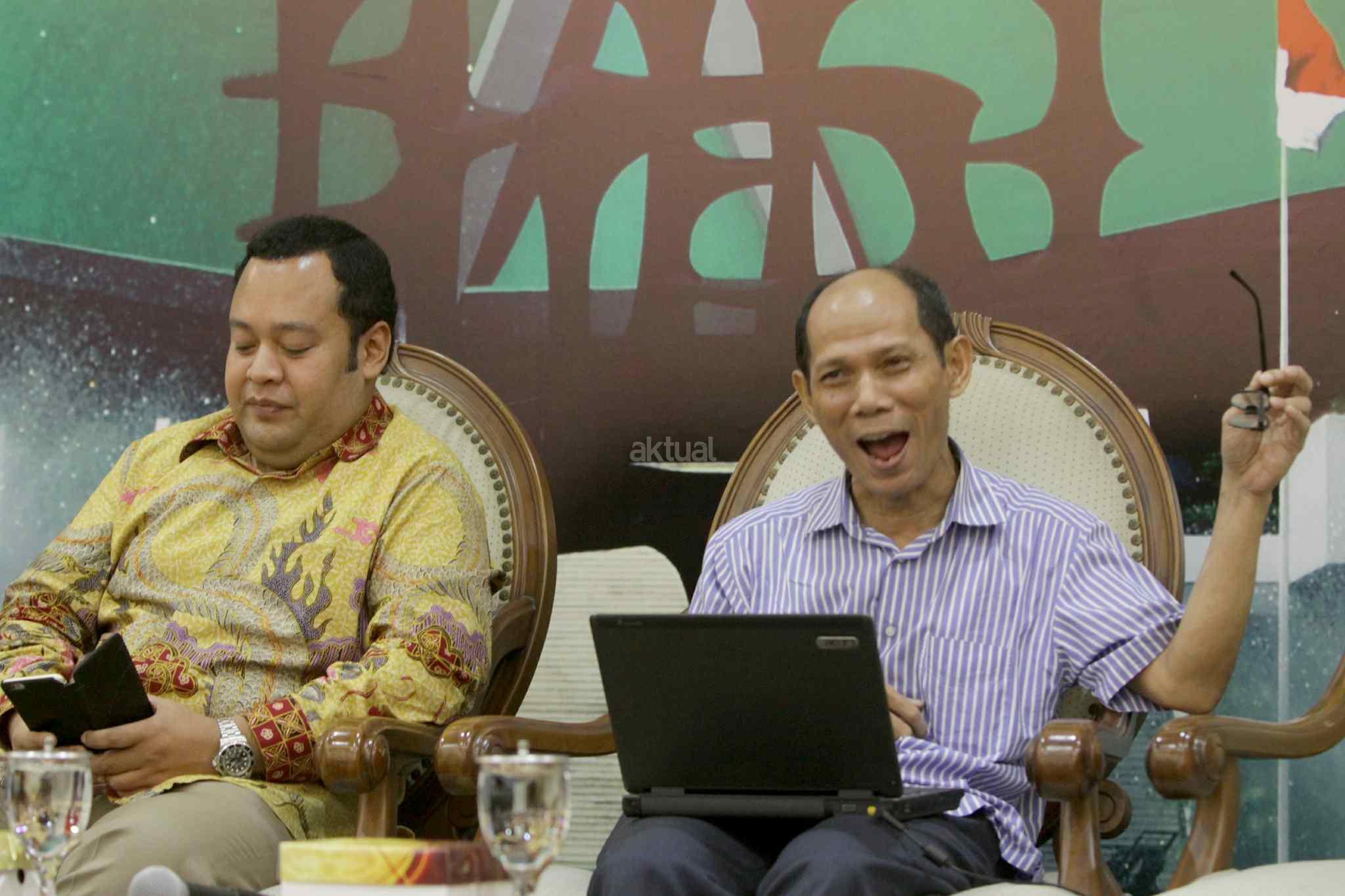 Pakar Ekonomi Politik Ichsanuddin Noorsy (kanan) mnyampaikan pendapatnya didampingi Wakil Ketua Komisi VI DPR Mohammad Haikal (kiri) dalam Diskusi Forum Legislasi membahas tema ''RUU BUMN dan Penyertaan Modal Negara (PMN)' di Kompleks Parlemen, Senayan, Jakarta, Selasa (25/10). Ichsanuddin Noorsy mengatakan, bahwa di tengah ambruradulnya pembenahan BUMN saat ini, Indonesia tidak saja tengah mengalami krisis energi, tapi juga tengah kekurangan pangan. Indonesia membutuhkan political will pemerintahan Joko Widodo untuk keluar dari krisis energi berkepanjangan. Pasalnya, Indonesia bukan Korea Selatan, India, atau Jepang, yang mampu mengelola ketahanan energi mereka sendiri. AKTUAL/Tino Oktaviano