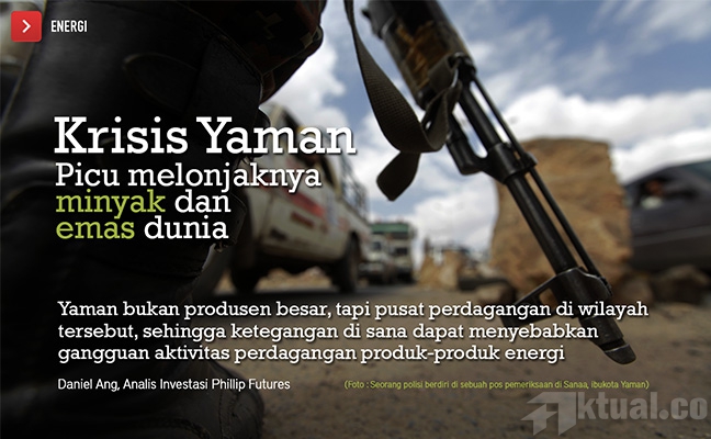 Yaman telah dicengkeram oleh kekacauan yang terus meningkat sejak pemberontak Syiah melancarkan perebutan kekuasaan di Sanaa pada Februari. “Ketegangan geopolitik di Yaman mendorong harga minyak lebih tinggi,” Daniel Ang, seorang analis investasi Phillip Futures, mengatakan kepada AFP.