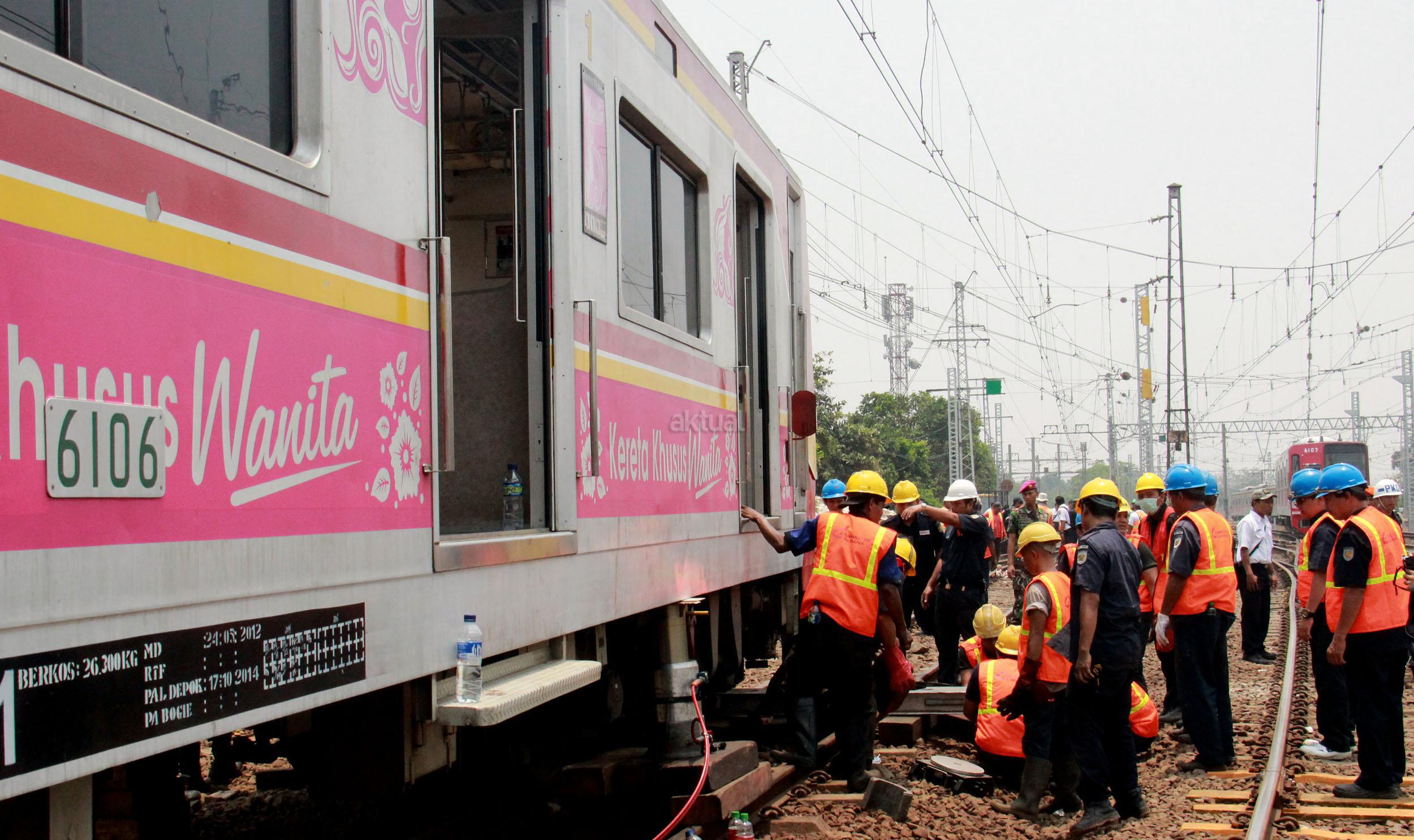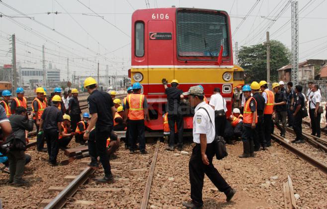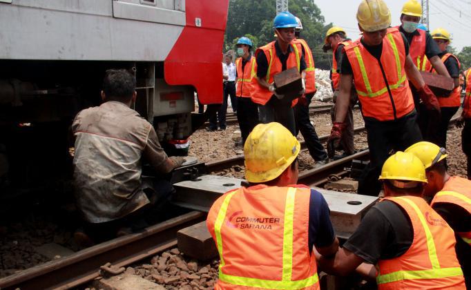 Terlihat para petugas PT KAI memperbaiki KRL yang anjlok saat akan memasuiki Stasiun Manggarai, Jakarta, Selasa (27/10/2015). KRL Commuter Line tujuan Bekasi-Jakarta Kota mengalami anjlok saat akan masuk ke Stasiun Manggarai, Jakarta Selatan. Anjloknya KRL ini membuat sejumlah perjalanan Commuter Line dialihkan.