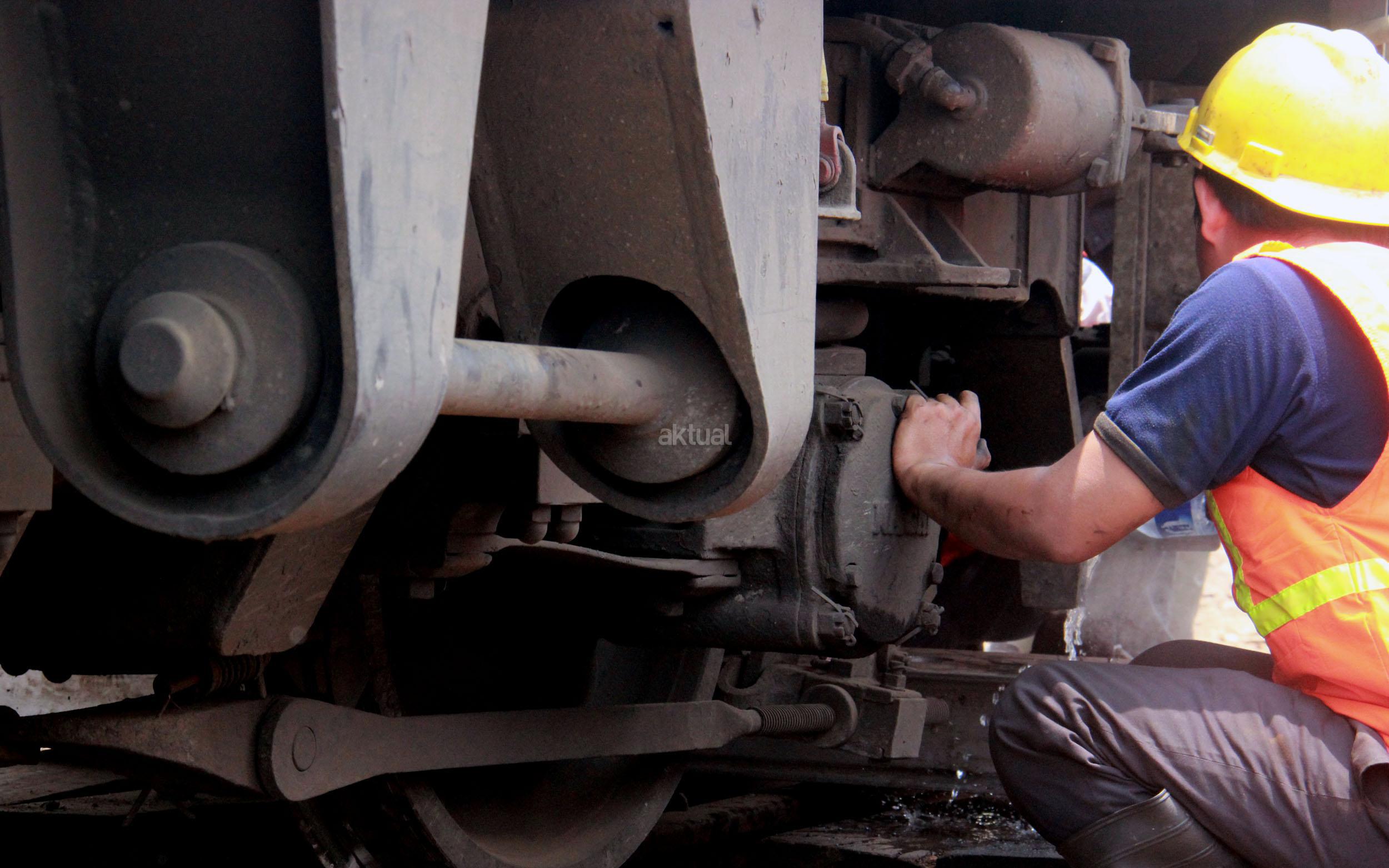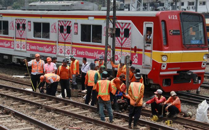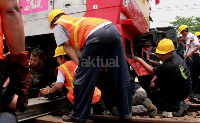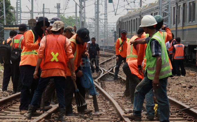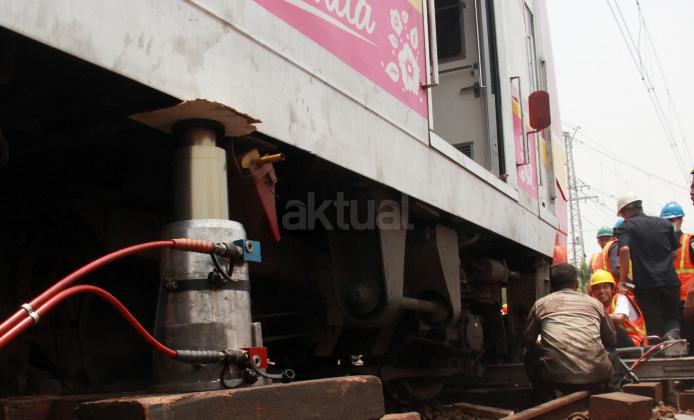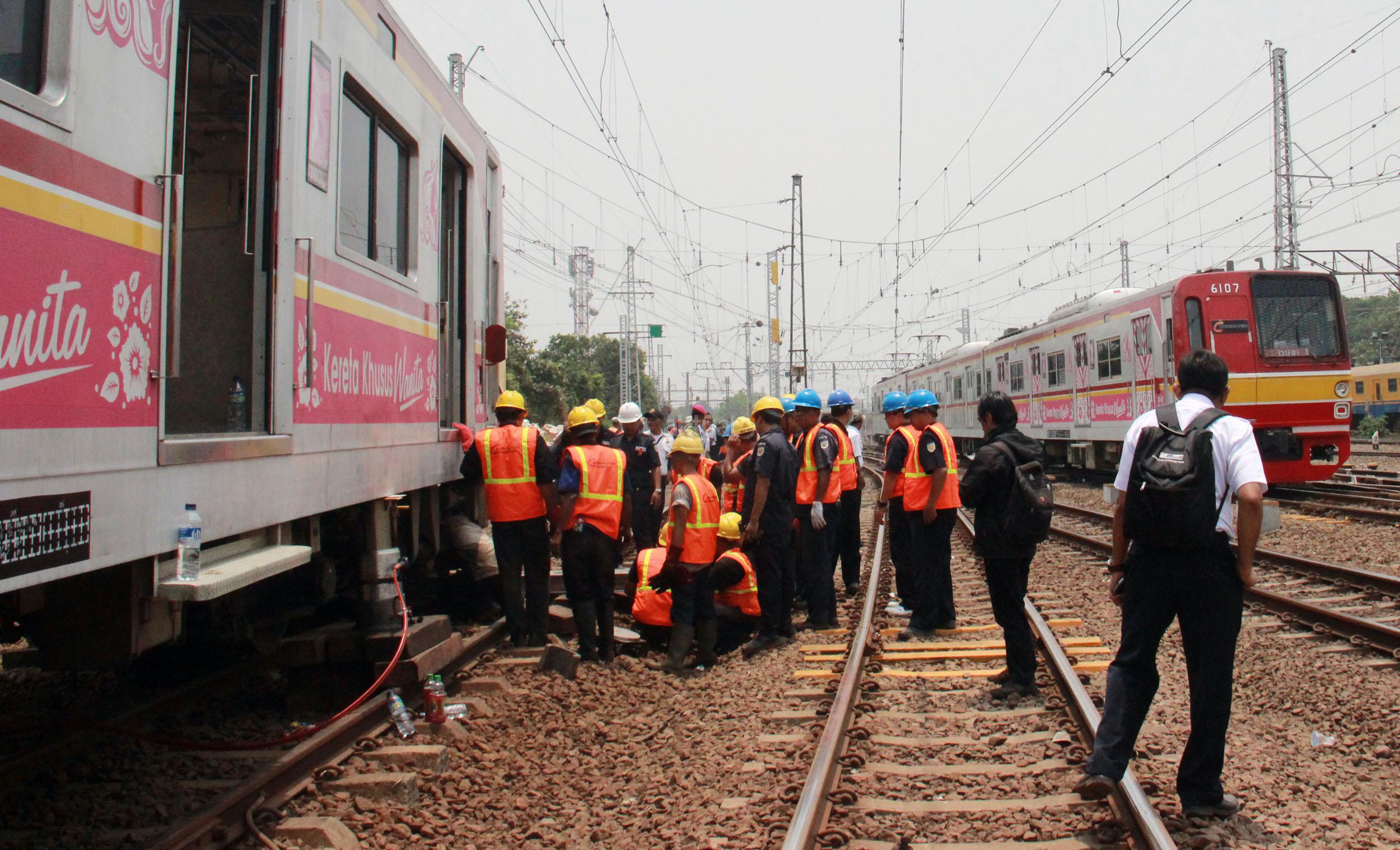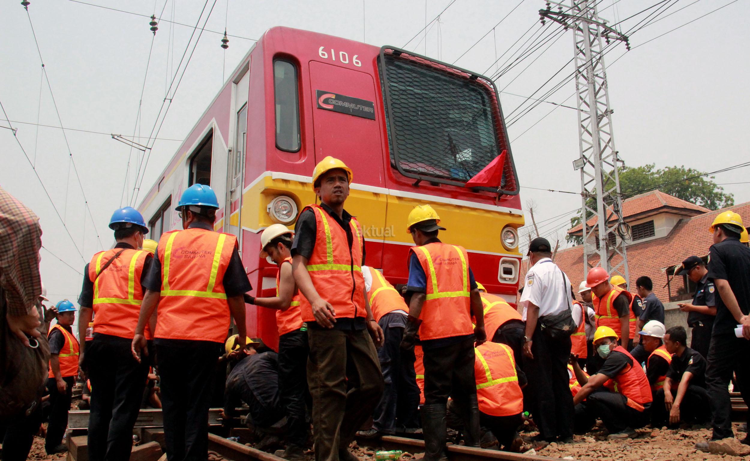 Terlihat para petugas PT KAI memperbaiki KRL yang anjlok saat akan memasuiki Stasiun Manggarai, Jakarta, Selasa (27/10/2015).