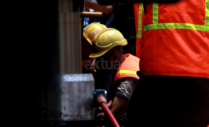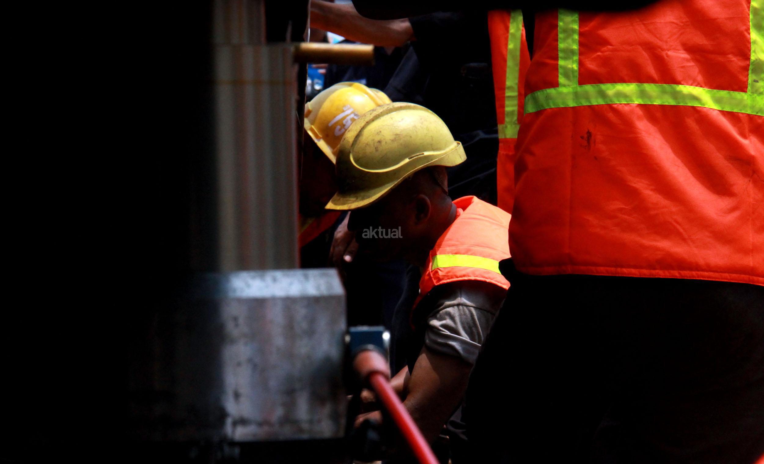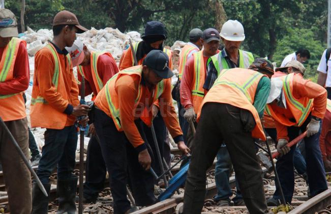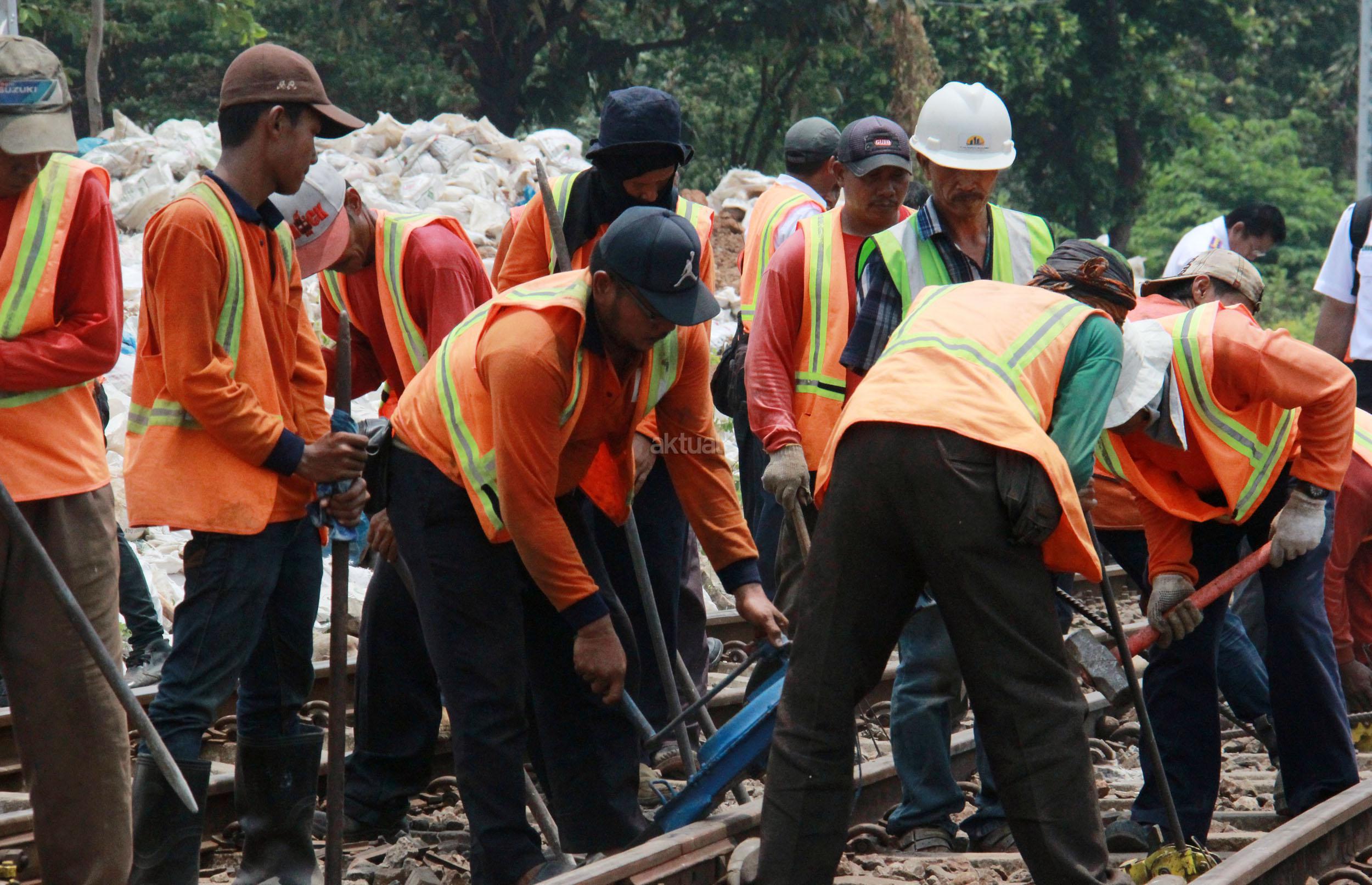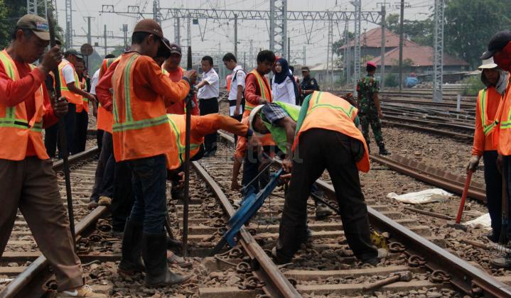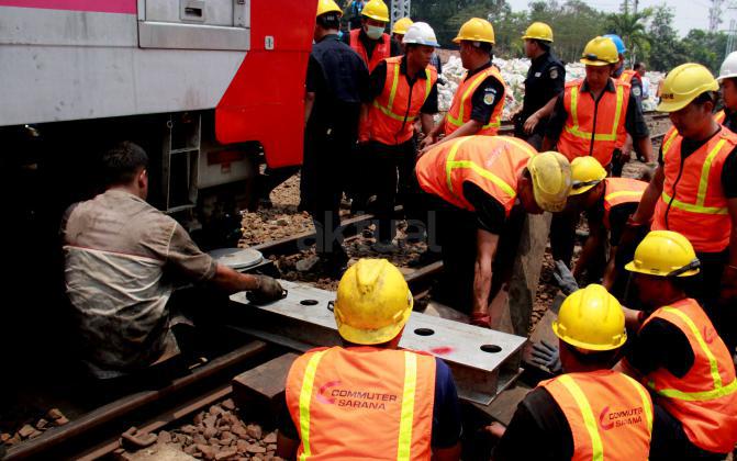 Para petugas PT KAI memperbaiki bantalan Rel akibat KRL Commuter Line yang anjlok saat menuju Stasiun Manggarai, Jakarta Selatan, Selasa (27/10/2015). KRL Commuter Line tujuan Bekasi-Jakarta Kota mengalami anjlok saat akan masuk ke Stasiun Manggarai, Jakarta Selatan. Anjloknya KRL ini membuat sejumlah perjalanan Commuter Line dialihkan.