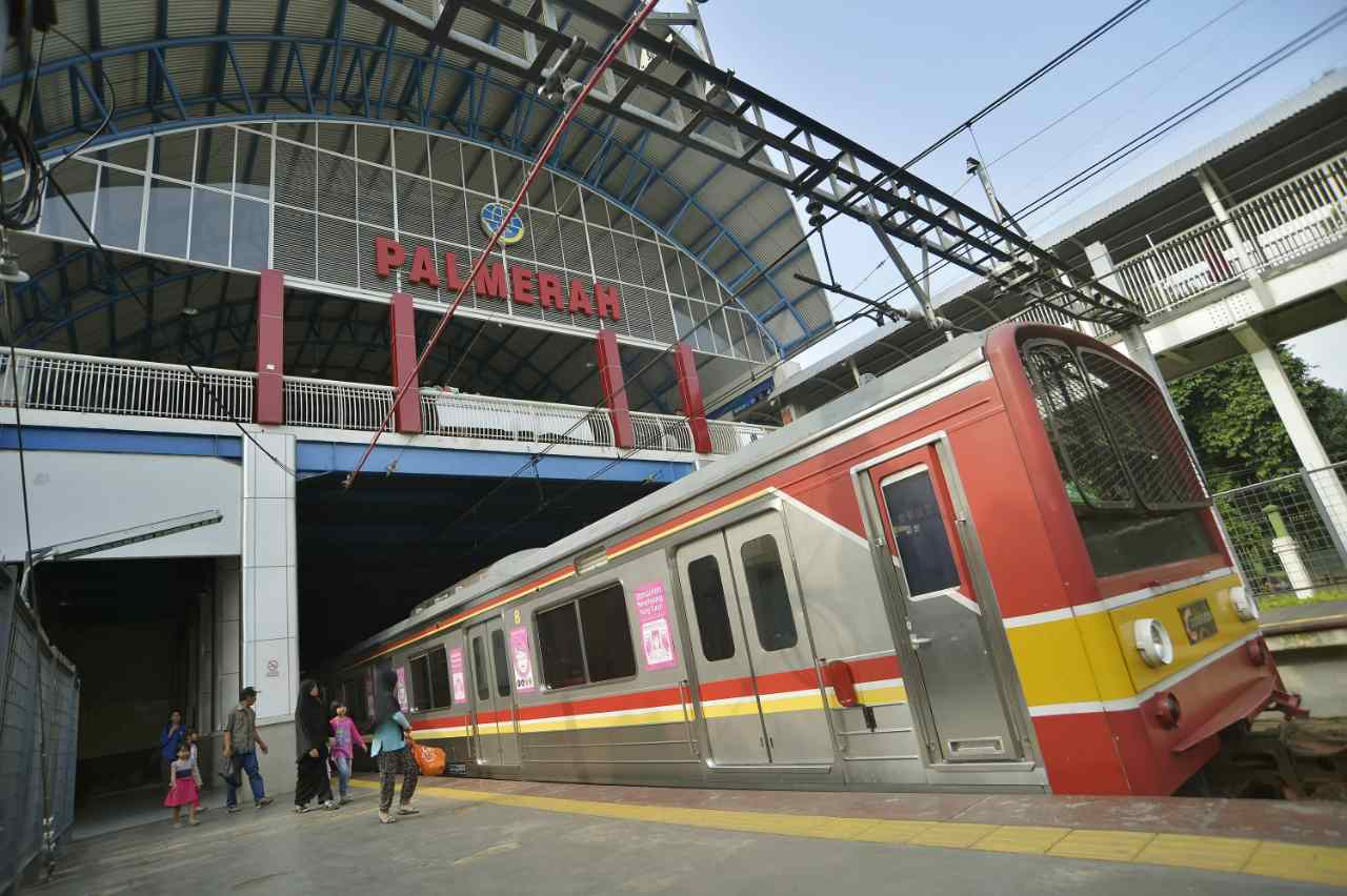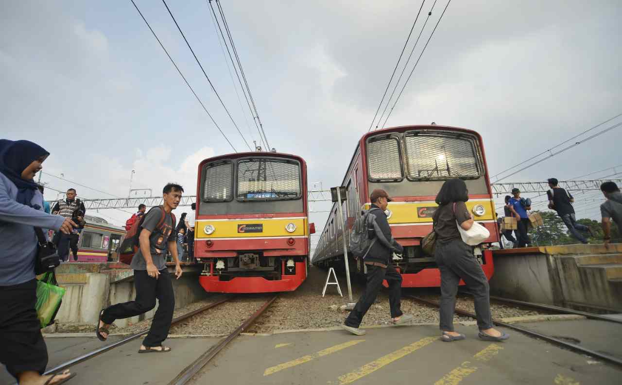 Penumpang melintas di depan rangkaian Kereta Rel Listrik (KRL) Commuterline di Stasiun Palmerah, Jakarta, Selasa (5/7). KRL Commuter Line tetap beroperasi dengan jadwal seperti biasa pada masa libur Lebaran tahun 2016, PT KAI Commuter Jabodetabek (KCJ) sebagai operator KRL Commuter Line tidak akan mengurangi jumlah perjalanan KRL, hal itu merupakan bentuk pelayanan KCJ bagi masyarakat yang ingin mudik maupun berlibur di sekitar wilayah Jabodetabek pada masa lebaran tahun ini. ANTARA FOTO/Yudhi Mahatma/aww/16.