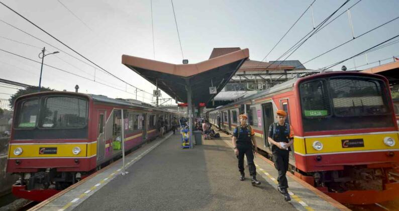 Petugas keamanan melintas di antara rangkaian Kereta Rel Listrik (KRL) Commuterline di Stasiun Tanah Abang, Jakarta, Selasa (5/7). KRL Commuter Line tetap beroperasi dengan jadwal seperti biasa pada masa libur Lebaran tahun 2016, PT KAI Commuter Jabodetabek (KCJ) sebagai operator KRL Commuter Line tidak akan mengurangi jumlah perjalanan KRL, hal itu merupakan bentuk pelayanan KCJ bagi masyarakat yang ingin mudik maupun berlibur di sekitar wilayah Jabodetabek pada masa lebaran tahun ini. ANTARA FOTO/Yudhi Mahatma/aww/16.