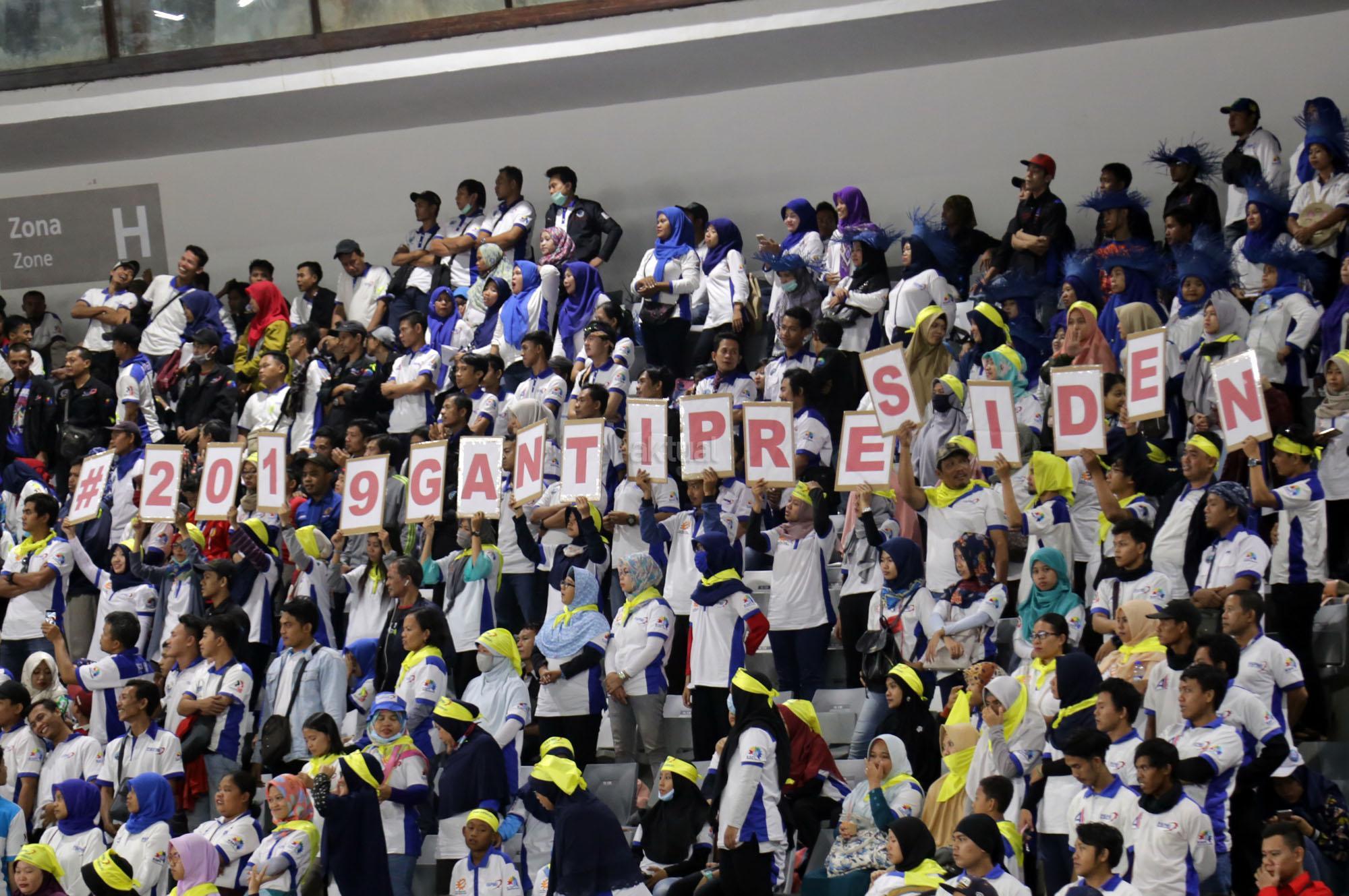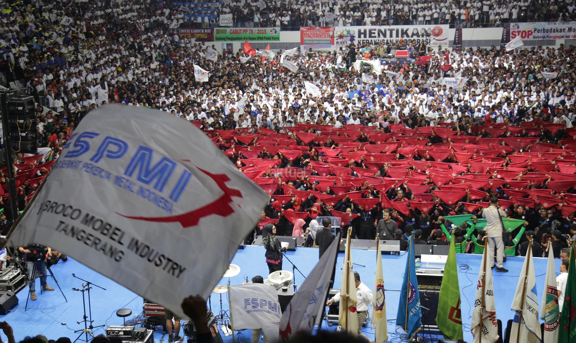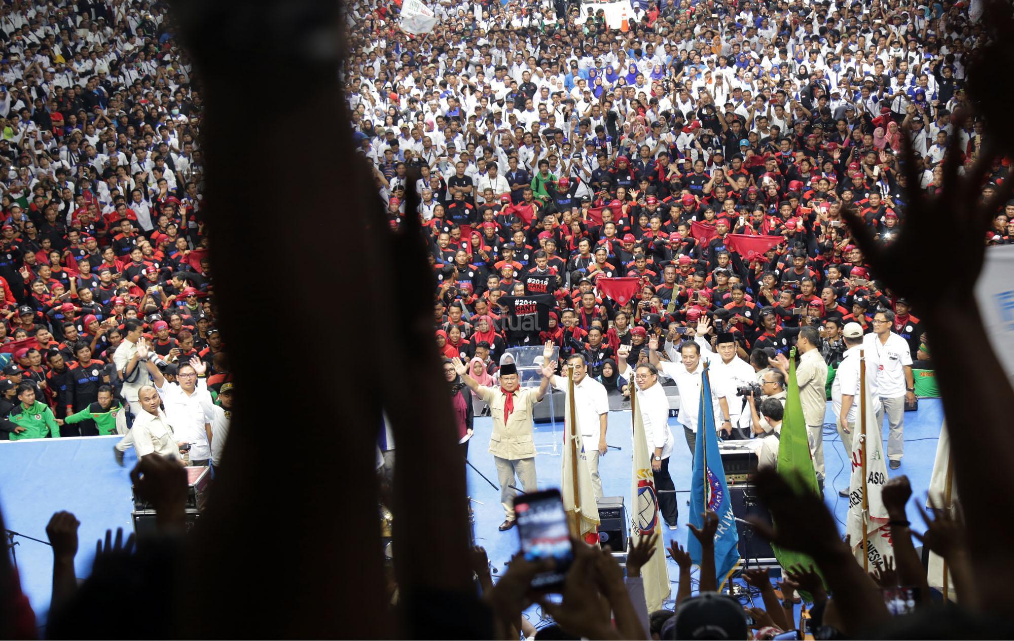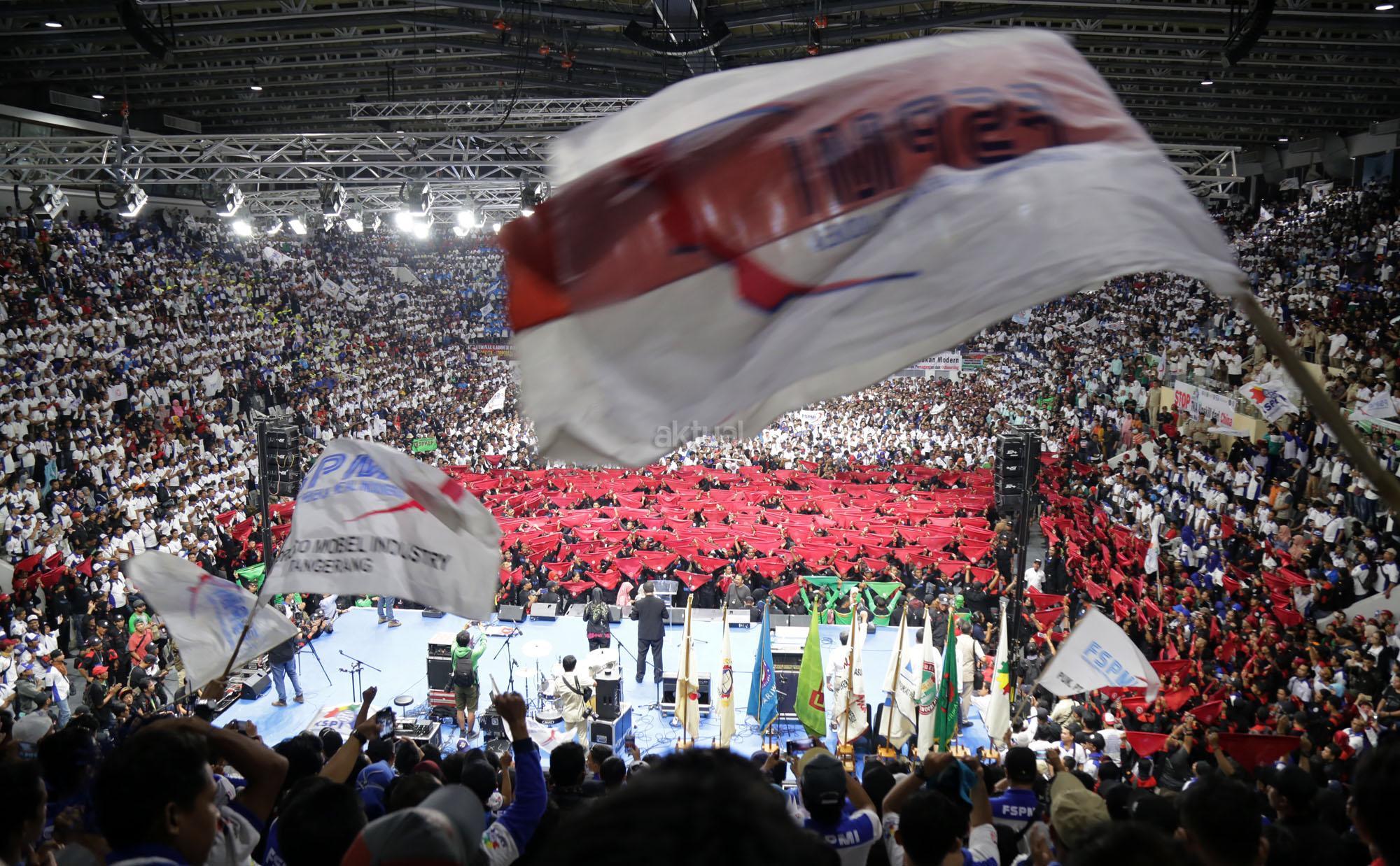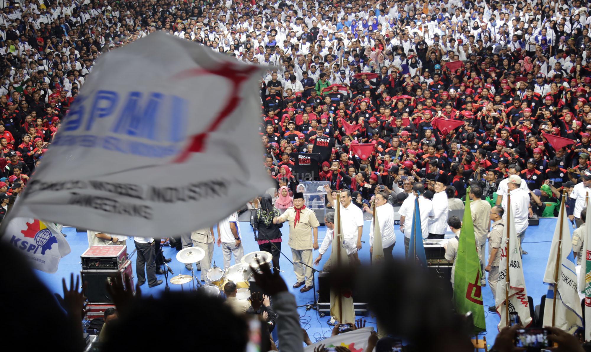 Suasana deklarasi Konfederasi Serikat Pekerja Indonesia (KSPI) dukungan buruh kepada Prabowo sebagai Capres 2019 di Istora Senayan, Jakarta, Selasa (1/5/8). KSPI resmi mendukung Prabowo Subianto dalam Pilpres 2019. KSPI menyebut hanya Prabowo yang mau menandatangani kontrak politik dengan menyetujui 10 tuntutan KSPI. AKTUAL/Tino Oktaviano
