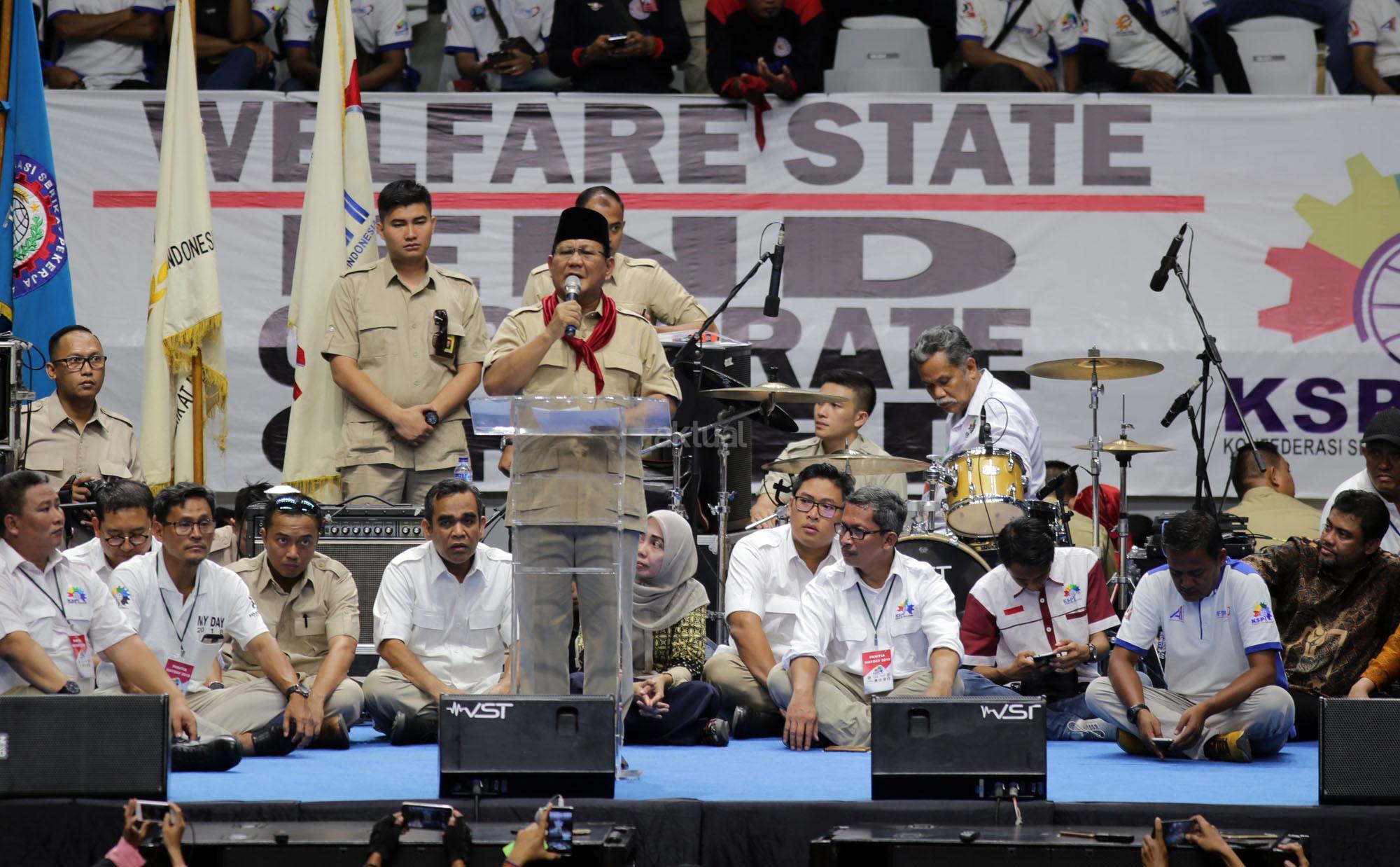 Ketua Umum Partai Gerindra Prabowo Subianto menyampaikan pidato politik saat acara deklarasi Konfederasi Serikat Pekerja Indonesia (KSPI) dukungan buruh kepada Prabowo sebagai Capres 2019 di Istora Senayan, Jakarta, Selasa (1/5/8). KSPI resmi mendukung Prabowo Subianto dalam Pilpres 2019. KSPI menyebut hanya Prabowo yang mau menandatangani kontrak politik dengan menyetujui 10 tuntutan KSPI. AKTUAL/Tino Oktaviano
