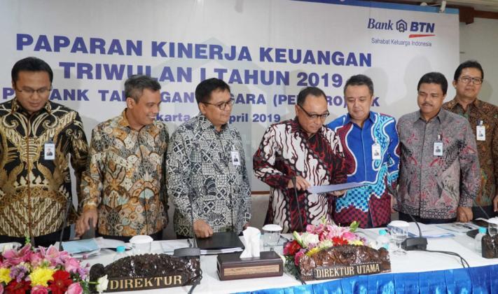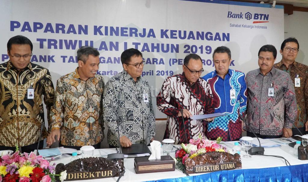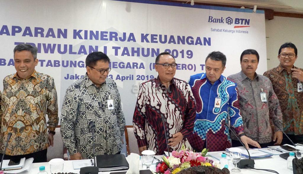 Direktur Utama PT Bank Tabungan Negara (Persero) Tbk. Maryono (tengah) bersama Jajaran Direksi Bank BTN lainnya di sela Konferensi Pers Paparan Kinerja Bank BTN Per 31 Maret 2019, di Jakarta, Selasa (23/4). AKTUAL/STR-Eko S Hilman