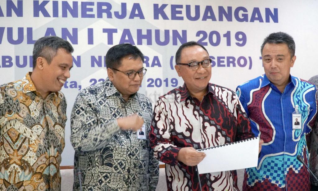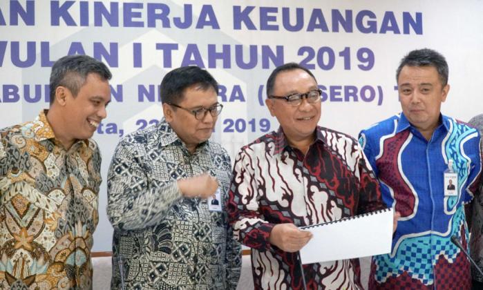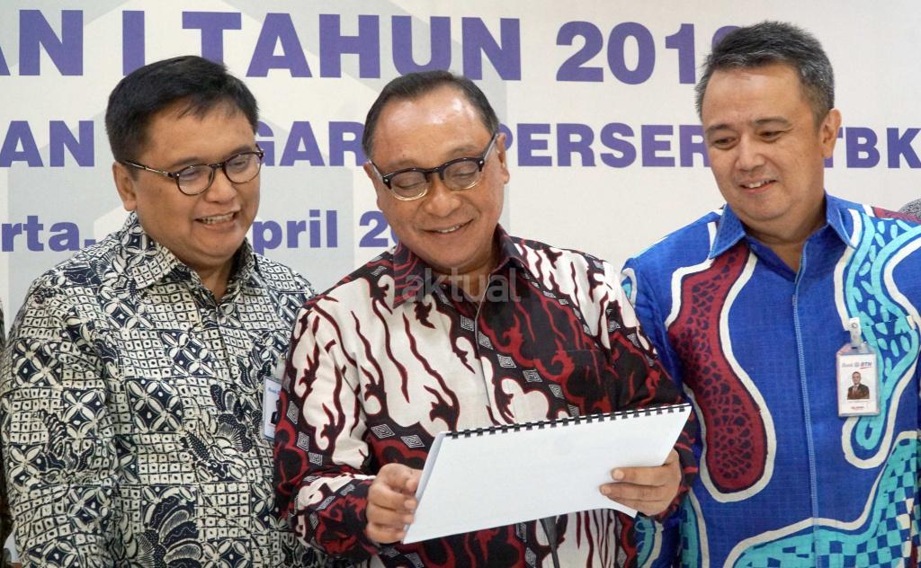 Direktur Utama PT Bank Tabungan Negara (Persero) Tbk. Maryono (tengah) bersama Jajaran Direksi Bank BTN Iman N. Soeko, dan Oni Febriarto kompak tersenyum di sela Konferensi Pers Paparan Kinerja Bank BTN Per 31 Maret 2019, di Jakarta, Selasa (23/4). AKTUAL/STR-Eko S Hilman