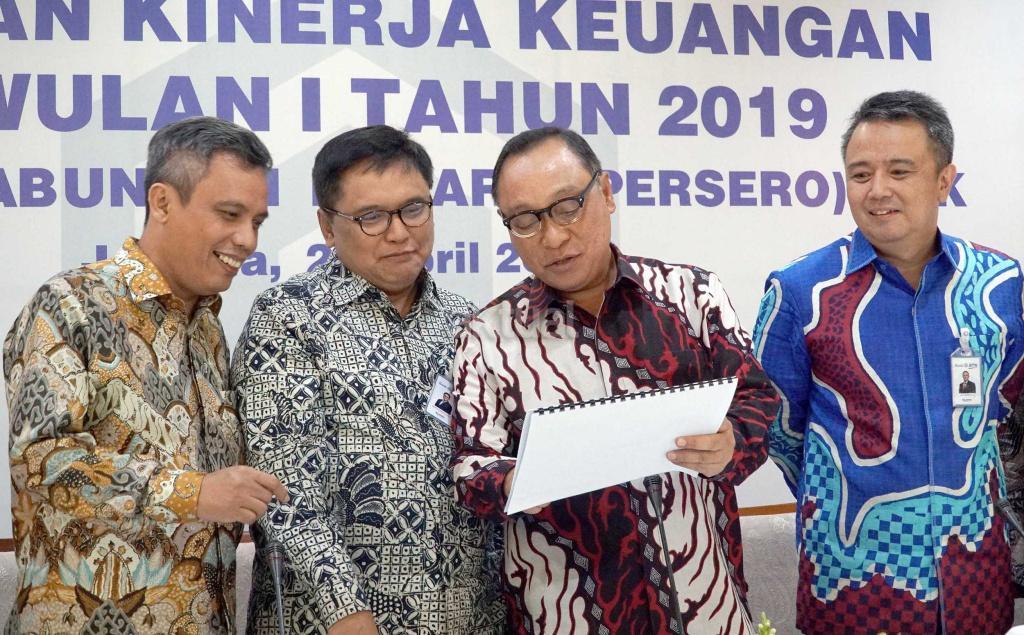 Direktur Utama PT Bank Tabungan Negara (Persero) Tbk. Maryono (kedua dari kanan) bersama Jajaran Direksi Bank BTN , Nixon L. P. Napitupulu, Iman N. Soeko, Oni Febriarto kompak tersenyum di sela Konferensi Pers Paparan Kinerja Bank BTN Per 31 Maret 2019, di Jakarta, Selasa (23/4). AKTUAL/STR-Eko S Hilman