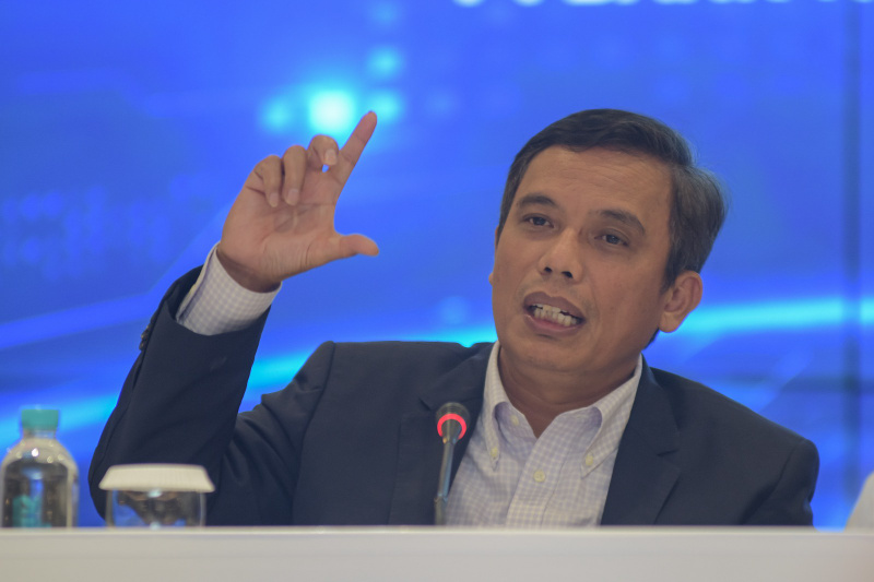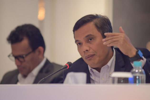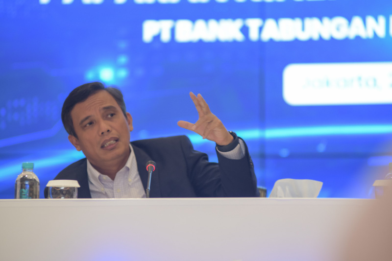 Direktur Utama BTN Nixon L.P. Napitupulu menyampaikan paparan di sela Paparan Kinerja Keuangan BTN Kuartal I/2024 di Jakarta, Kamis (25/4/2024).