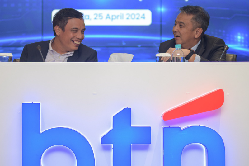 Direktur Utama BTN Nixon L.P. Napitupulu berbincang dengan Wakil Direktur Utama BTN Oni Febriarto Rahardjo , Direktur Consumer BTN Hirwandi Gafar, Direktur Finance BTN Nofry Rony Poetra, dan Direktur Distribution & Institutional Funding BTN Jasmin di sela Paparan Kinerja Keuangan BTN Kuartal I/2024 di Jakarta, Kamis (25/4/2024). BTN mencatatkan penyaluran kredit dan pembiayaan pada kuartal I/2024 tembus Rp344,2 Triliun atau tumbuh 14,8% dibanding periode yang sama tahun sebelumnya yang tercatat sebesar Rp299,7 triliun. Pertumbuhan kredit tersebut ditopang oleh kredit dan pembiayaan perumahan serta kredit bermargin tinggi (high-yield loans) yang cukup diminati oleh masyarakat. BTN telah secara konsisten menjaga momentum pertumbuhan sejak tahun lalu yang didukung oleh penajaman strategi serta transformasi bisnis secara menyeluruh. BTN juga telah melakukan rebranding logo pada kuartal I/2024 ini sebagai bentuk komitmen untuk meningkatkan kualitas layanannya dalam rangka mencapai visinya, yakni The Best Mortgage Bank in South East Asia. Aktual/TINO OKTAVIANO