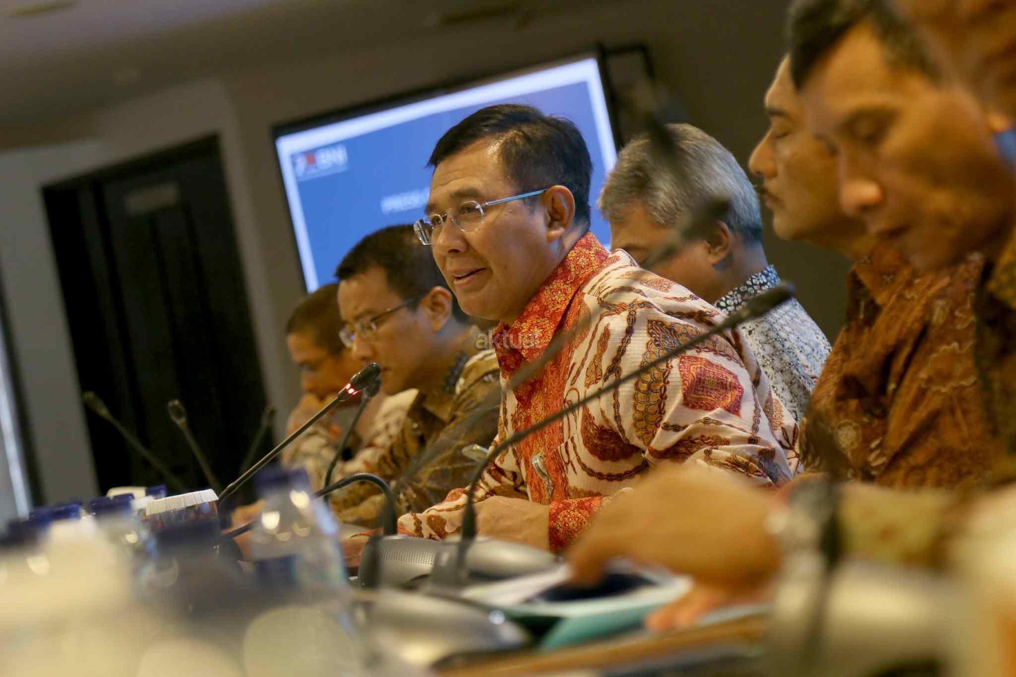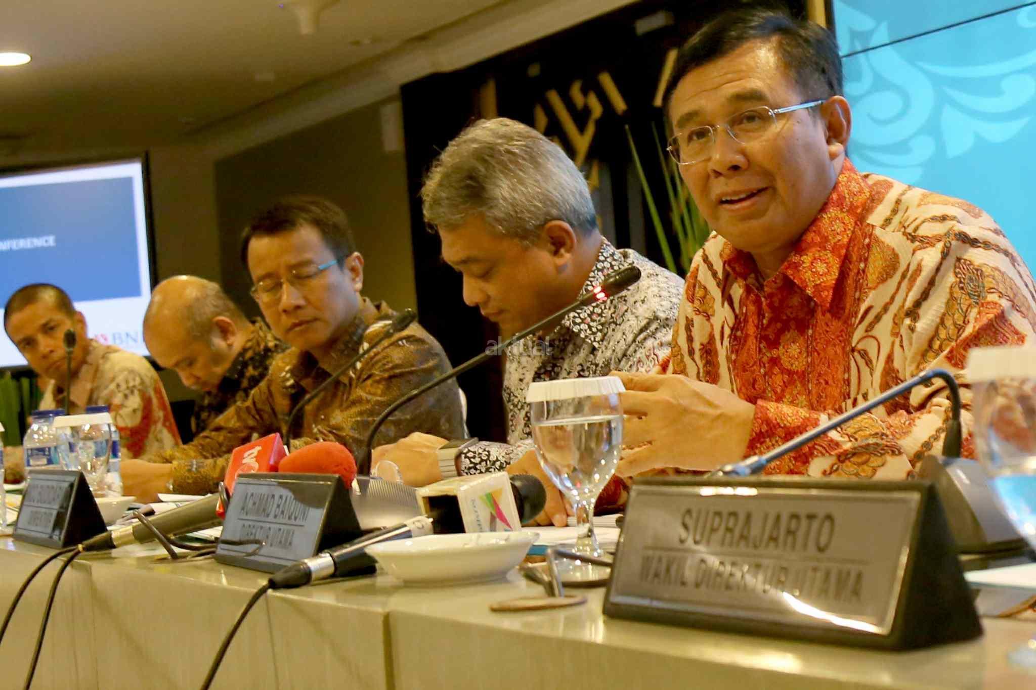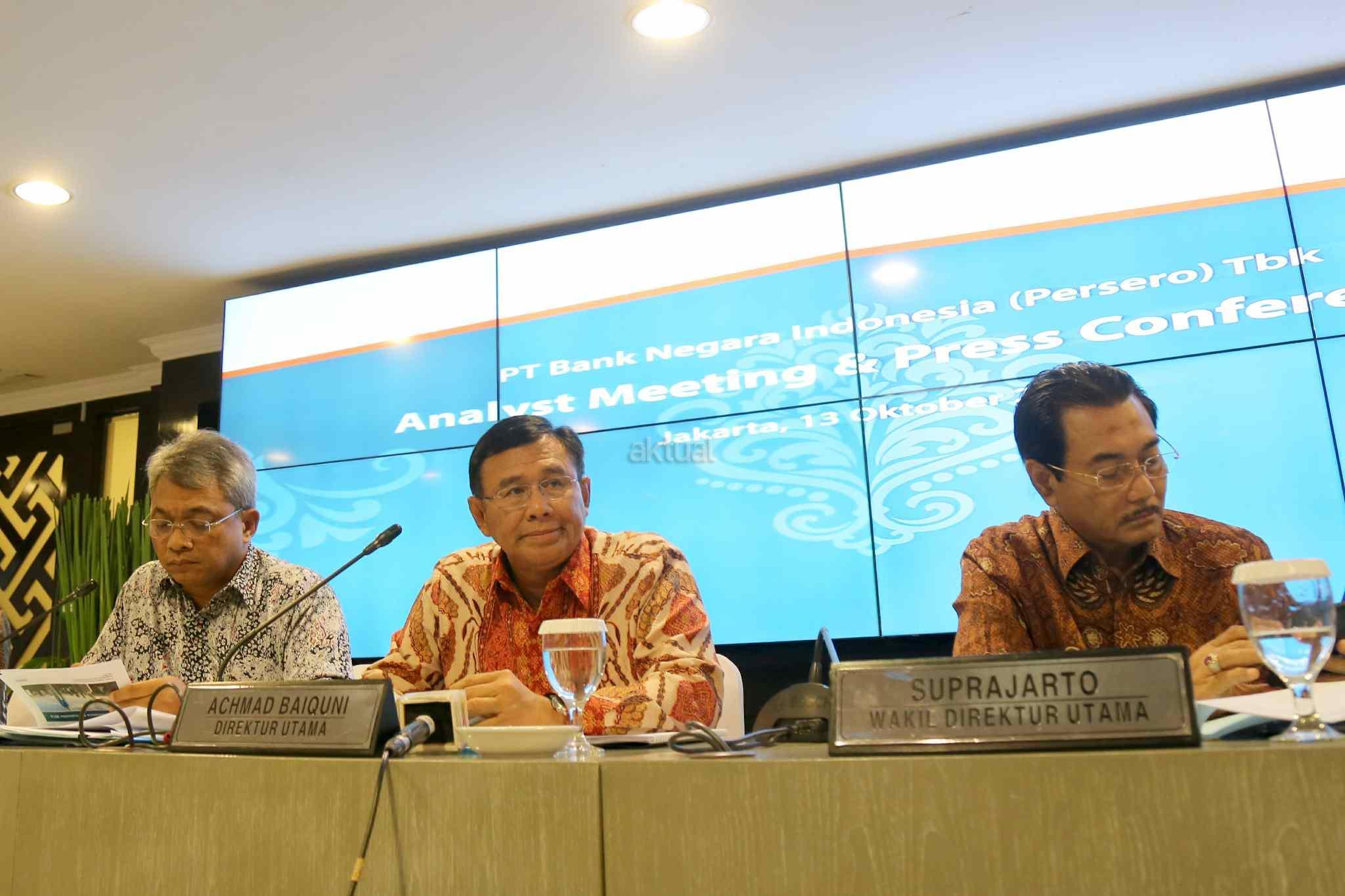 Direktur Utama PT Bank Negara Indonesia Tbk (BNI) Achmad Baiquni didampingi jajaran direksi BNI saat paparan kinerja di Jakarta, Kamis (13/10). BNI mencatatkan laba bersih sebesar Rp 7,72 triliun pada kuartal lll 2016.