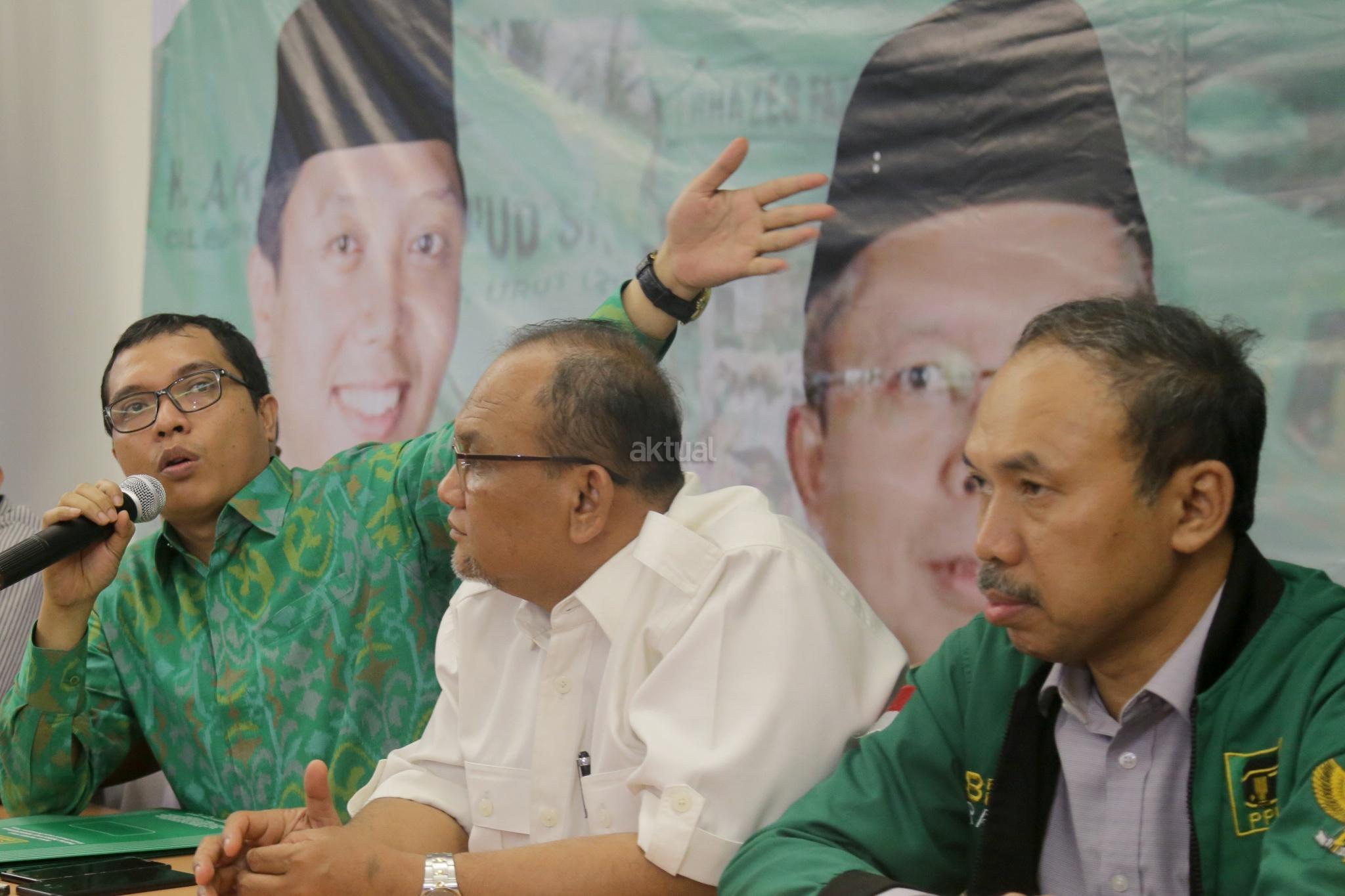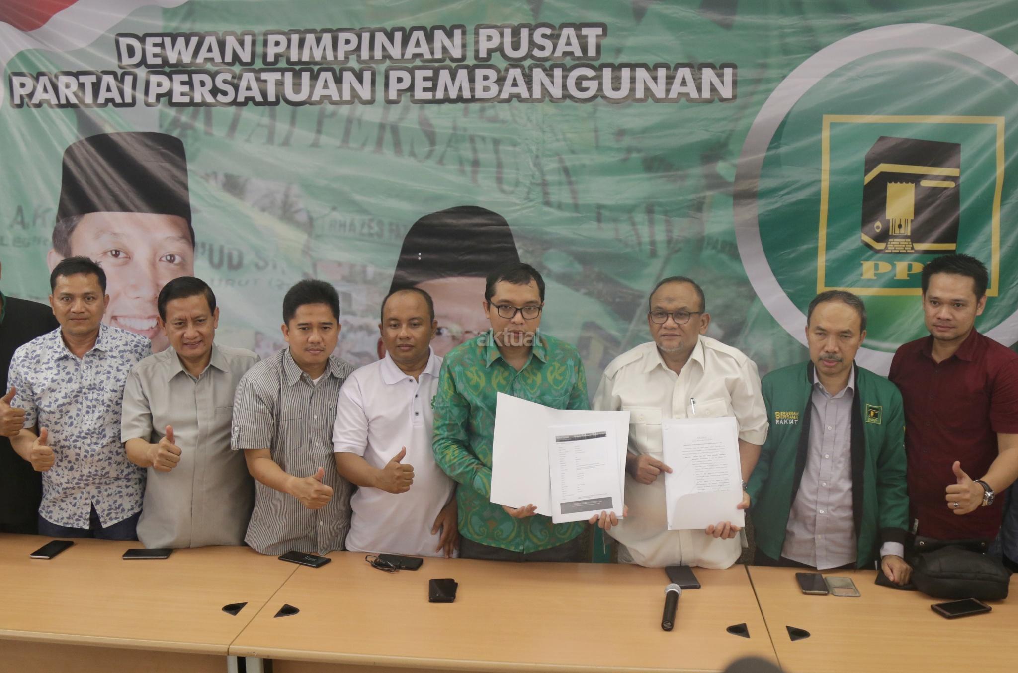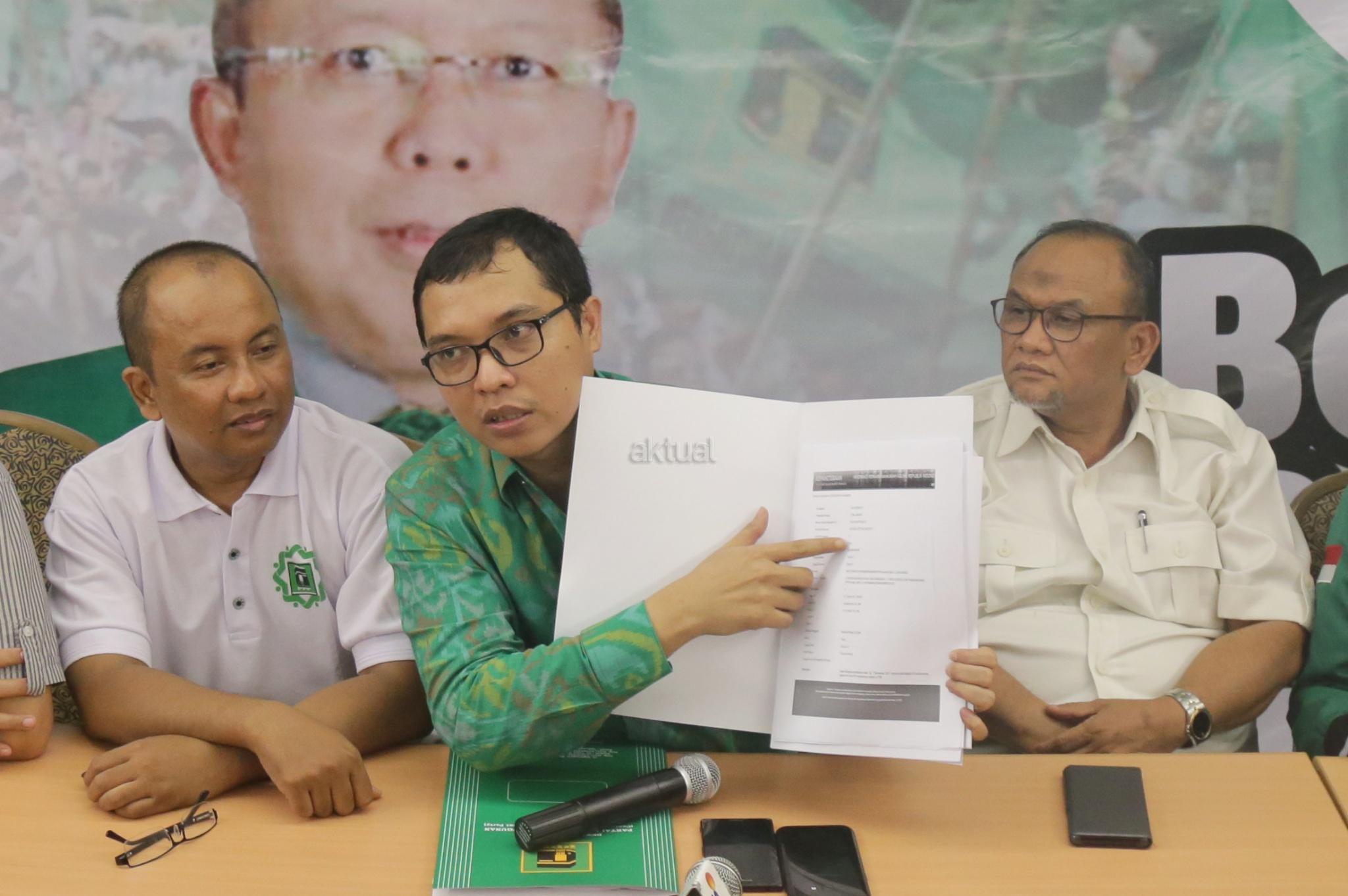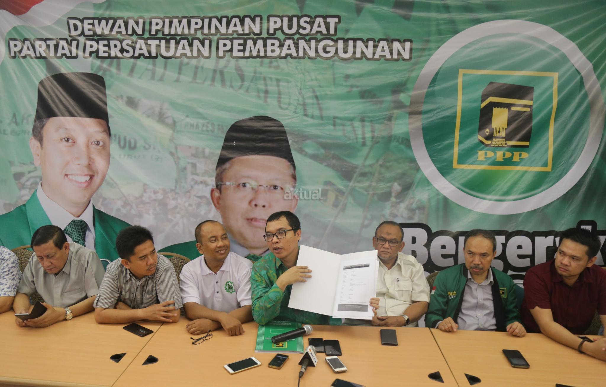 Wakil Sekjen DPP PPP Bidang Organisasi, Keanggotaan dan Kaderisasi Achmad Baidowi (tengah) didampingi Wakil Sekjen DPP PPP Hasan Husaeri Khairul Saleh, serta Ketua Departemen Hukum dan Advokasi DPP PPP Arif Sahudi menunjukan surat kasasi dari Mahkamah Agung, di Kantor DPP PPP, Jalan Diponegoro, Jakarta, Selasa (12/12). PPP kubu Romahurmuzy menduduki kantor DPP PPP di Jalan Diponegoro, setelah Mahkamah Agung menolak kasasi PPP kubu Djan Faridz dalam kasasi dengan nomor perkara 504K/TUN/2017. AKTUAL/Tino Oktaviano