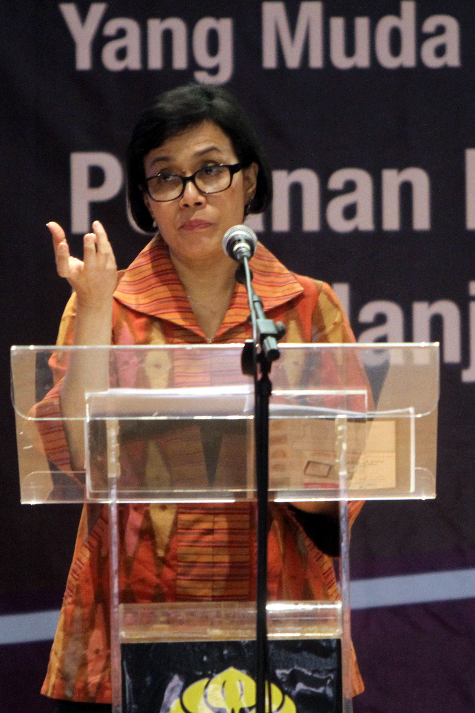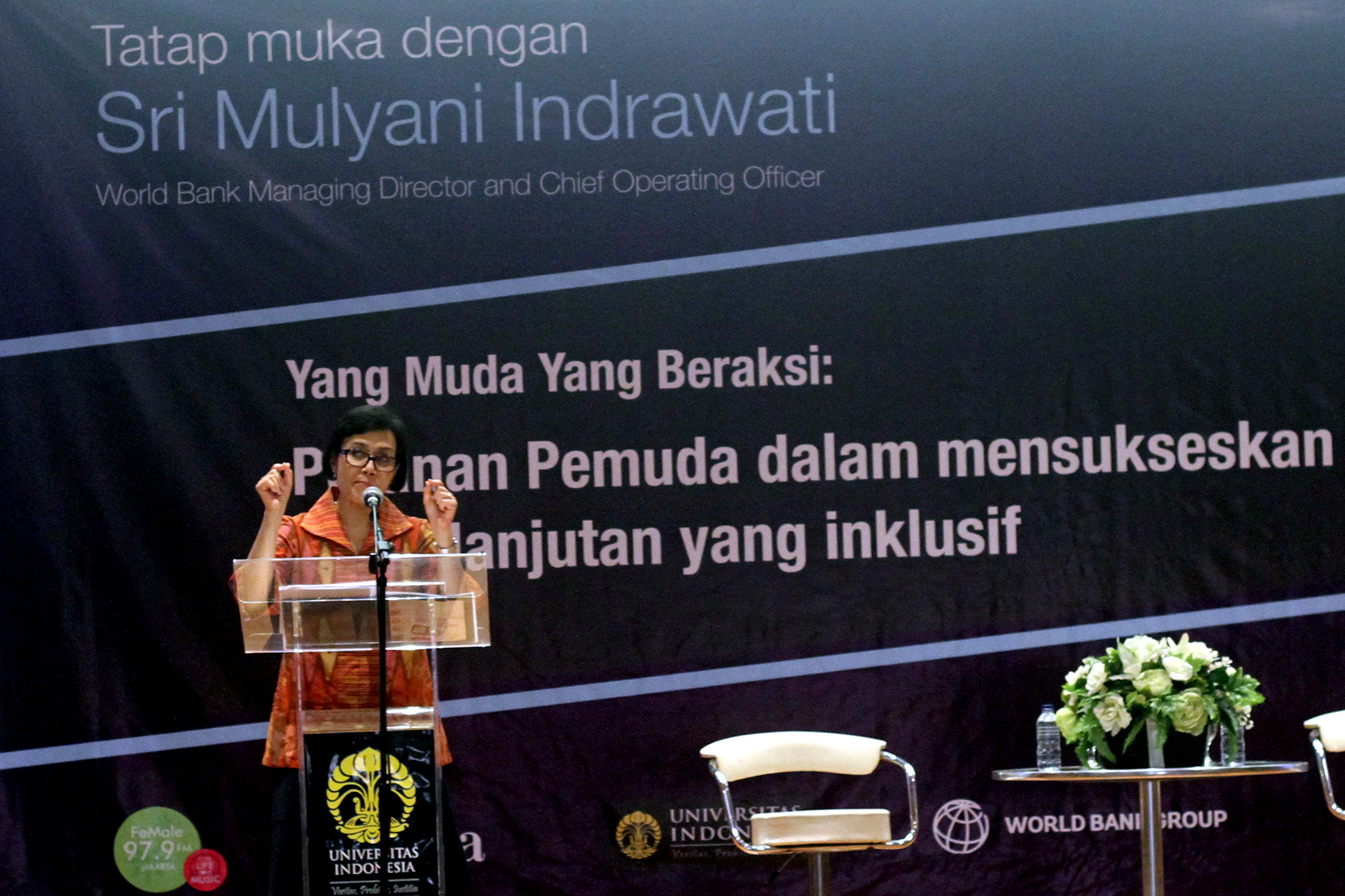 World Bank Managing Director and Chief Operating Officer Sri Mulyani Indrawati memberikan kuliah umum di Auditorium Djoko Soetono Fakultas Hukum Universitas Indonesia (FHUI), Depok, Jawa Barat, Selasa (26/7). Mantan Menteri Keuangan tersebut memberikan kuliah umum dengan tema “Yang Muda Yang Beraksi: Peran Pemuda untuk Mencapai Pembangunan Berkelanjutan yang Inklusif”. ANTARA FOTO/Yulius Satria Wijaya/kye/16