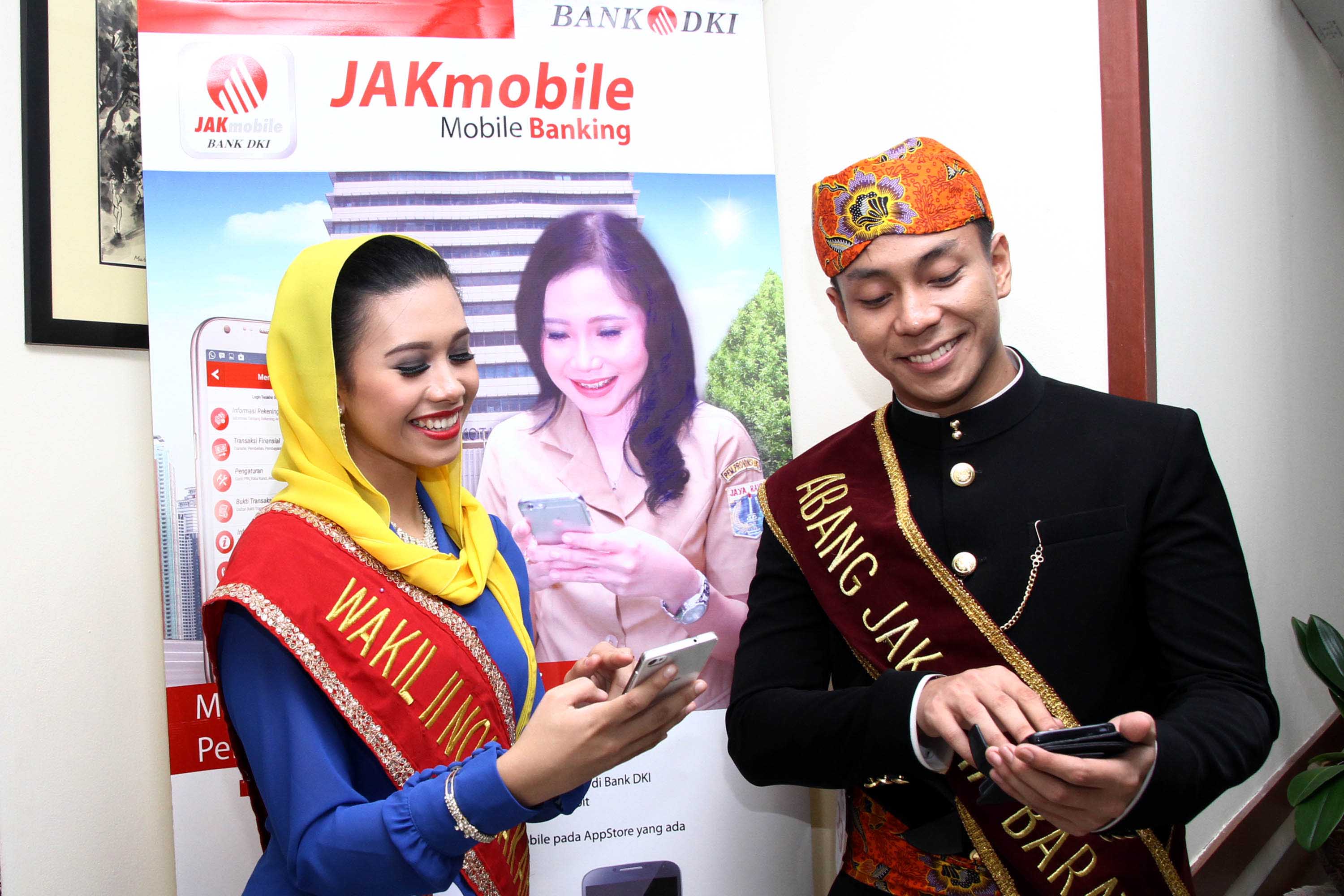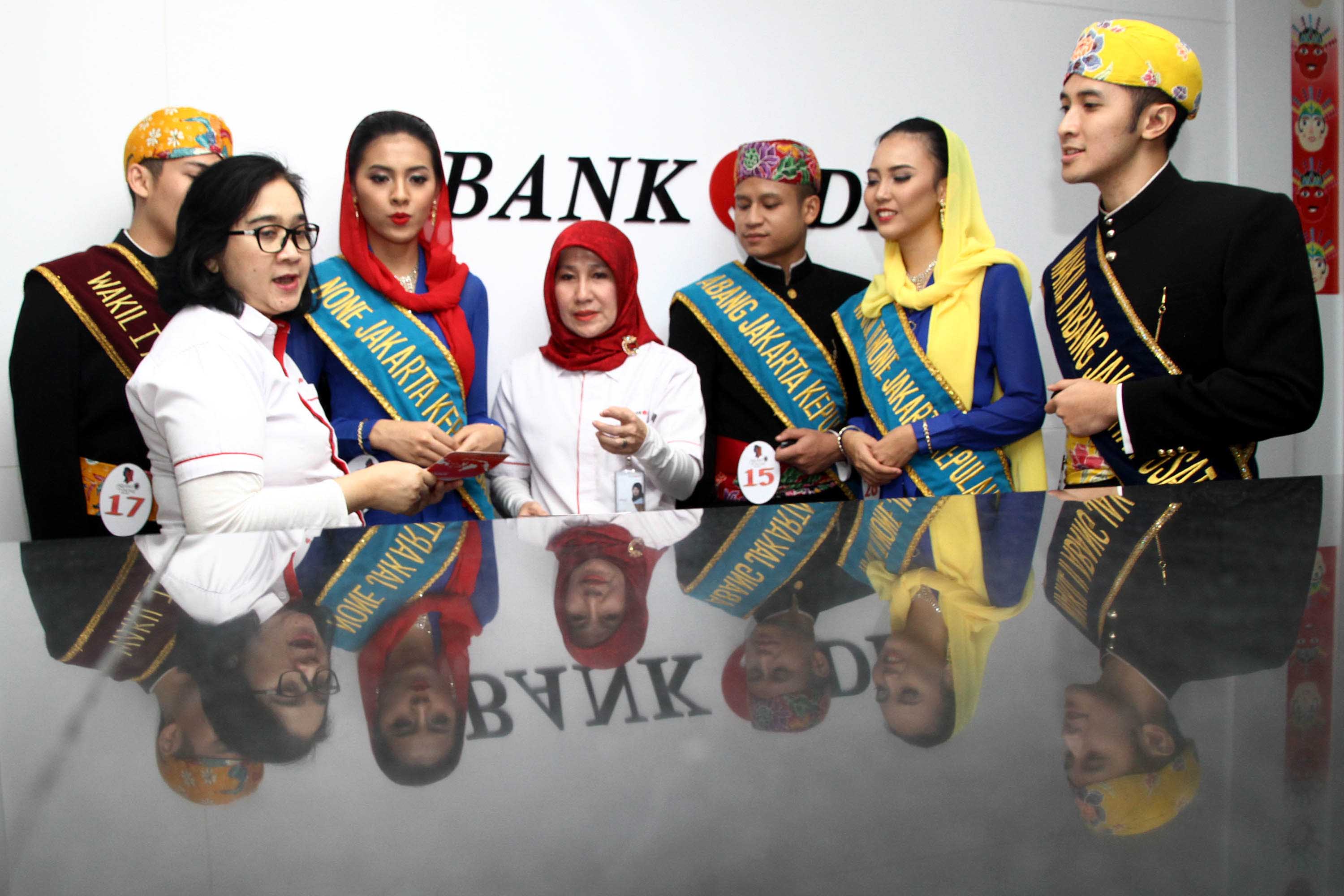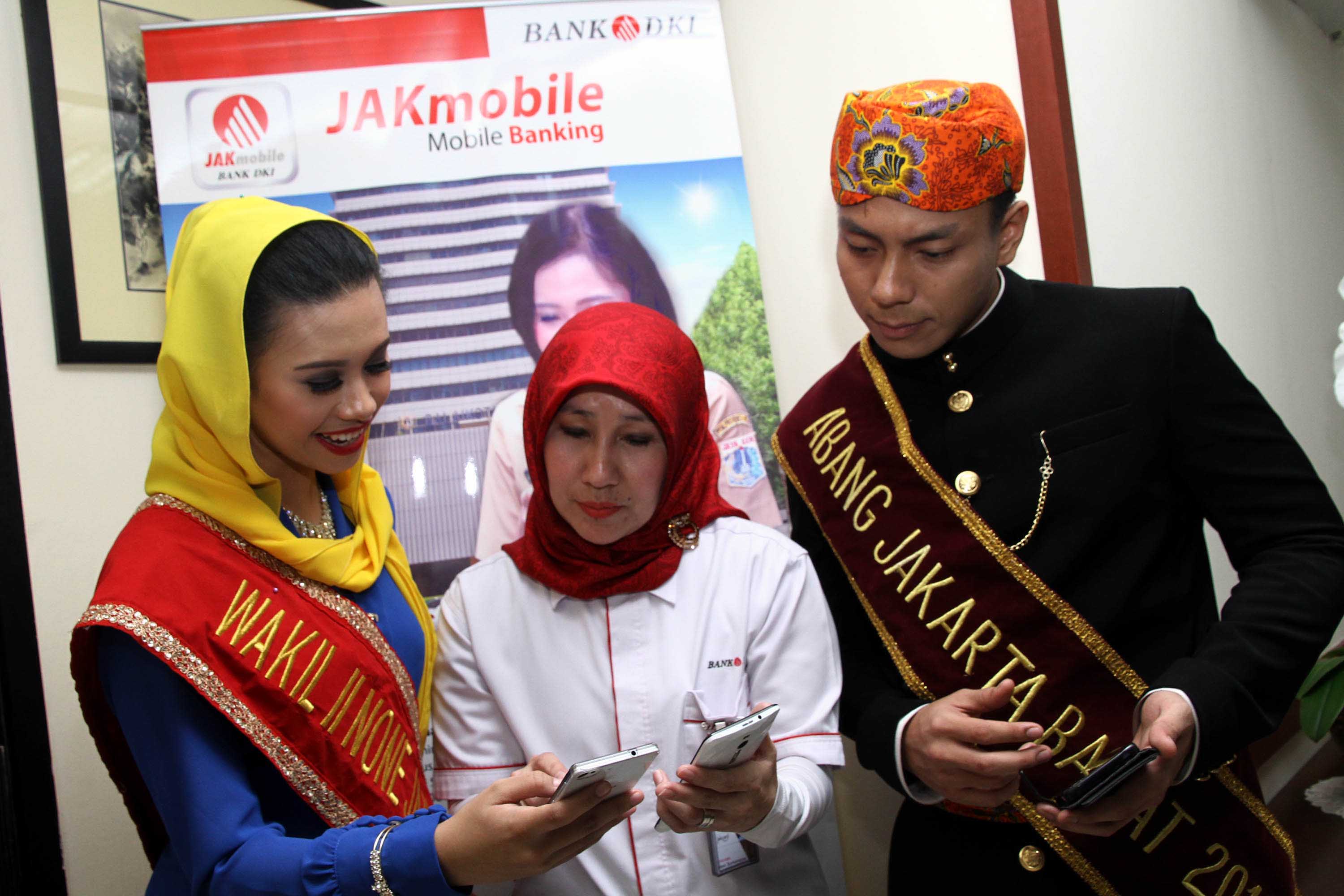Finalis Abang None Jakarta 2016 melakukan simulasi mengenai produk JakMobile saat melakukan kunjungan ke Bank DKI Cabang Balai Kota, Jakarta, Rabu (3/8). Para finalis Abang dan None Jakarta 2016, selain dituntut memiliki wajah serta fisik yang rupawan, juga dituntut untuk memiliki otak yang cerdas. Pasalnya, para peserta dengan usia kisaran 18 hingga 25 tahun yang terpilih menjadi finalis merupakan perwakilan generasi muda Jakarta yang inspiratif dan memiliki semangat untuk memajukan Ibu Kota.