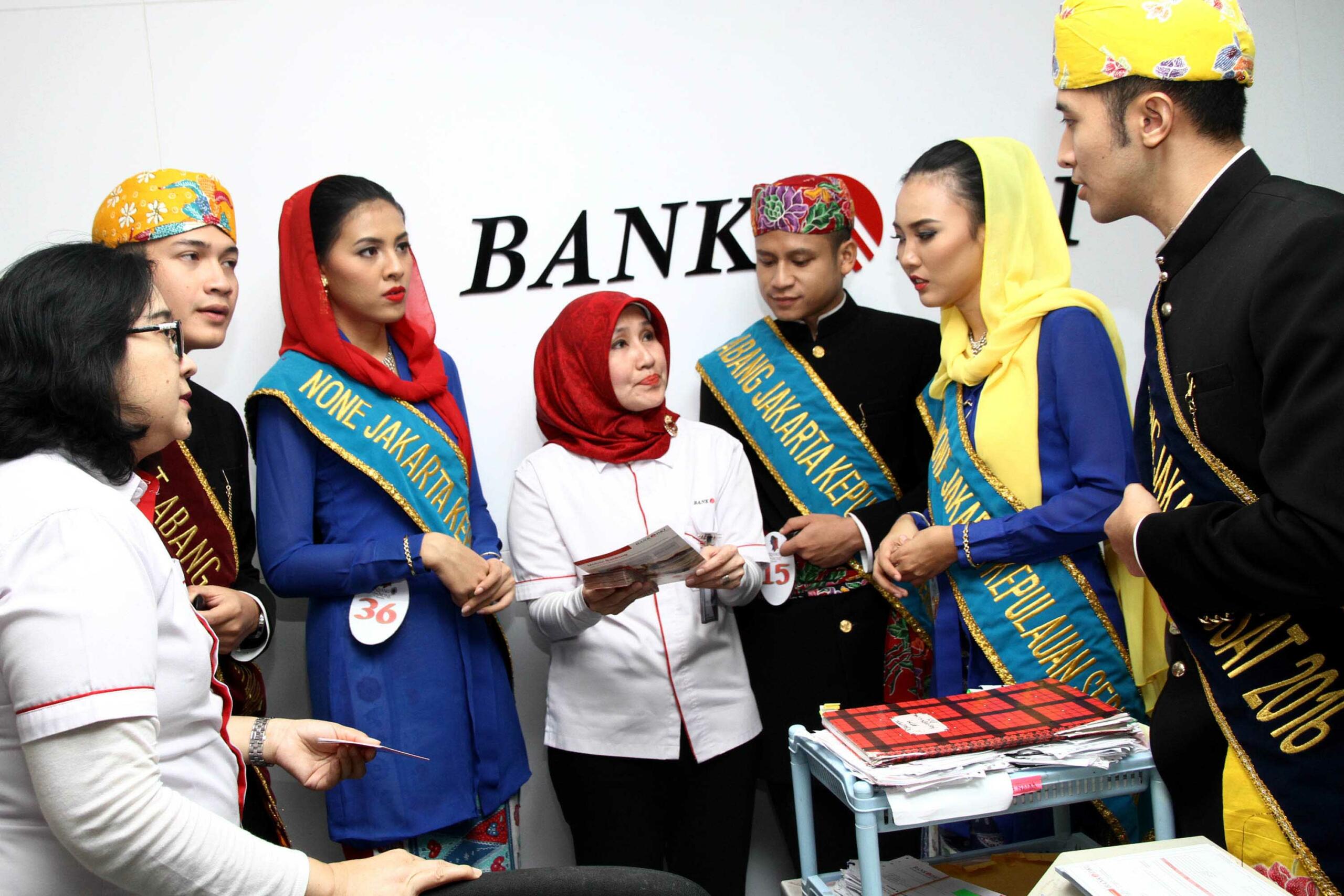 Sejumlah finalis Abang None Jakarta 2016 saat melakukan kunjungan ke Bank DKI Cabang Balai Kota, Jakarta, Rabu (3/8). Para finalis Abang dan None Jakarta 2016, selain dituntut memiliki wajah serta fisik yang rupawan, juga dituntut untuk memiliki otak yang cerdas. Pasalnya, para peserta dengan usia kisaran 18 hingga 25 tahun yang terpilih menjadi finalis merupakan perwakilan generasi muda Jakarta yang inspiratif dan memiliki semangat untuk memajukan Ibu Kota.