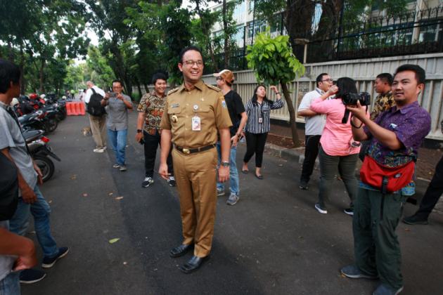 Gubernur DKI Jakarta Anies Baswedan berbincang dengab pewarta foto di Balai Pewarta Foto Indonesia Pos Pol HI di Jakarta Pusat, Senin (22/4/2019). Kedatangan Gubernur DKI Jakarta Anies Baswedan di Bundaran HI untuk melihat fasilitas publik di Jakarta. AKTUAL/POOL PFI