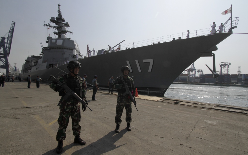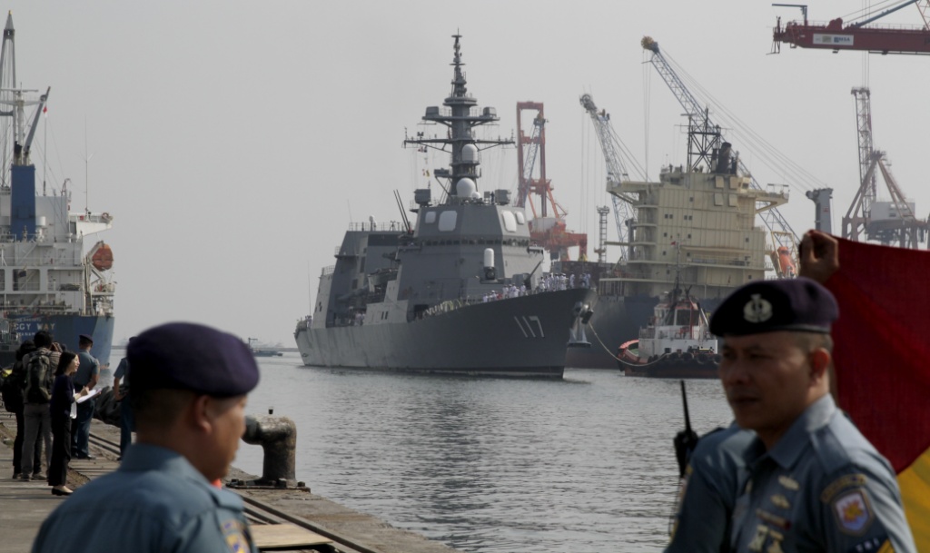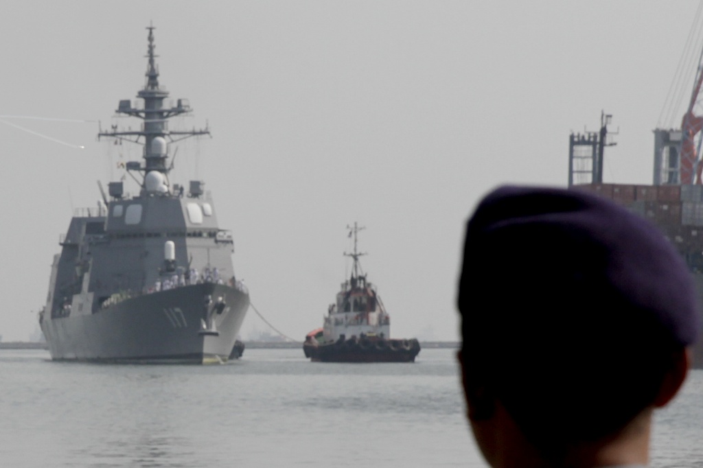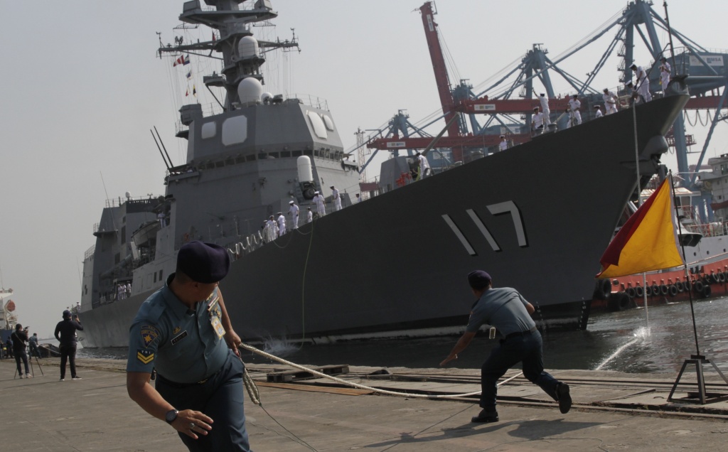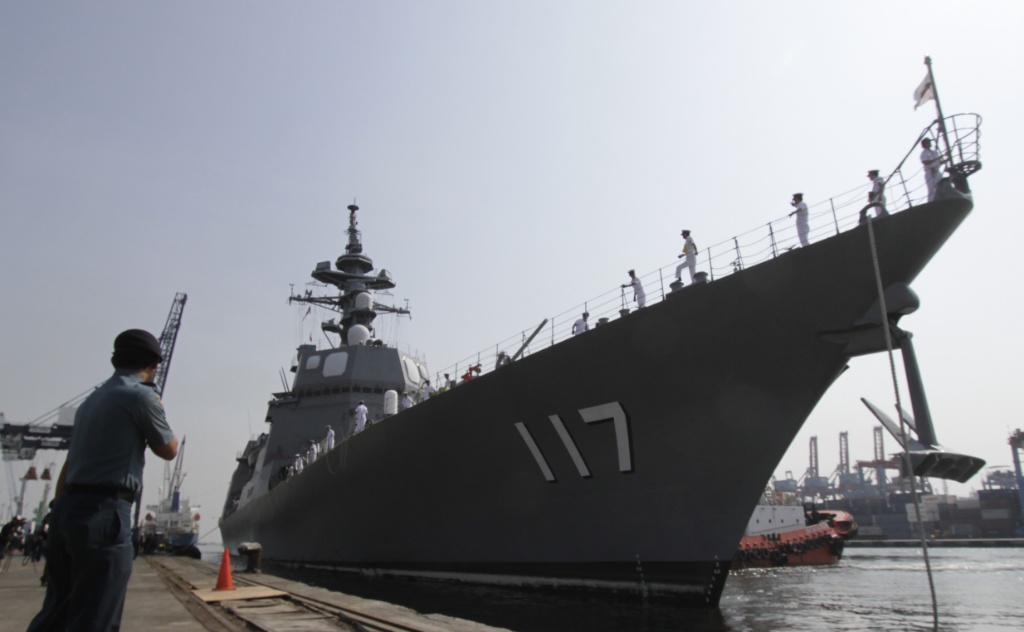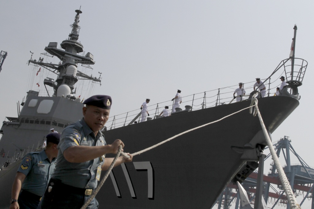 Anggota TNI Angkatan Laut membantu kapal perang Jepang JS Suzutsuki bersandar di Pelabuhan Tanjung Priok, Jakarta, Selasa (18/9). Tiga unit kapal perang milik Angkatan Laut Jepang, JS Kaga, JS Inazuma dan JS Suzutsuki singgah di perairan teluk Jakarta untuk mengikuti latihan bersama sejumlah angkatan laut dari beberapa negara Asia-Pasifik guna meningkatkan kapasitas strategis pasukan serta meningkatkan kerja sama antarnegara. AKTUAL/Tino Oktaviano
