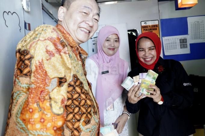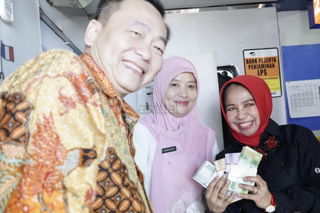 Direktur BCA Santoso (kiri) bersama Deputi Gubernur Bank Indonesia Rosmaya Hadi (kanan) di tengah acara Kunjungan Layanan Penukaran Uang “Rupiah untuk Negeri: Titik Sinergi Bank Indonesia dan Perbankan Melayani Negeri” yang diinisiasi oleh Anggota Dewan Gubernur Bank Indonesia dalam kegiatan kas keliling terpadu Bank Indonesia di Jakarta, Jumat (17/5/2019). AKTUAL/STR-Eko S Hilman