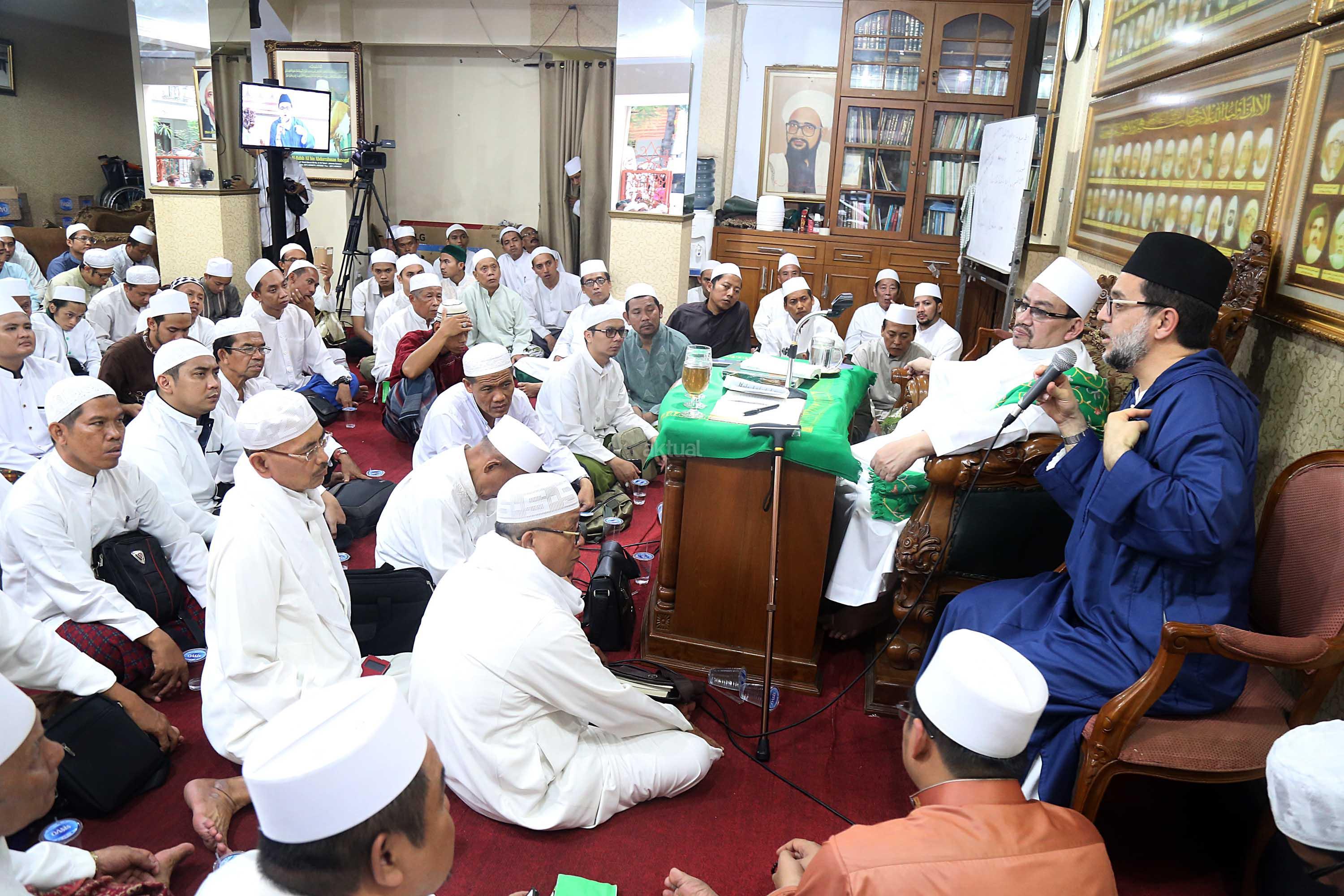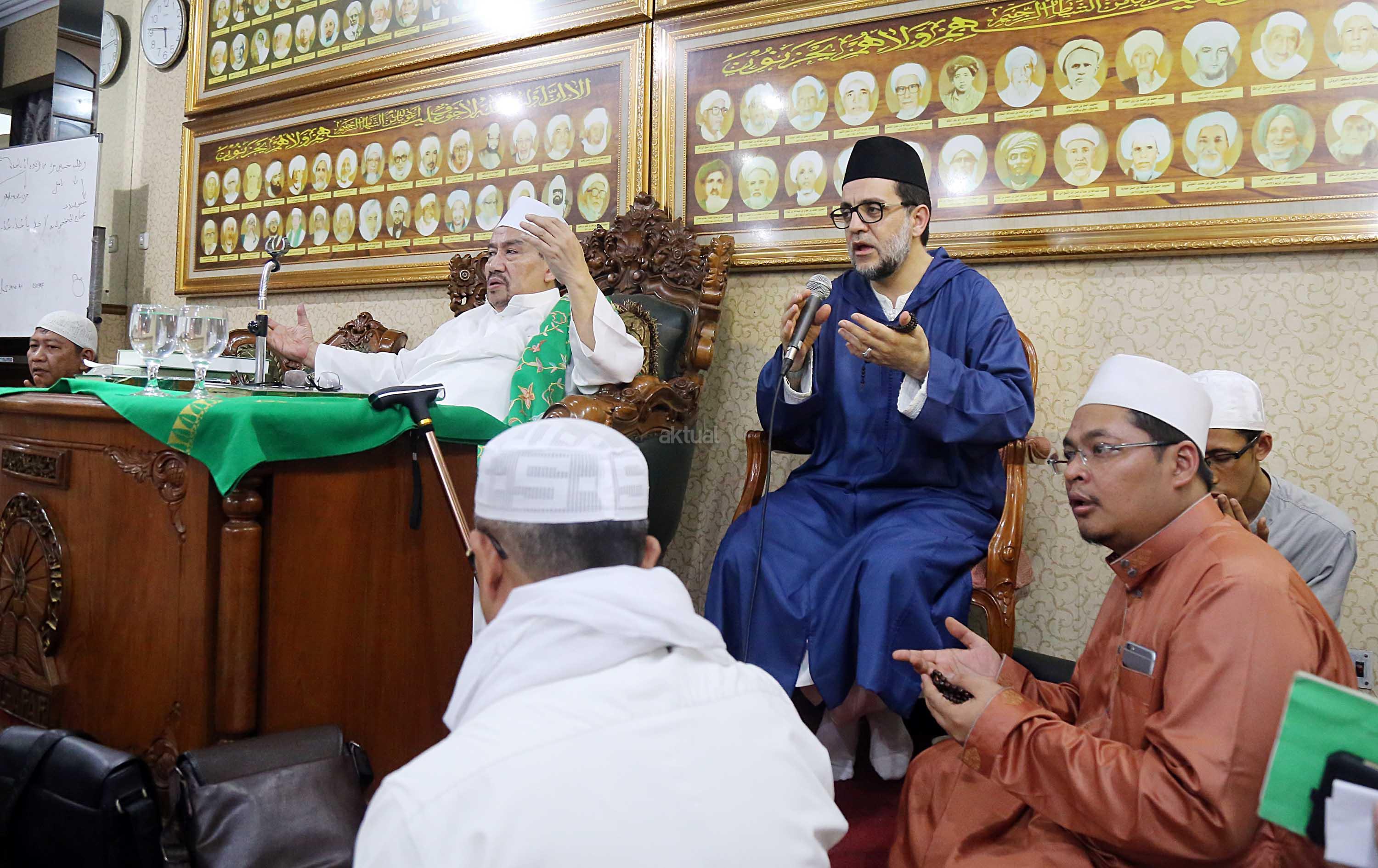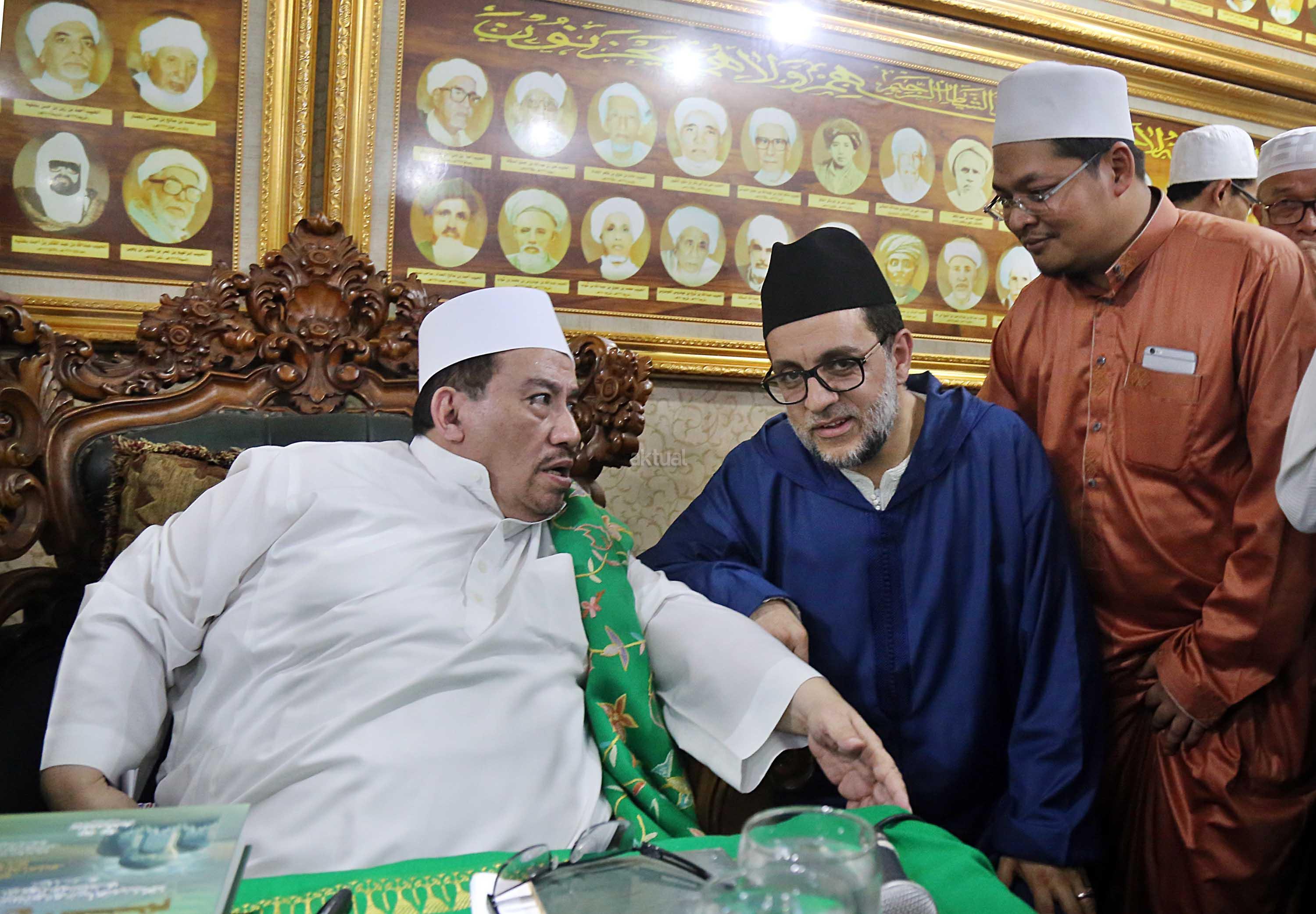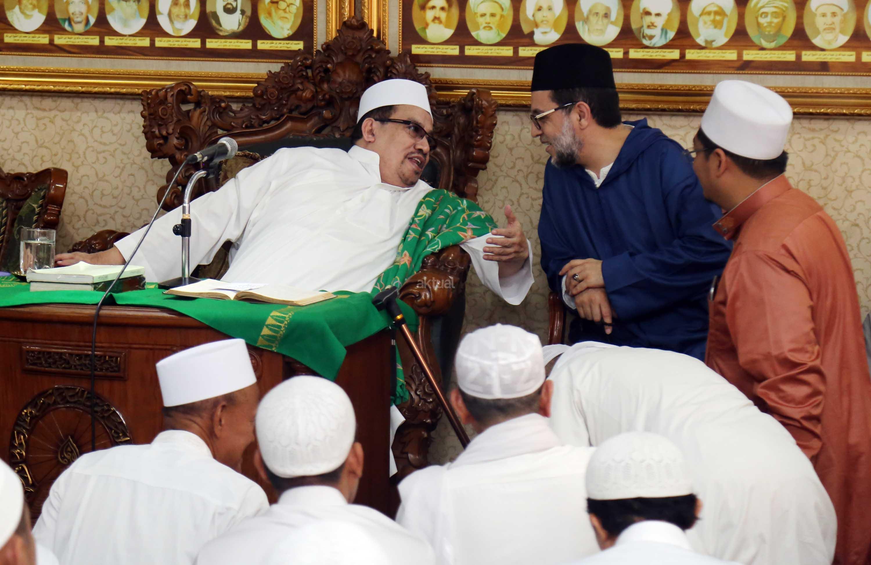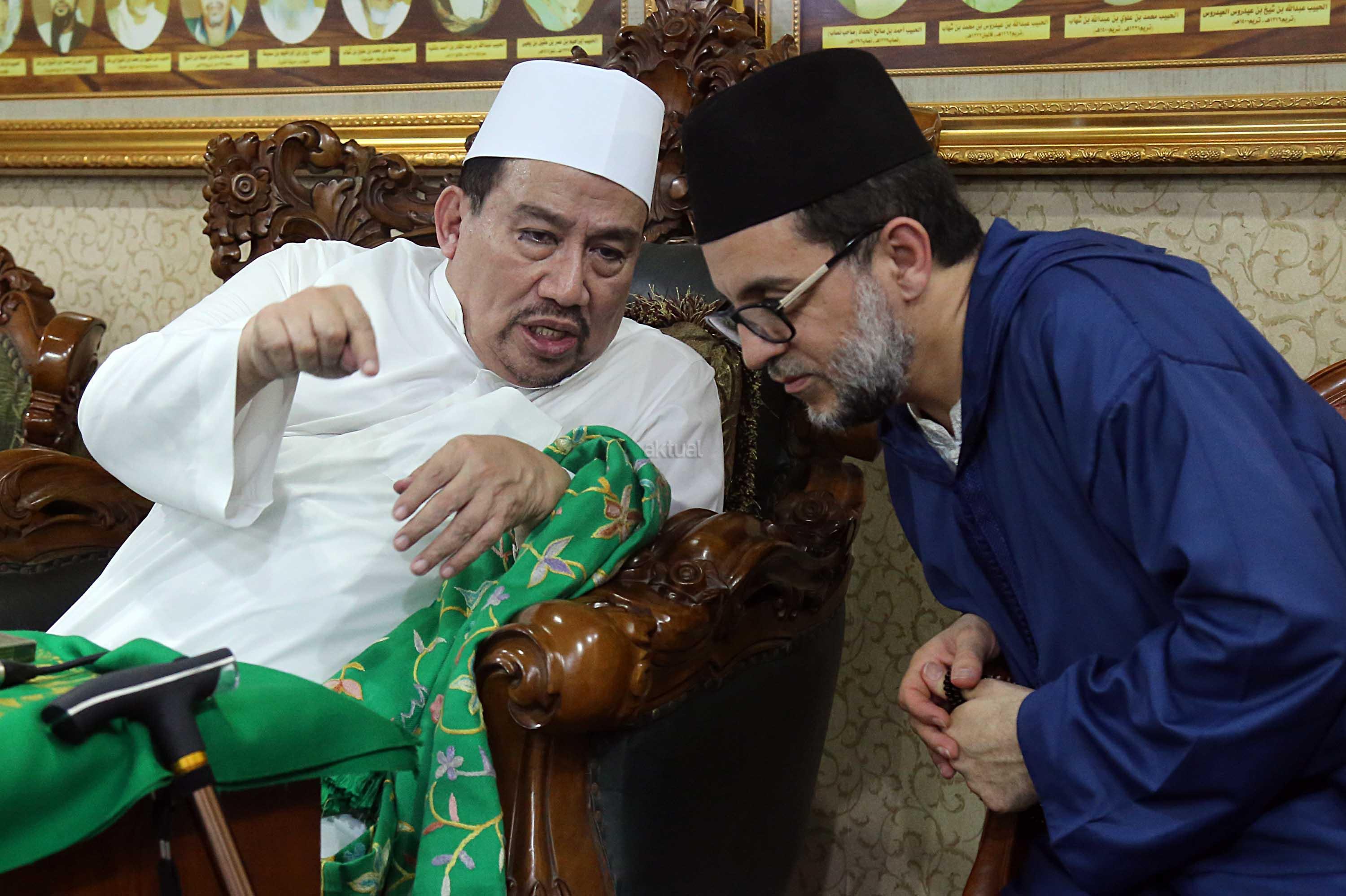 Sayyidil Walid AlHabib Ali bin Abdurrahman bin Ahmad Assegaf (kiri) berbincang dengan Maulana Syekh Dr Abdul Mun’im bin Abdul Aziz bin Shiddiq Al-Ghumari didampingi Khodim Zawiyah Arraudhah Muhammad Danial Nafis di Majelis ta'lim Al'afaf Lil Habib Ali bin Abdurrahman Assegaf Jalan Tebet Utara, Jakarta Selatan, Sabtu (13/5/2017). AKTUAL/Tino Oktaviano
