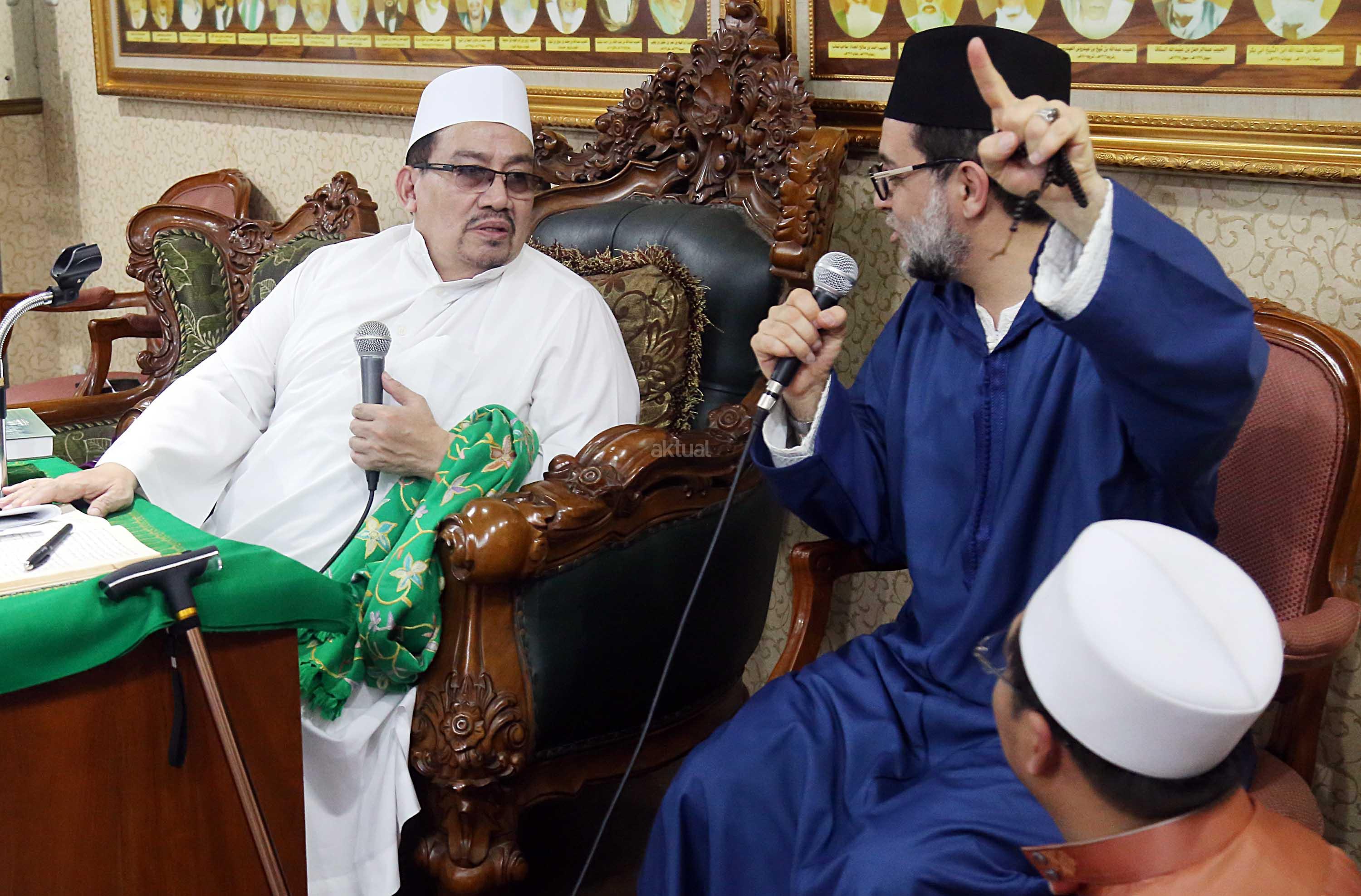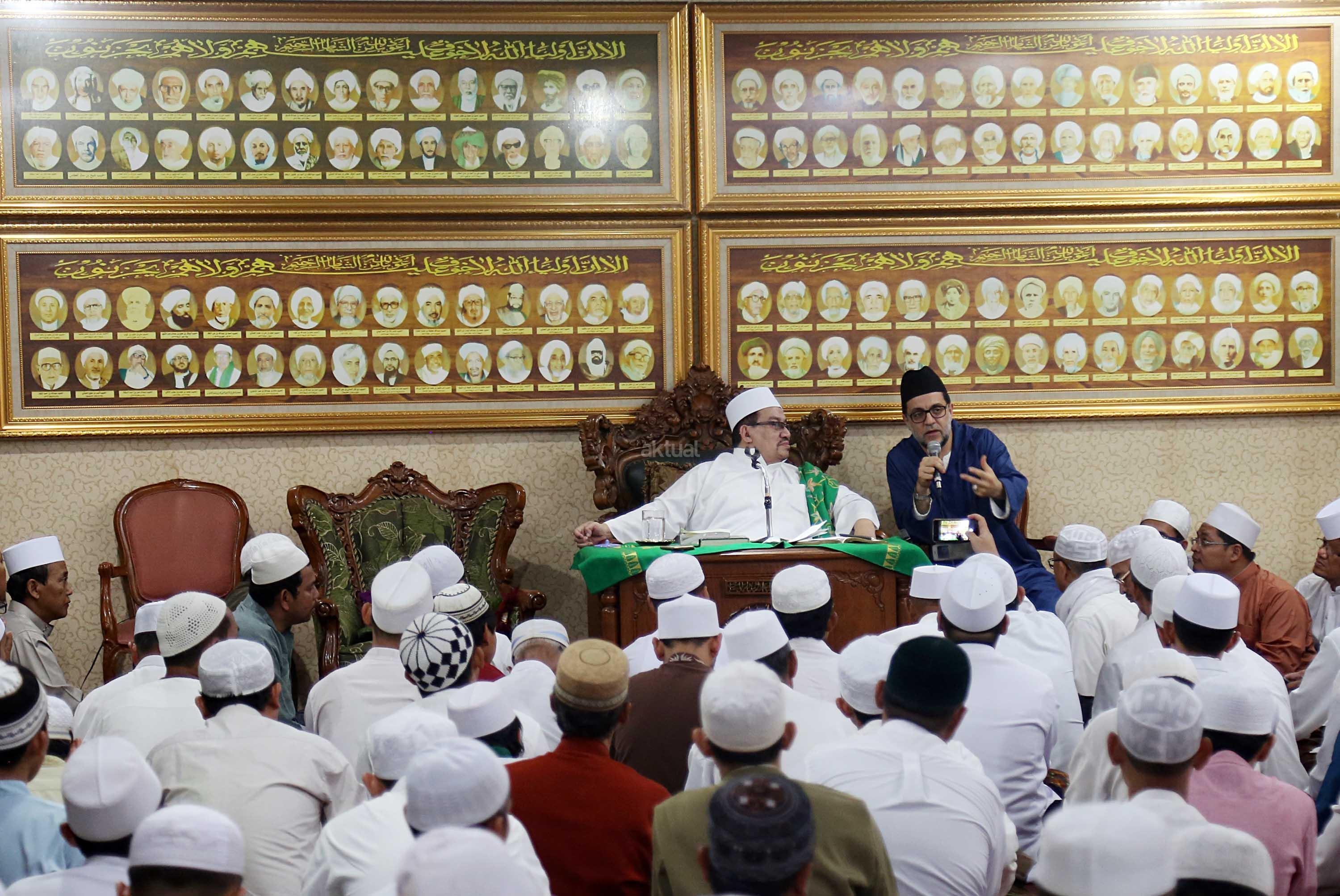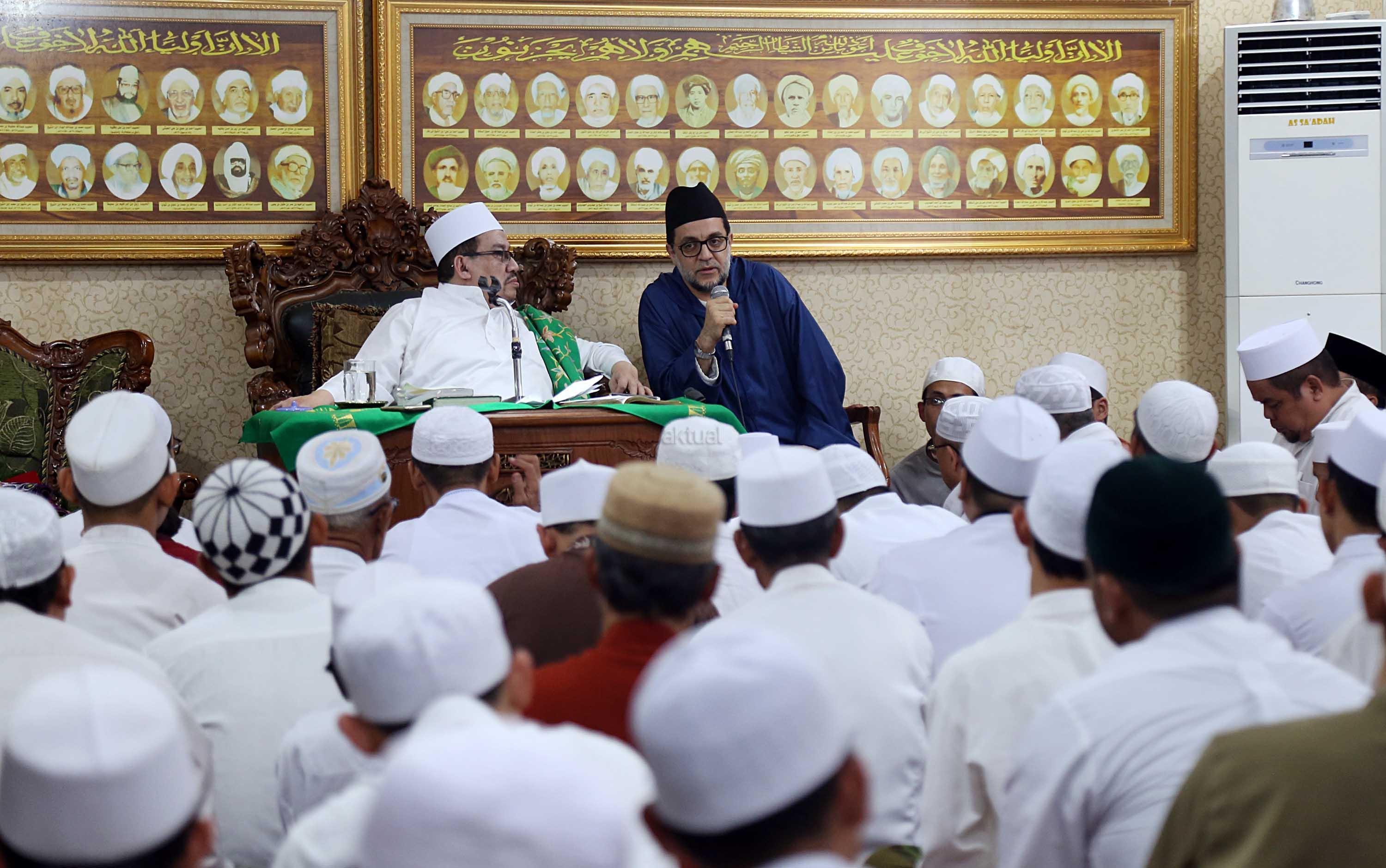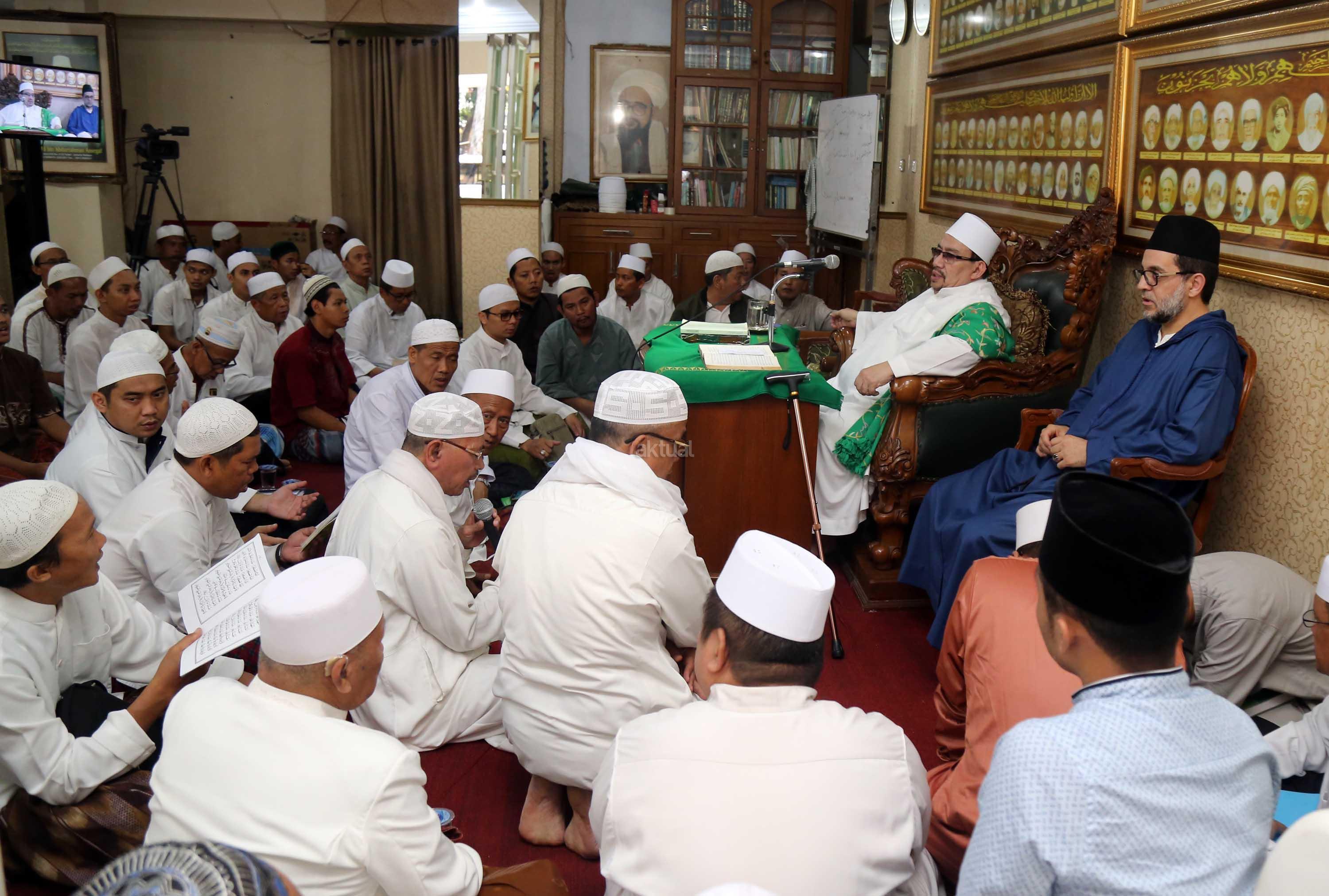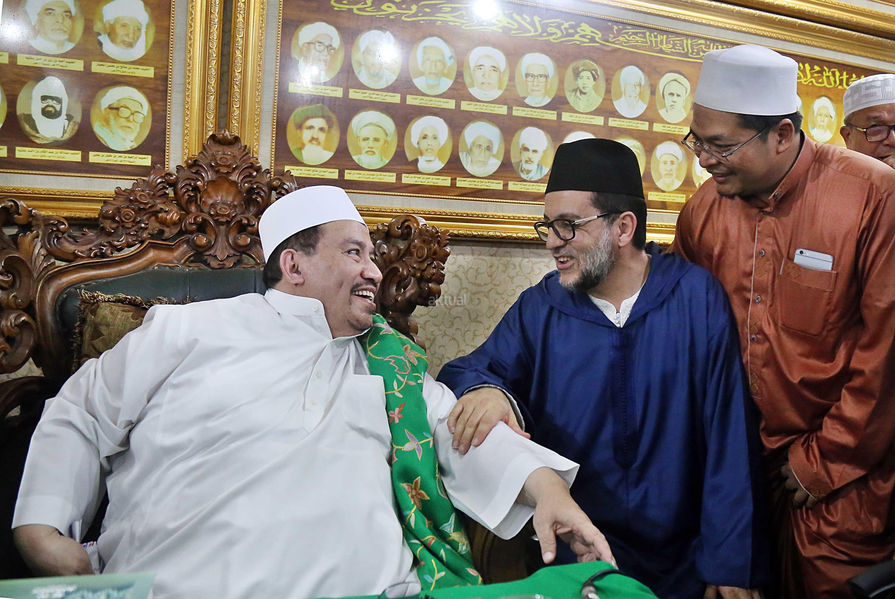 Sayyidil Walid AlHabib Ali bin Abdurrahman bin Ahmad Assegaf (kiri) berbincang dengan Maulana Syekh Dr Abdul Mun’im bin Abdul Aziz bin Shiddiq Al-Ghumari didampingi Khodim Zawiyah Arraudhah Muhammad Danial Nafis di Majelis ta'lim Al'afaf Lil Habib Ali bin Abdurrahman Assegaf Jalan Tebet Utara, Jakarta Selatan, Sabtu (13/5/2017). AKTUAL/Tino Oktaviano
