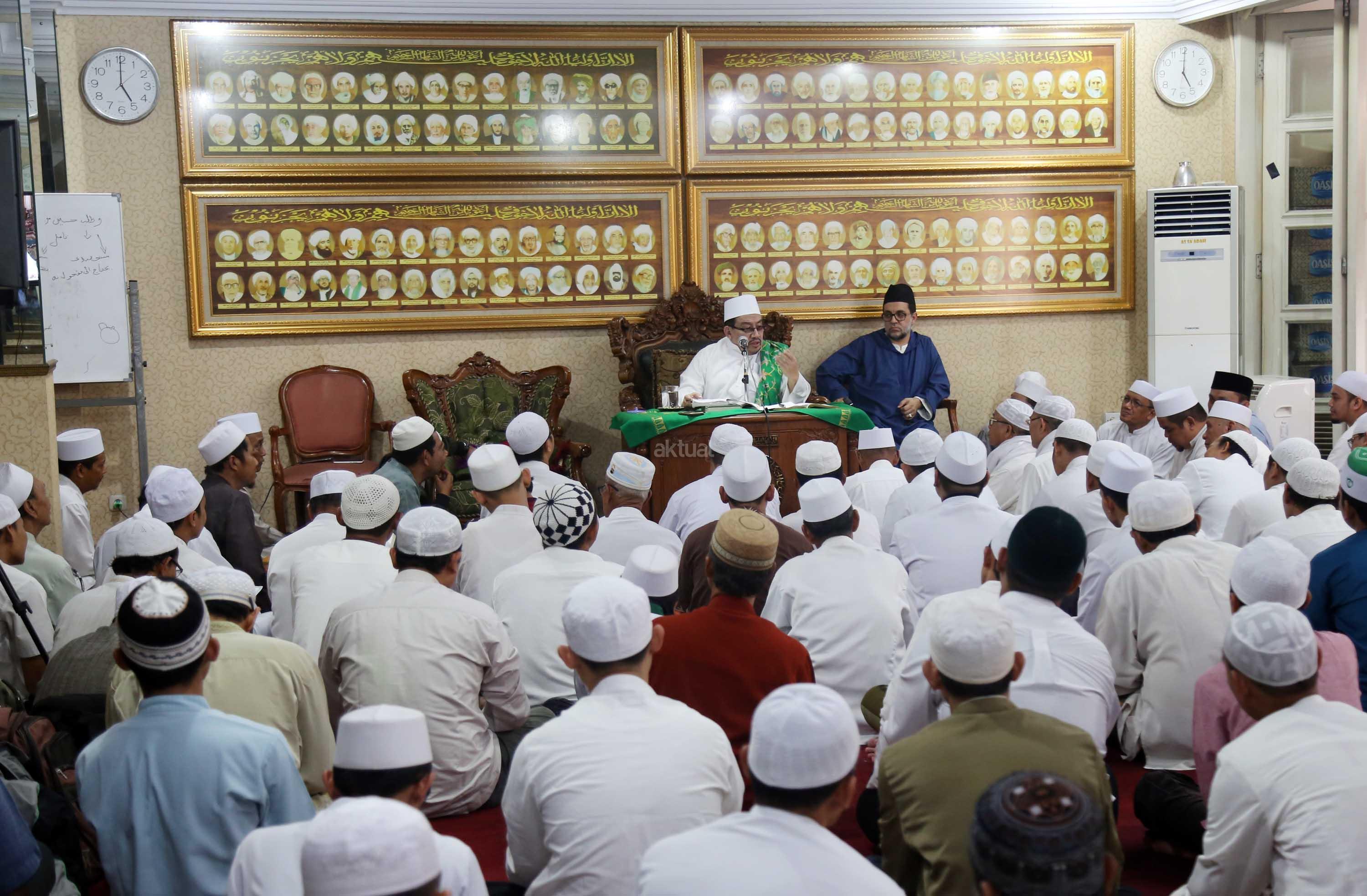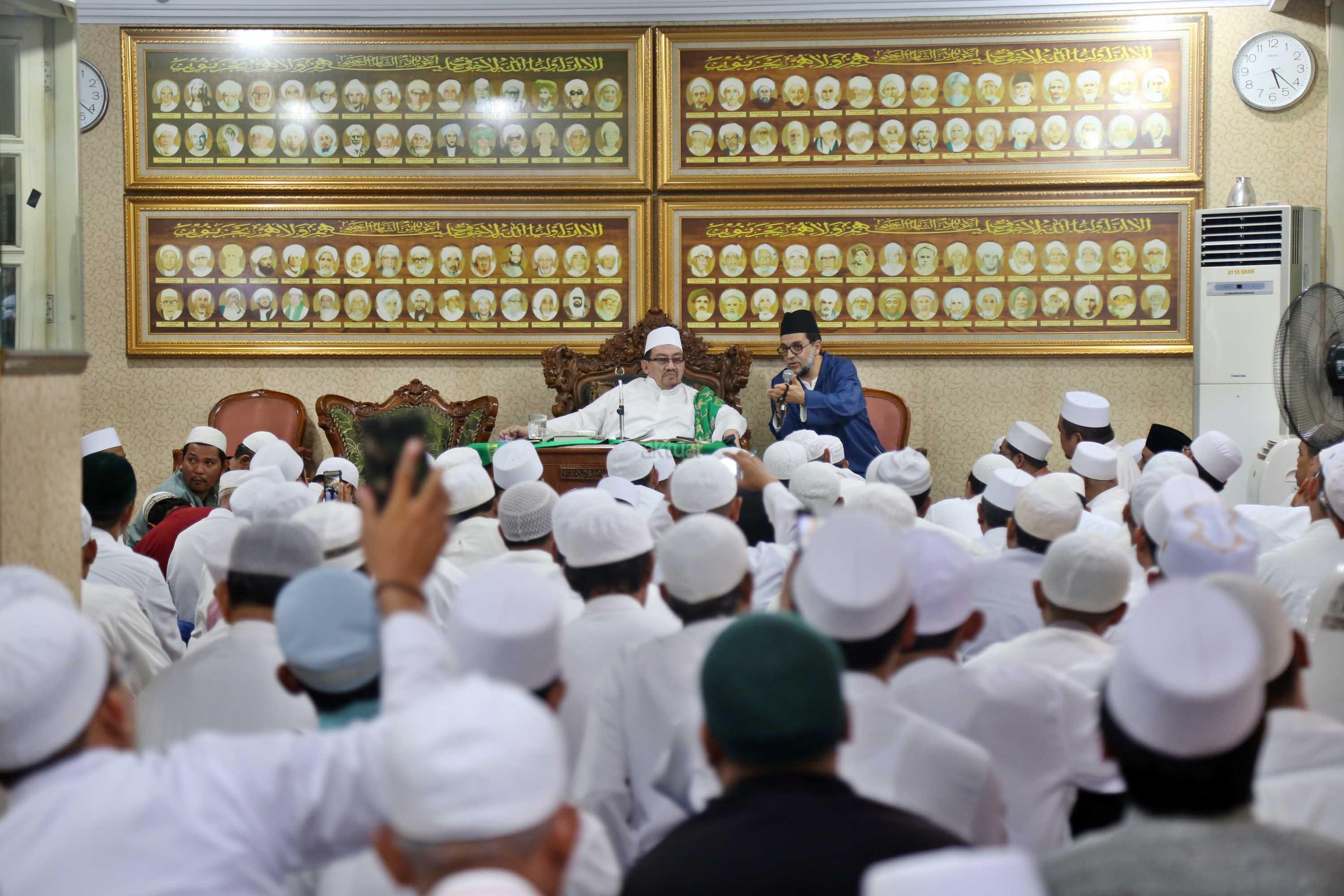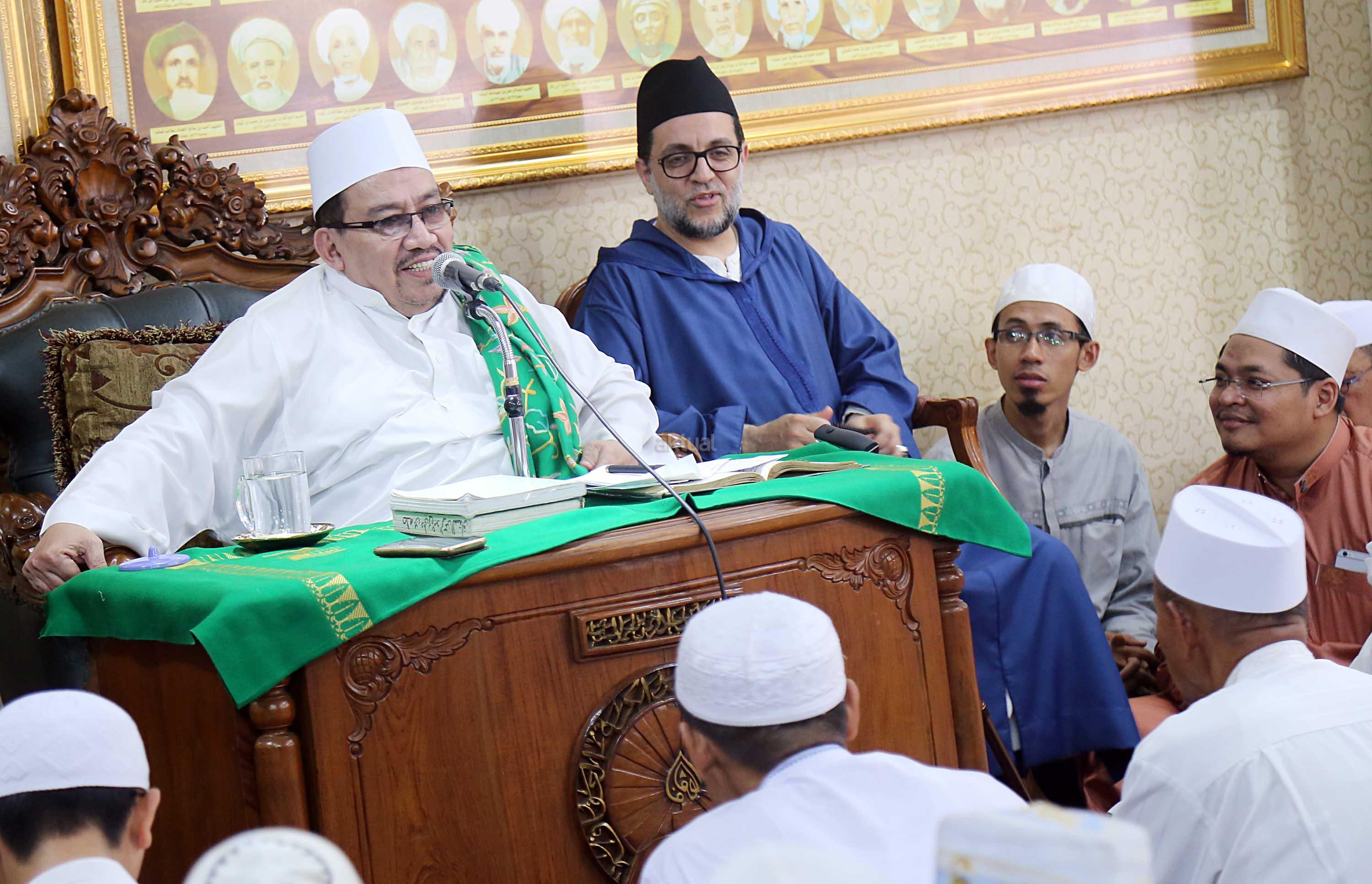 Maulana Syekh Dr Abdul Mun’im bin Abdul Aziz bin Shiddiq Al-Ghumari didampingi Habib Ali bin Abdurrahman Assegaf saat mengisi tausiyah di Majelis ta’lim Al’afaf Lil Habib Ali bin Abdurrahman Assegaf Jalan Tebet Utara, Jakarta Selatan, Sabtu (13/5/2017). AKTUAL/Tino Oktaviano