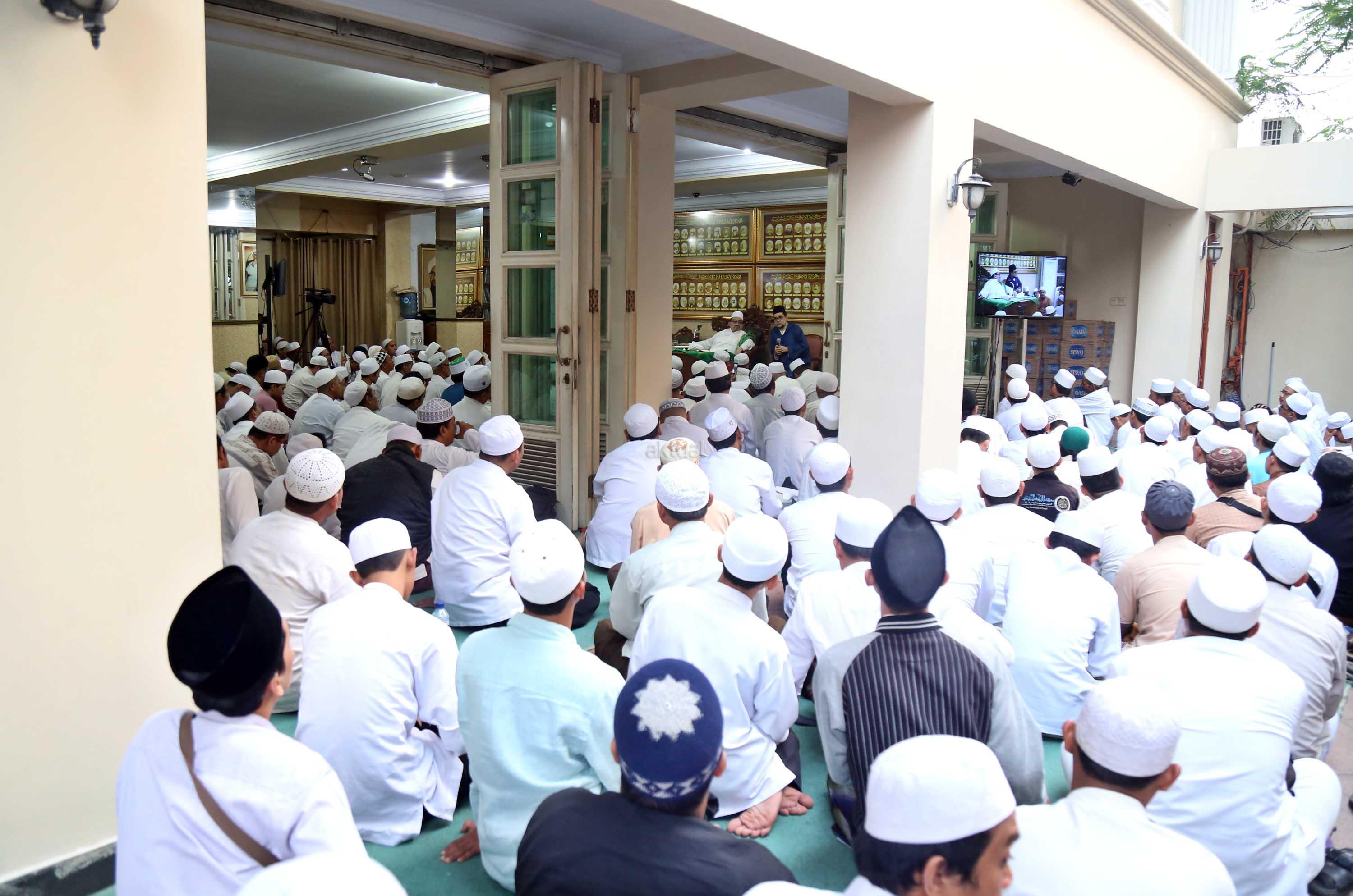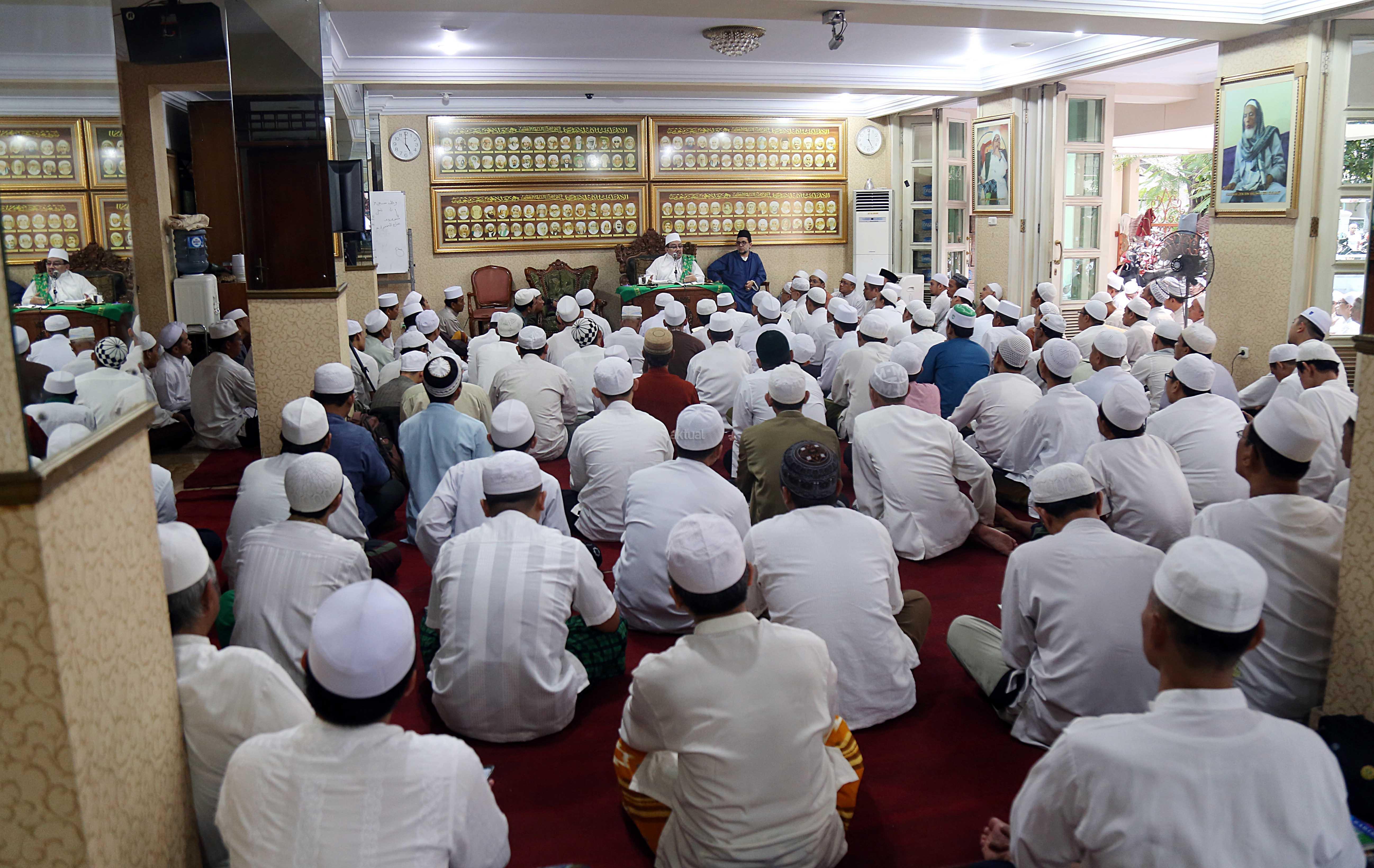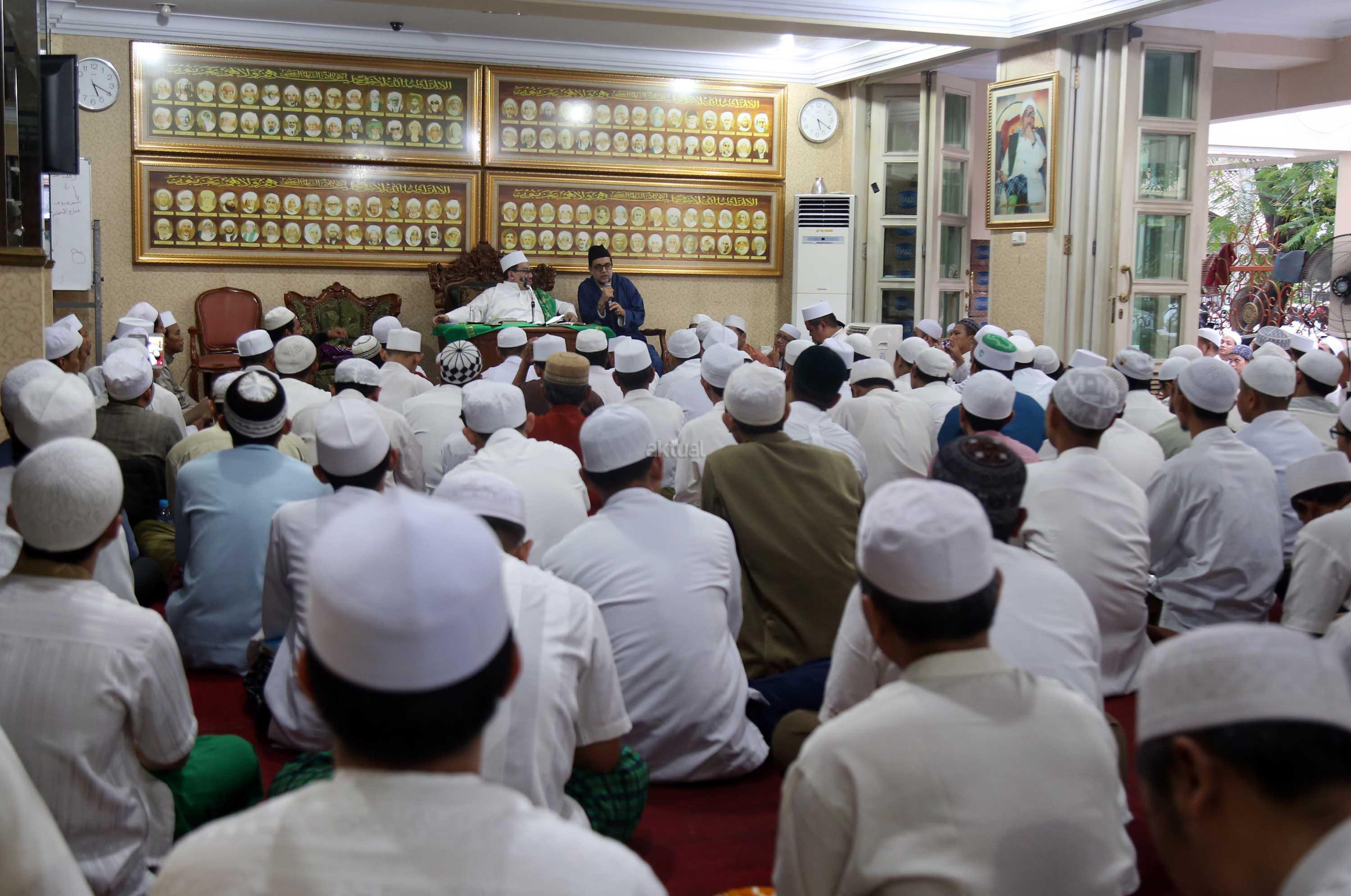 Maulana Syekh Dr Abdul Mun’im bin Abdul Aziz bin Shiddiq Al-Ghumari didampingi Habib Ali bin Abdurrahman Assegaf saat mengisi tausiyah di Majelis ta’lim Al’afaf Lil Habib Ali bin Abdurrahman Assegaf Jalan Tebet Utara, Jakarta Selatan, Sabtu (13/5/2017). AKTUAL/Tino Oktaviano