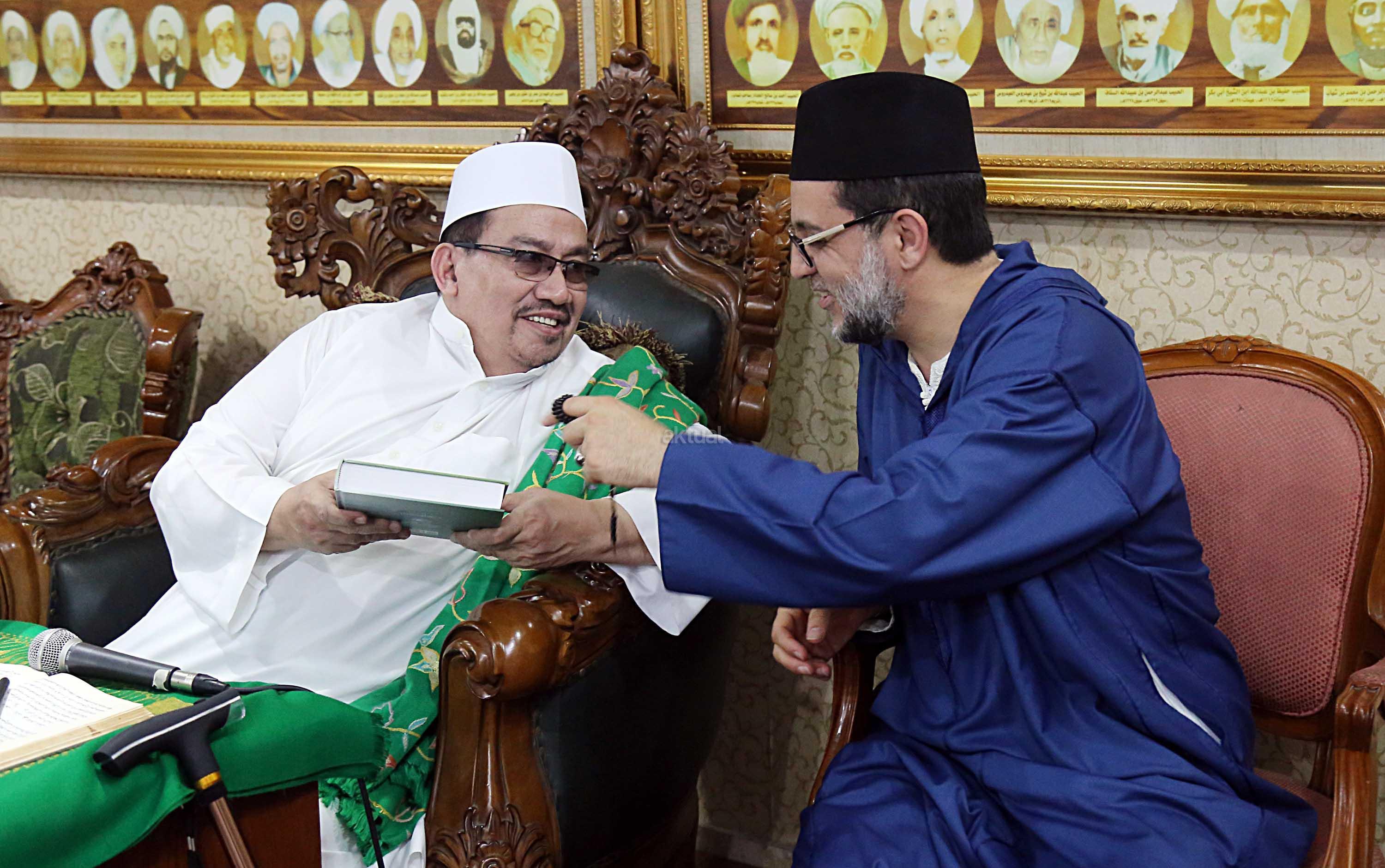 Maulana Syekh Dr Abdul Mun’im bin Abdul Aziz bin Shiddiq Al-Ghumari didampingi Khodim Zawiyah Arraudhah Muhammad Danial Nafis saat silaturahmi ke Majlis ta’lim Al’afaf Lil Habib Ali bin Abdurrahman Assegaf Jalan Tebet Utara, Jakarta Selatan, Sabtu (13/5/2017). Dalam perjalanan Safari Dakwahnya, Mursyid Thariqah Shiddiqiyah Syadziliyah asal Maroko ini berkesempatan untuk memberikan tausiyah agama berkenaan dengan tasawuf dan rasa cinta kepada Allah SWT. AKTUAL/Tino Oktaviano