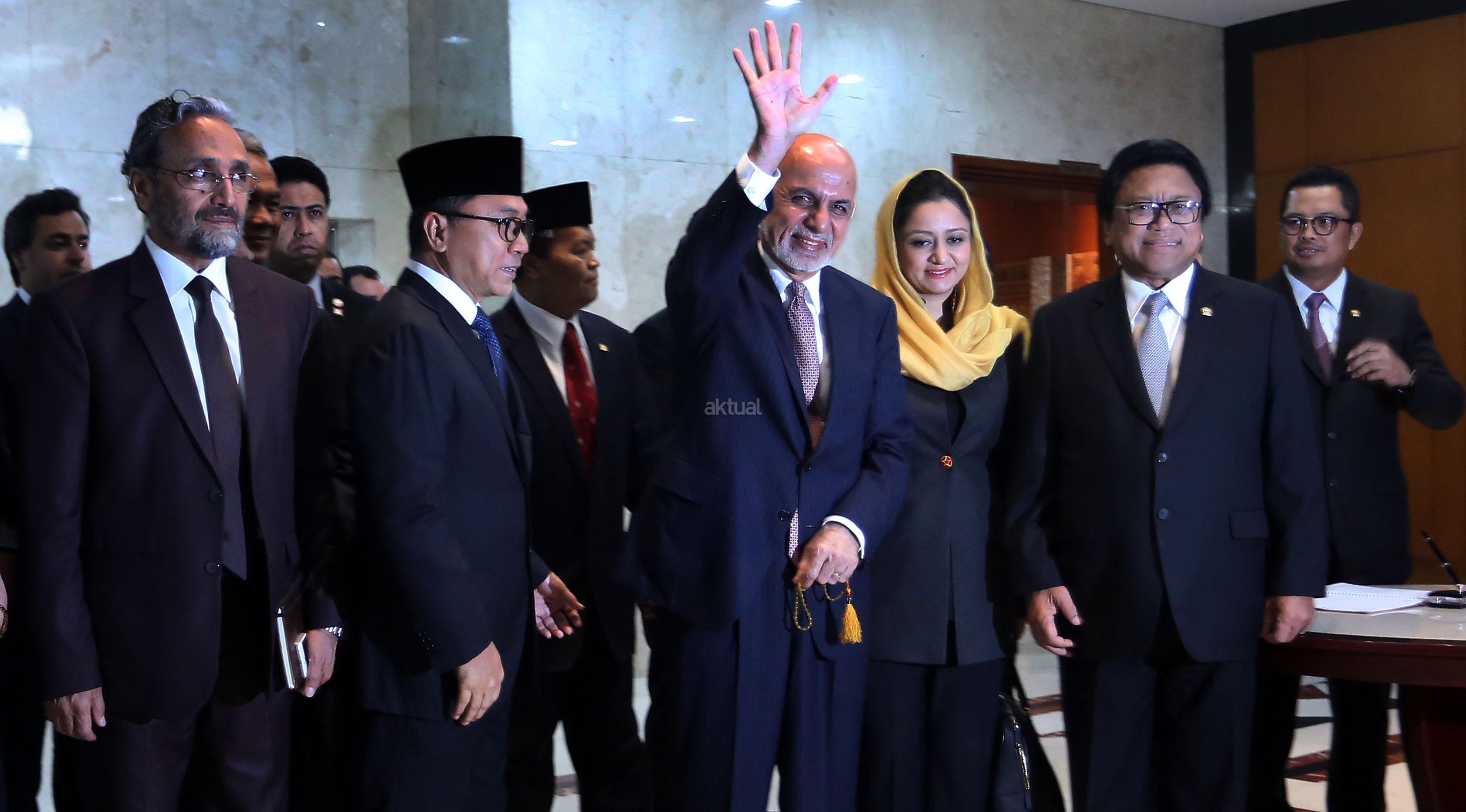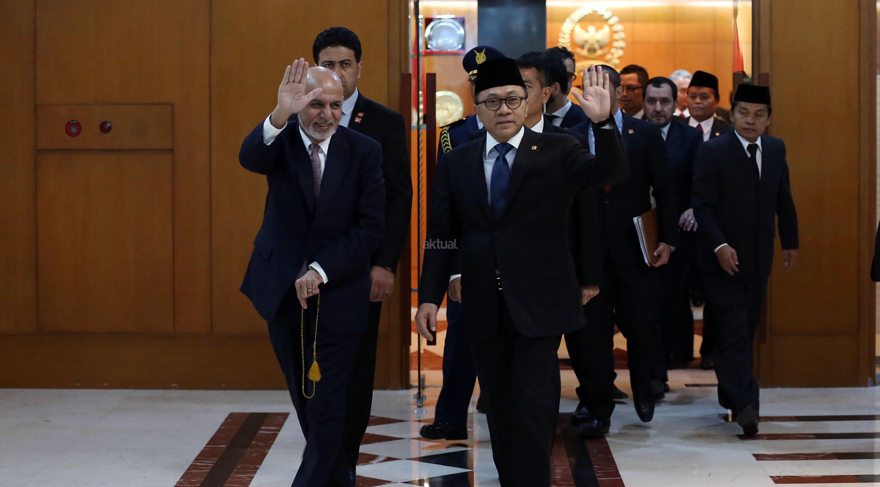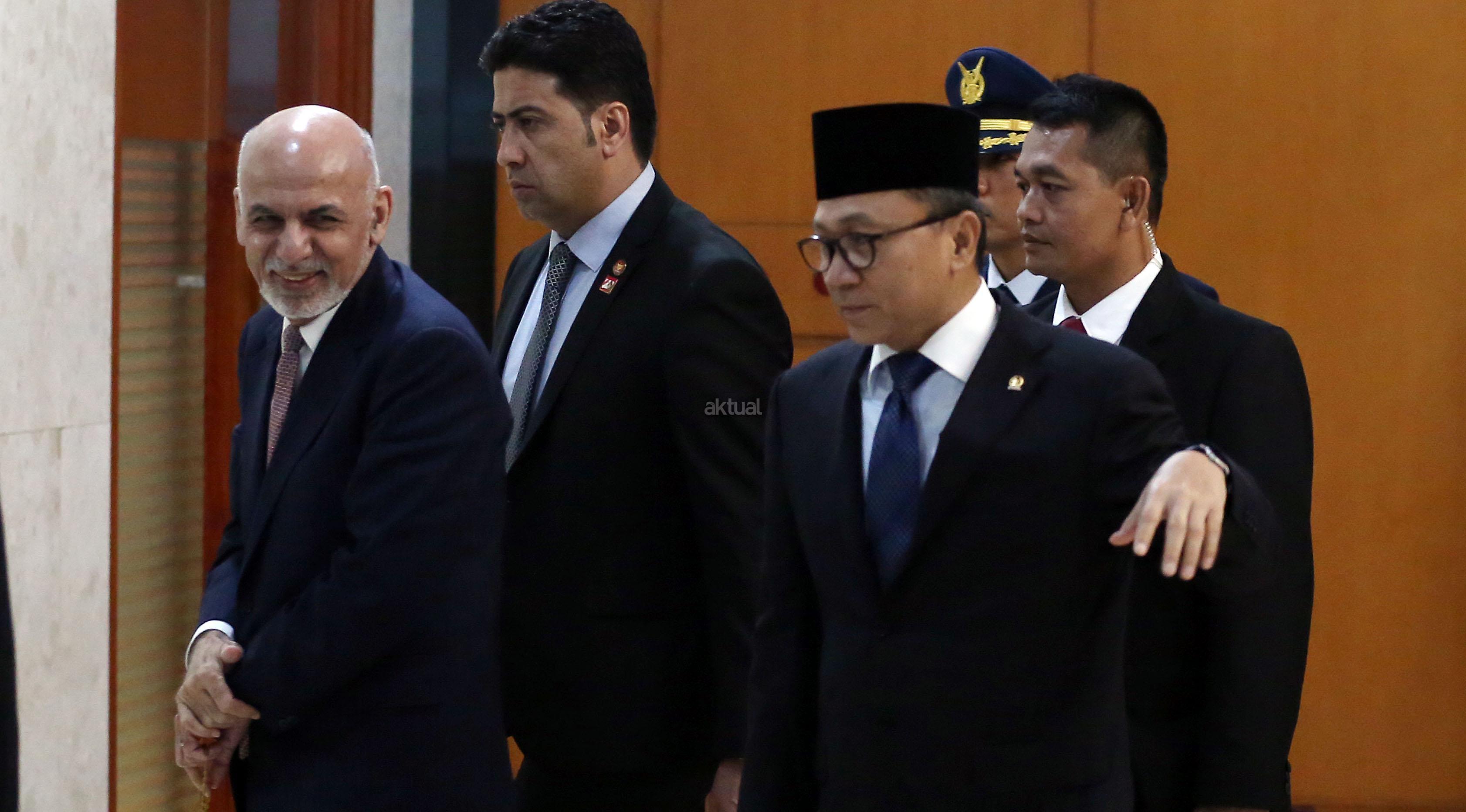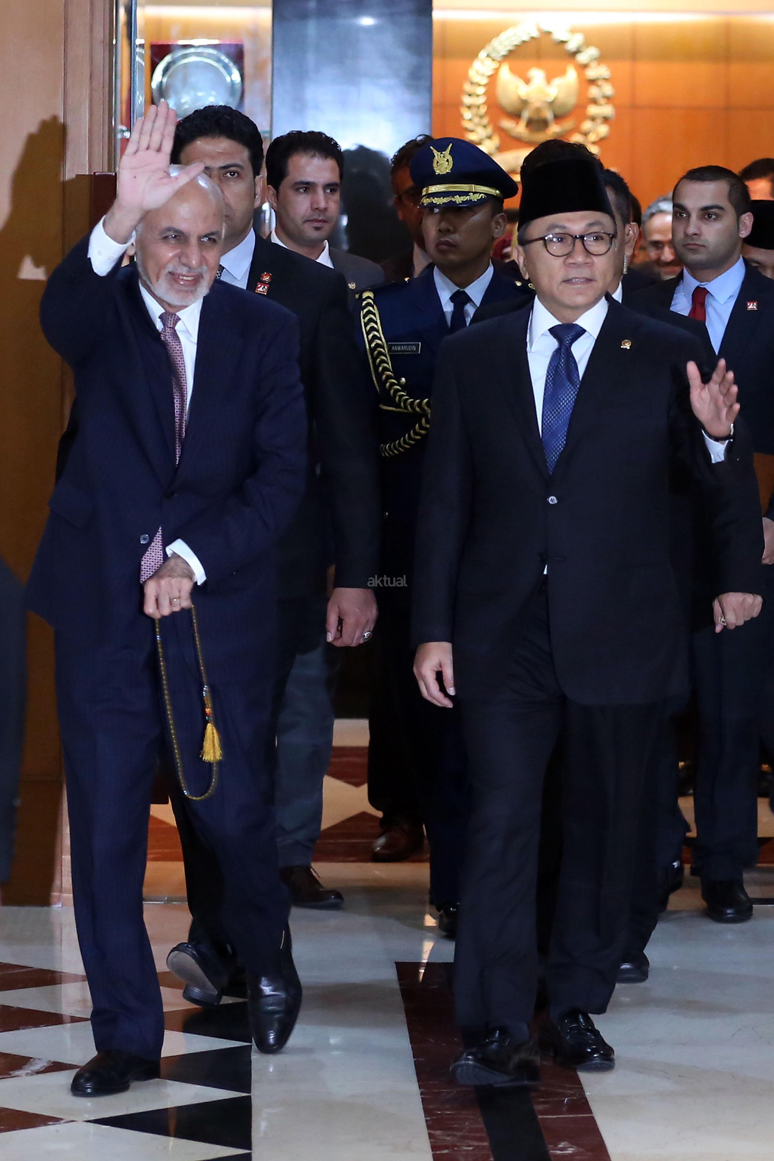 Ketua MPR Zulkifli Hasan berbincang dengan Presiden Afganistan Mohammad Ashraf Ghani seusai melakukan pertemuan di gedung Nusantara V, Komplek Parlemen Senayan, Jakarta, Kamis (6/4). Pertemuan tersebut membahas misi perdamaian serta keamanan dunia melalui penyebaran nilai-nilai Islam. AKTUAL/Tino Oktaviano