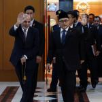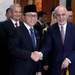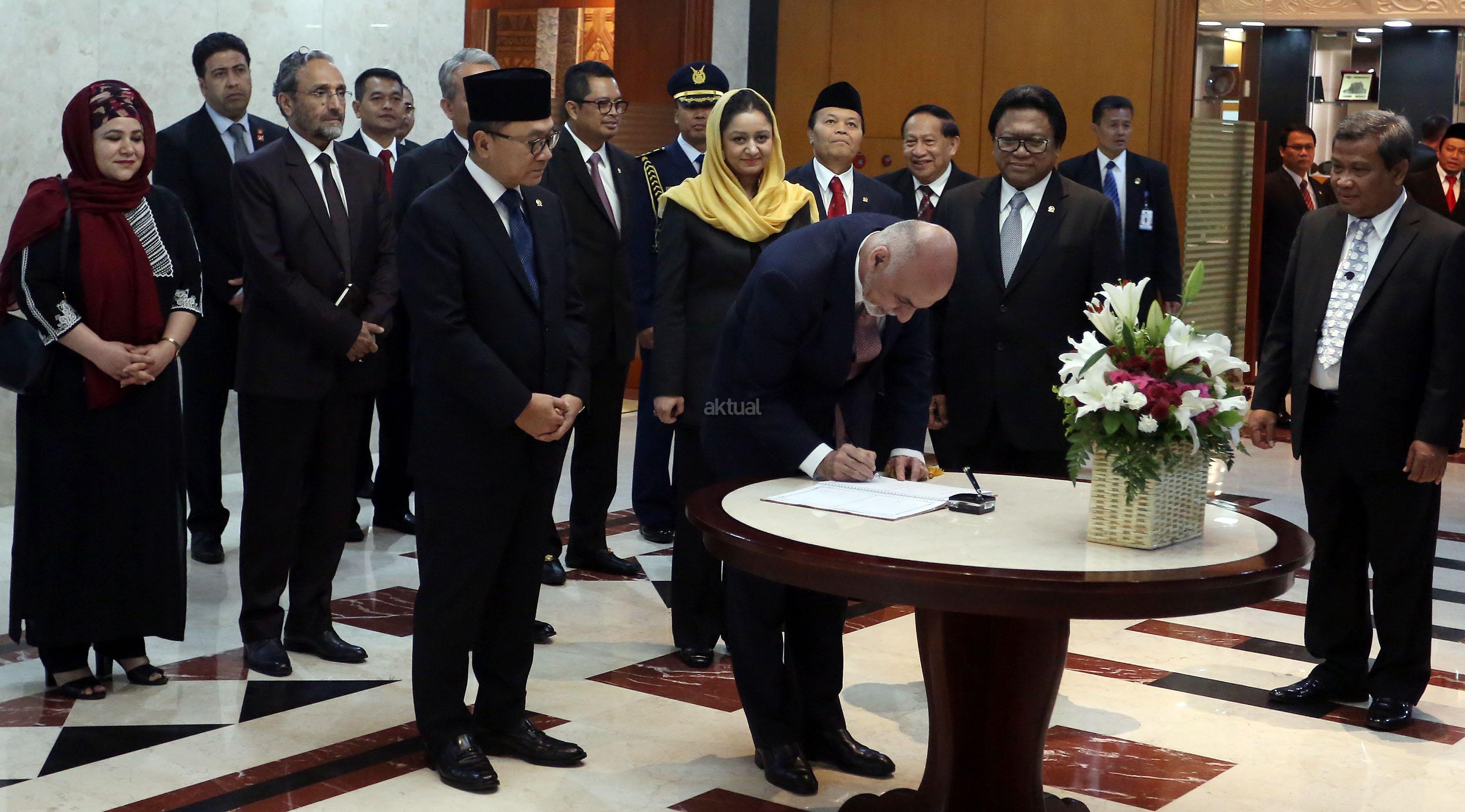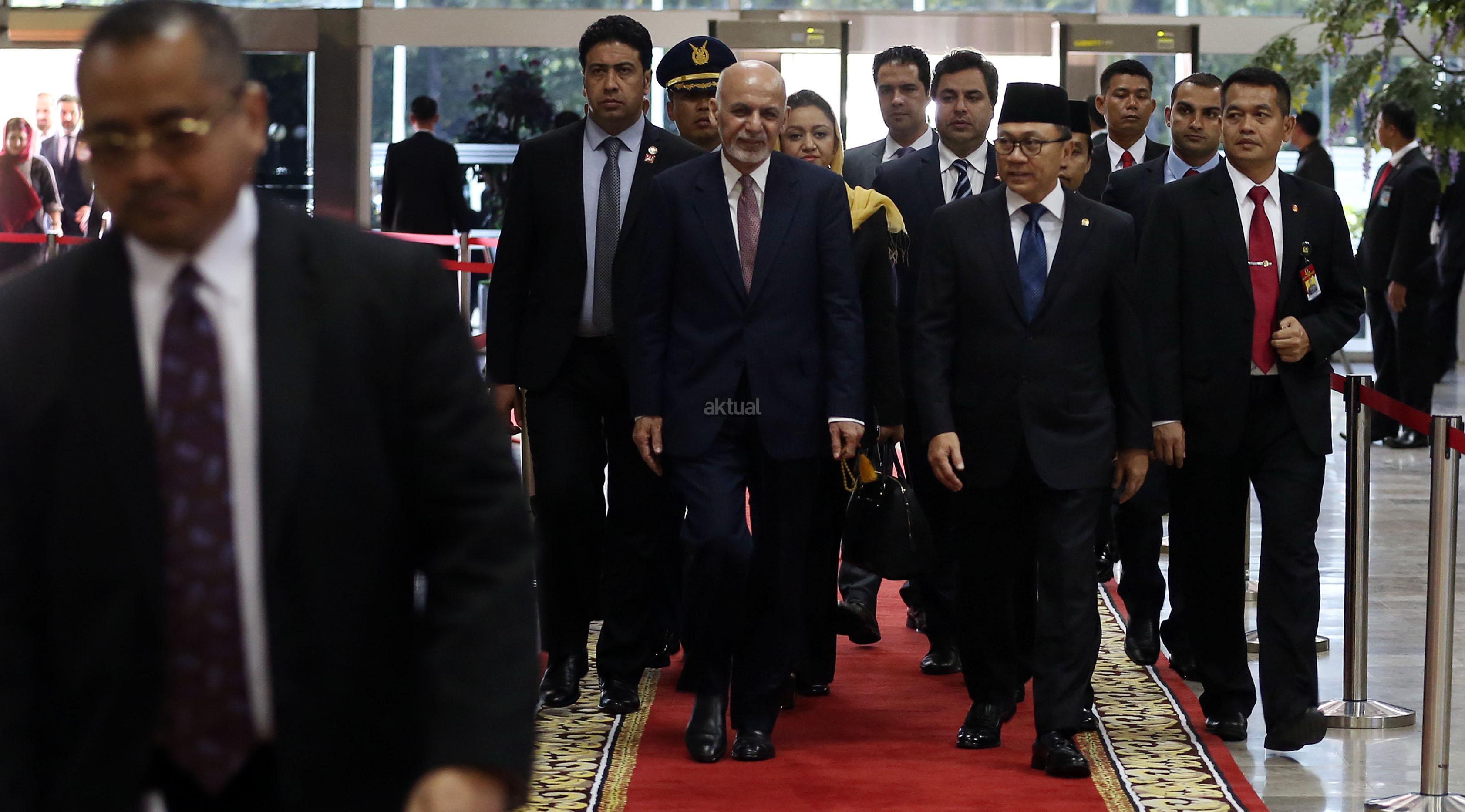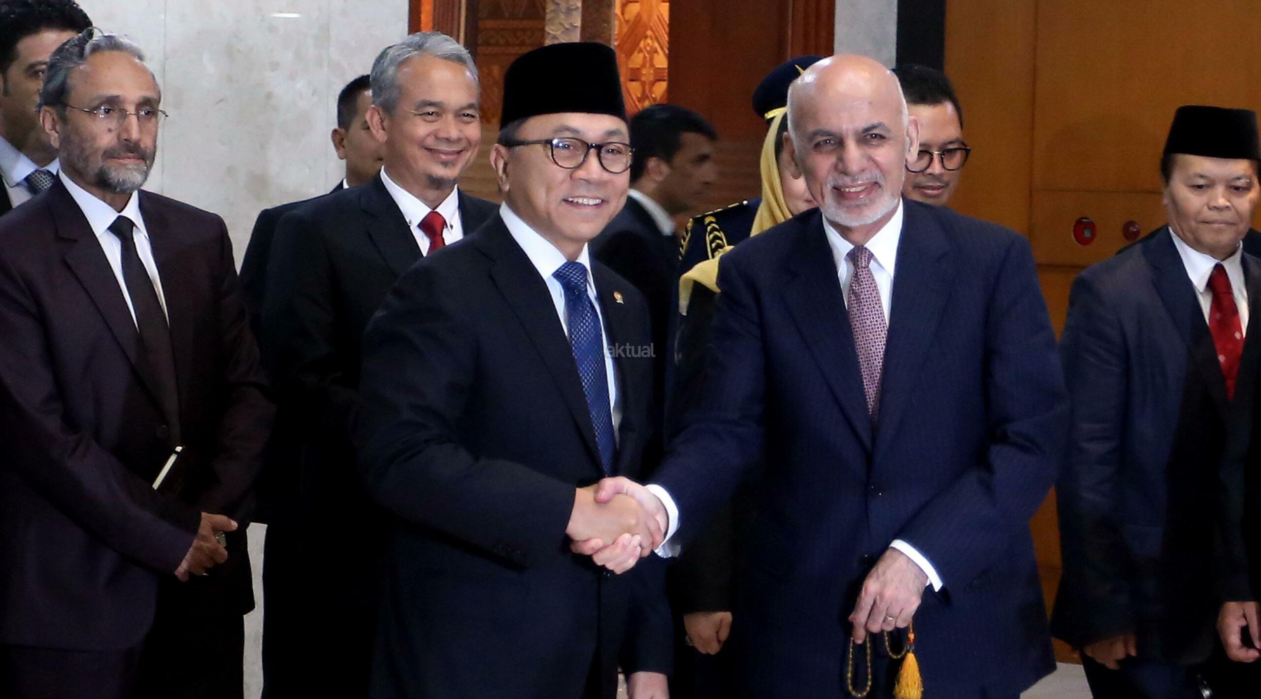 Ketua MPR Zulkifli Hasan berbincang dengan Presiden Afganistan Mohammad Ashraf Ghani seusai melakukan pertemuan di gedung Nusantara V, Komplek Parlemen Senayan, Jakarta, Kamis (6/4). Pertemuan tersebut membahas misi perdamaian serta keamanan dunia melalui penyebaran nilai-nilai Islam. AKTUAL/Tino Oktaviano