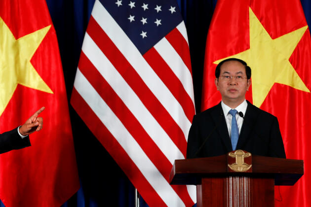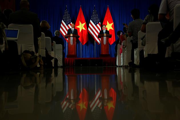 Presiden Amerika Serikat Barack Obama menghadiri konferensi pers bersama Presiden Vietnam Tran Dai Quang di Istana Presiden di Hanoi, Vietnam, Senin (23/5). ANTARA FOTO/REUTERS/Carlos Barria/djo/16