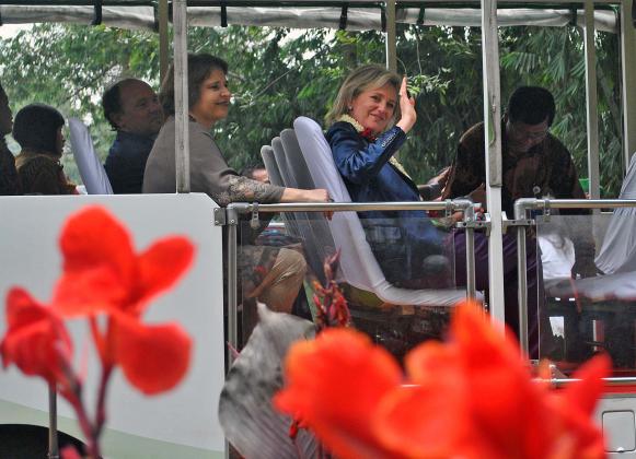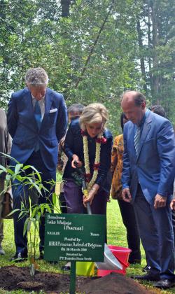 Putri Astrid dari Kerajaan Belgia (tengah) melambaikan tangan kepada wartawan saat mengendarai mobil listrik di jalan Astrid, Kebun Raya Bogor, Jawa Barat, Rabu (16/3). Kunjungan Putri Astrid tersebut merupakan bentuk komitmen kuat Kebun Raya Bogor untuk tetap menjaga hubungan emosional yang sudah terbangun dengan tetap menjaga jalan Astrid dan jajaran bunganya sebagai bagian sejarah hubungan baik antara Indonesia dan Kerajaan Belgia. ANTARA FOTO/Arif Firmansyah/foc/16.